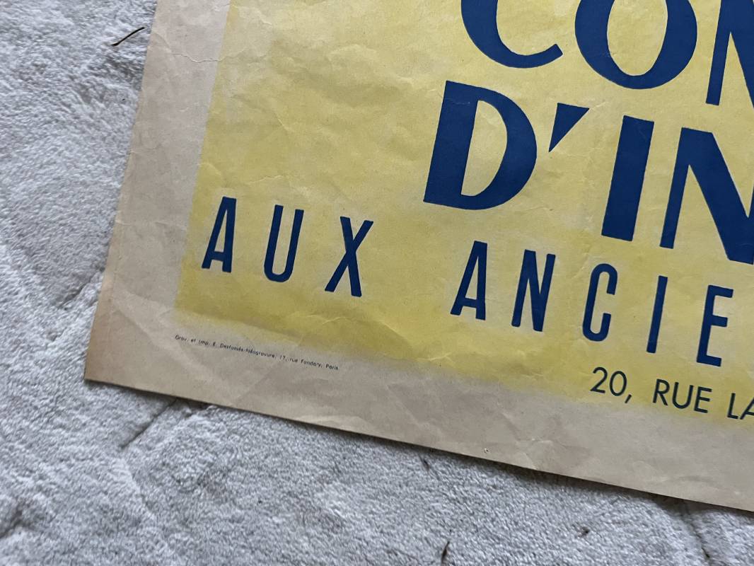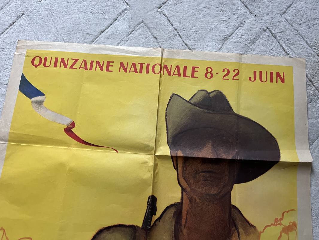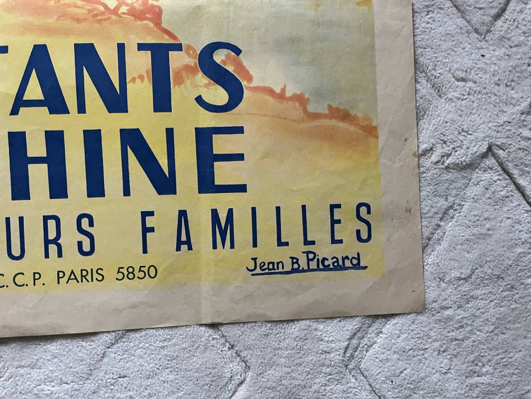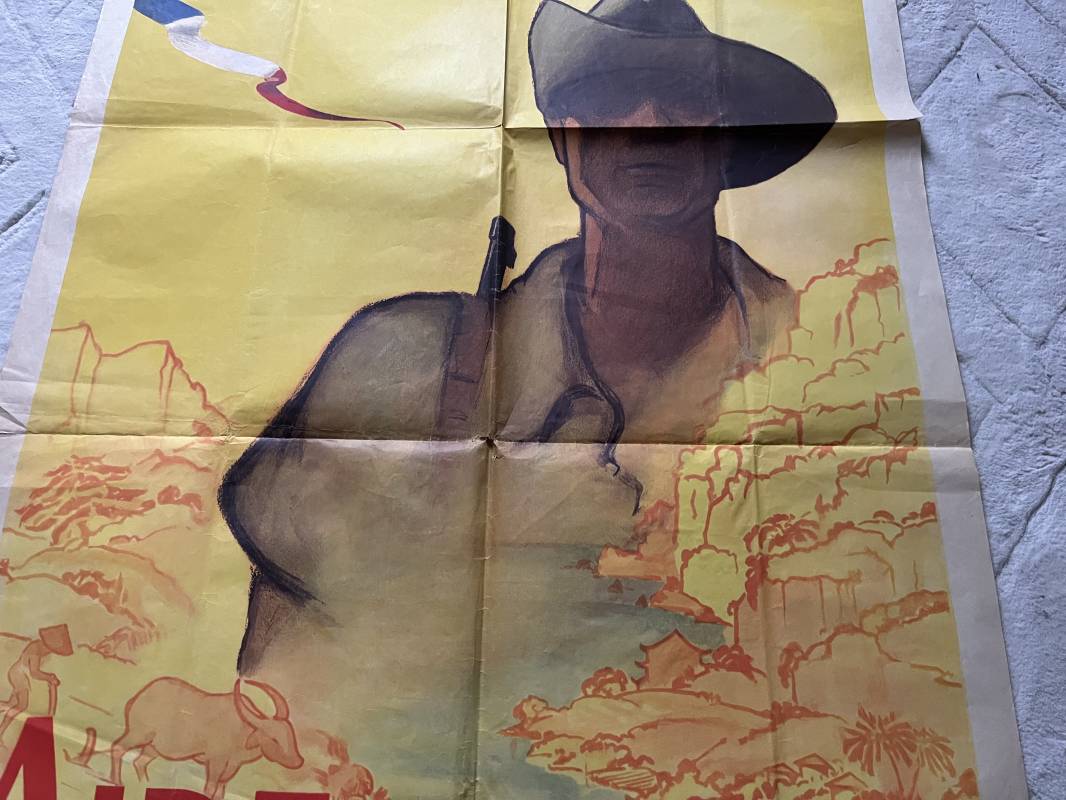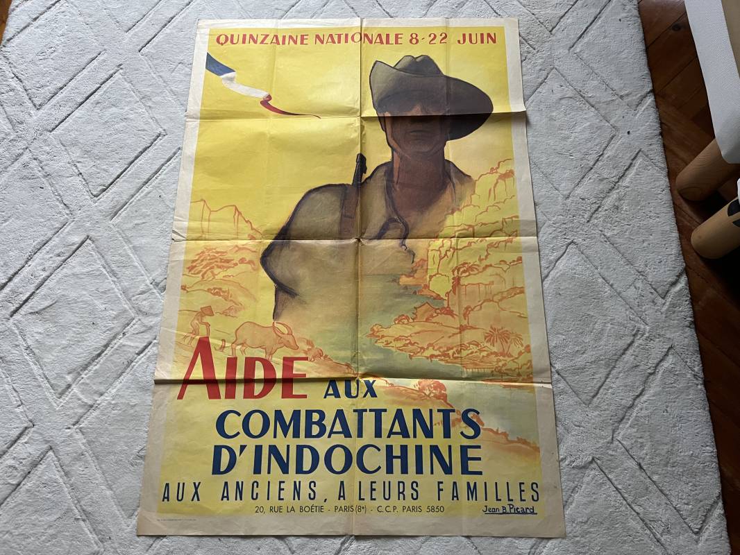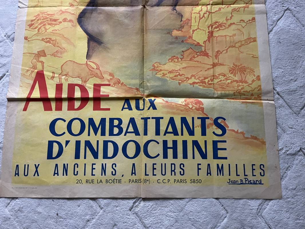 Trés belle affiche ' Aide aux combattants d Indochine' . Affiche pliée non entoilee dimensions 80X120 cm . Parfait état . Dessin signé J.B Picard . Belles couleurs . Parfait état . Sur le derrière timbre postal et nom de la commune d affichage à CHAUSSAN RHONE . Rare affiche Ref 21742