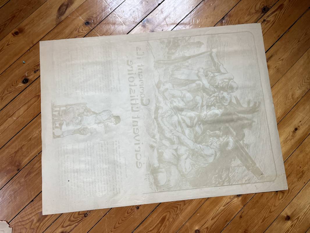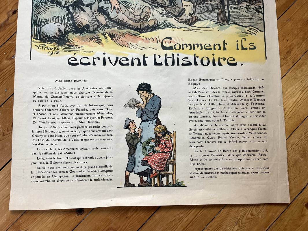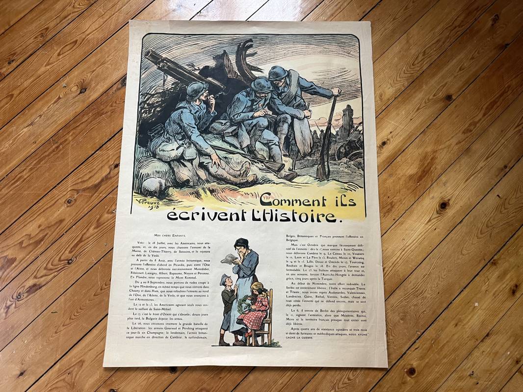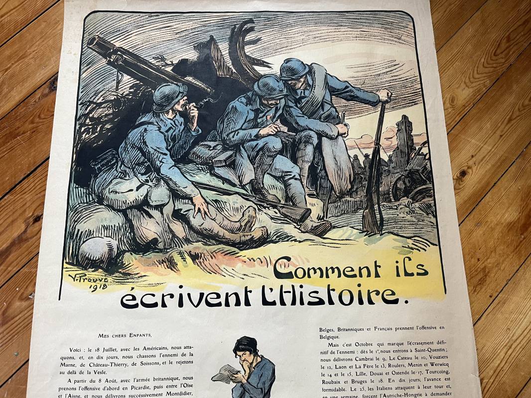 Belle affiche de propagande ' Comment ils écrivent l histoire ' 1918 . Affiche non entoilée Dimensions 55X76 cm . Parfait état . Beau dessin Signé V.Prouvé 1918 Ref 12098