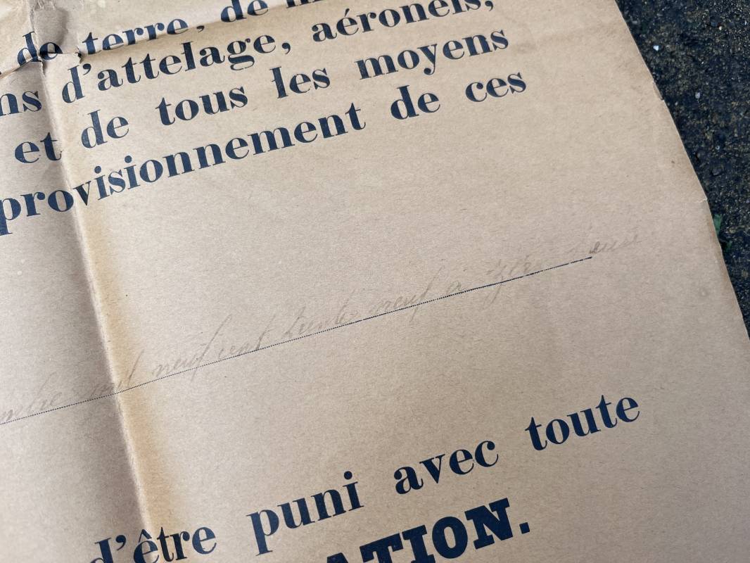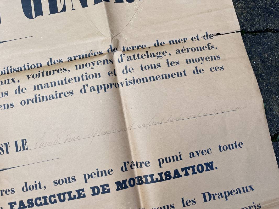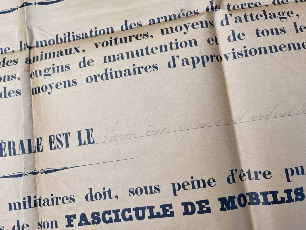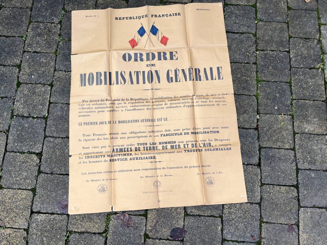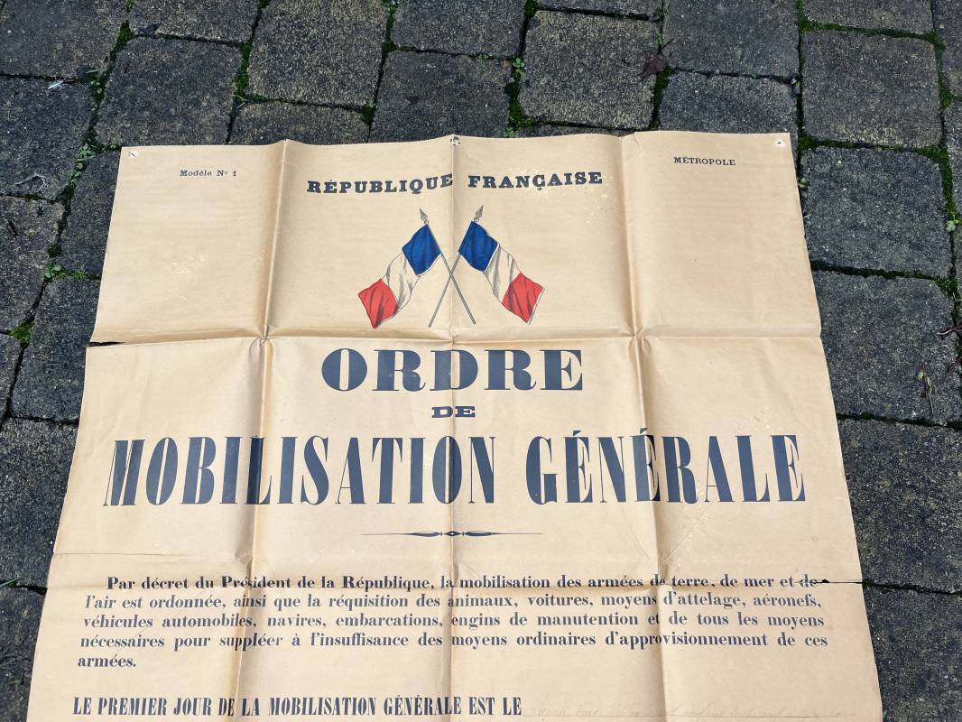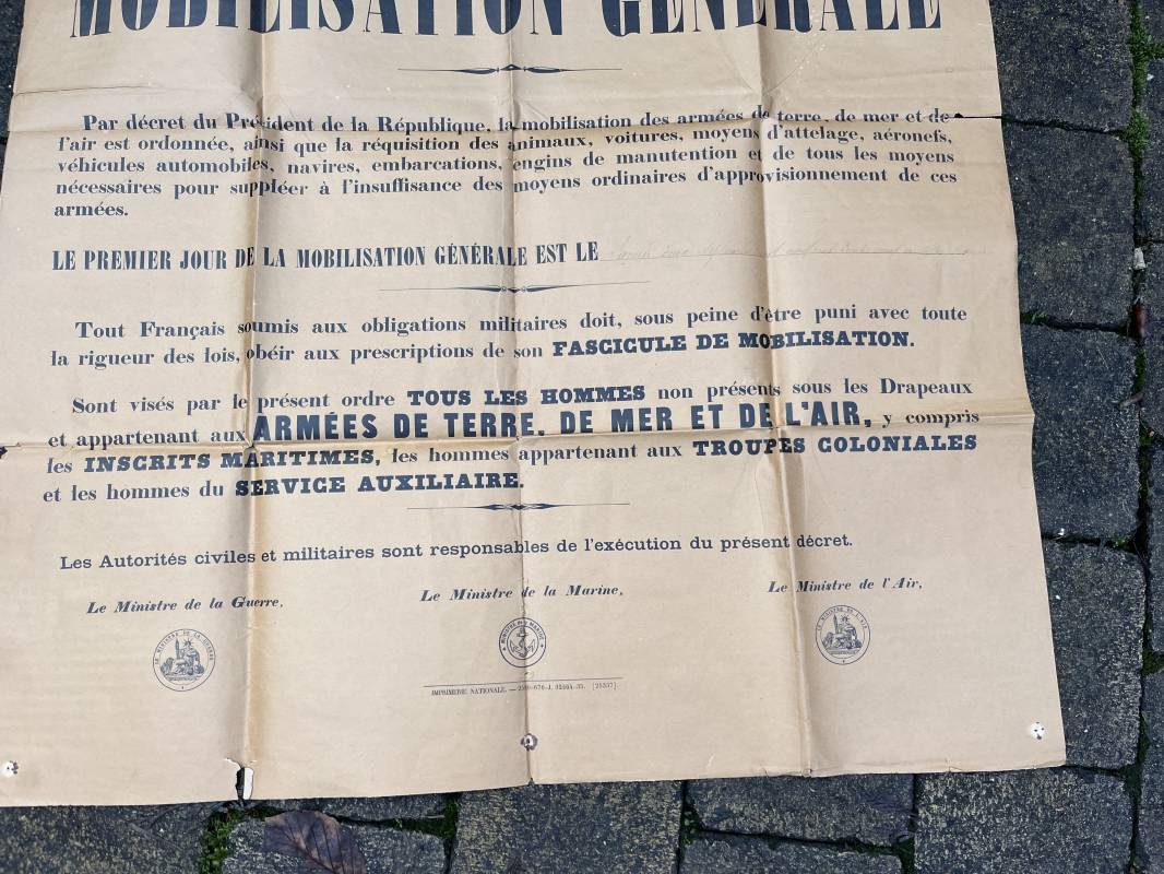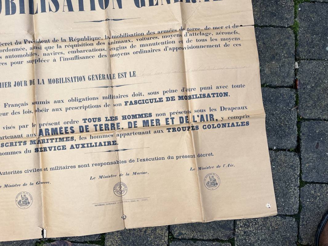 Rare affiche d'ordre de mobilisation générale 1939 . Affiche pliée et non entoilée. .Mention manuscrite 'Samedi 2 septembre 1939 à zero heure ' Belles couleurs . Cette affiche a ete placardée en 1939 a l interieur d une mairie ( trace de punaises sur chaque coins et Mention manuscrite sur le derrière ' interieur mairie ' ) Dimensions 72,5 X 92 cm .Exemplaire totalement intouché . Trés beau document historique méritant un bel encadrement sous verre . Une pièce de musée Ref 18105