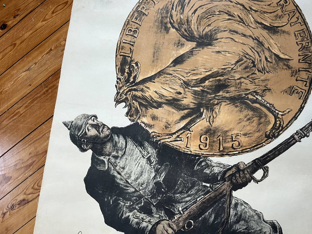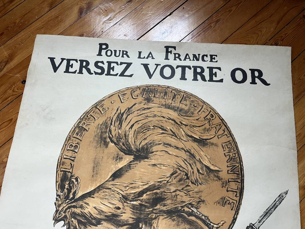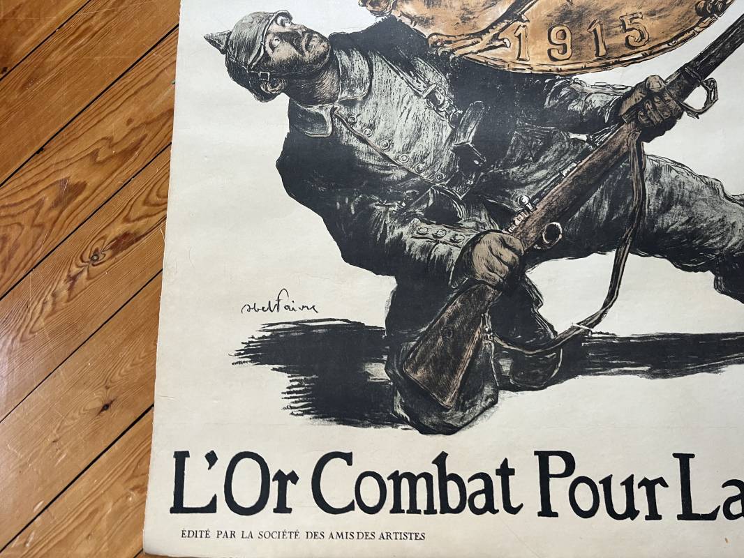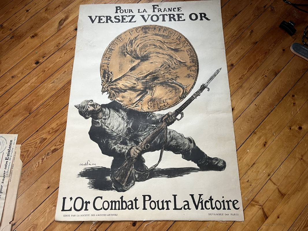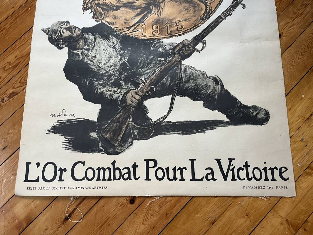 Belle affiche du premier emprunt 1915 ' Versez votre or ' Signée Abelfaivre Affiche non pliée , entoilée , dimensions 80X114 cm Parfait état . Trés belles couleurs . Imprimerie Devambez Paris Une des affiches les plus emblématiques de la Première guerre mondiale Ref 16832