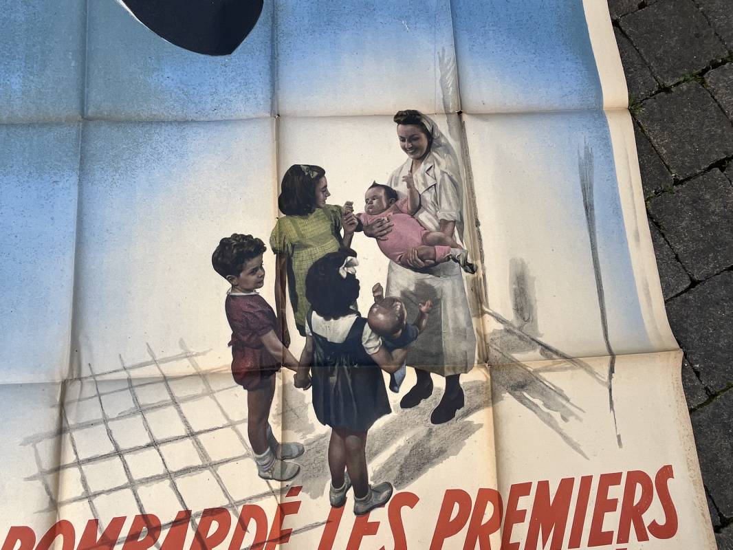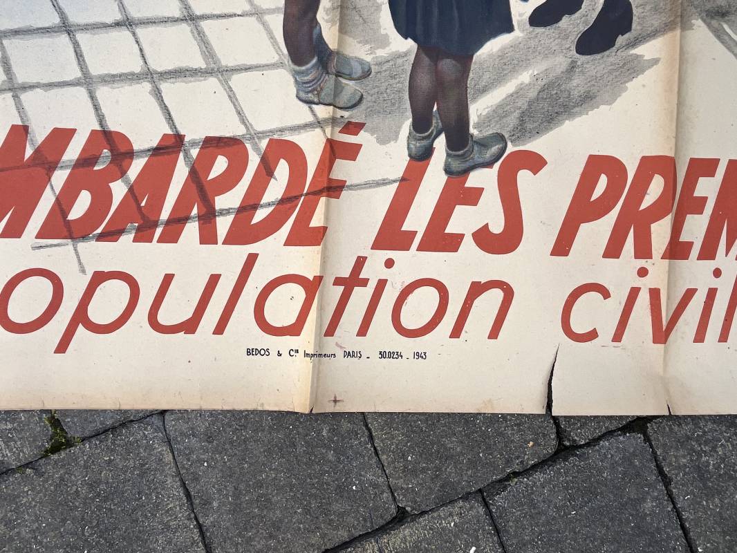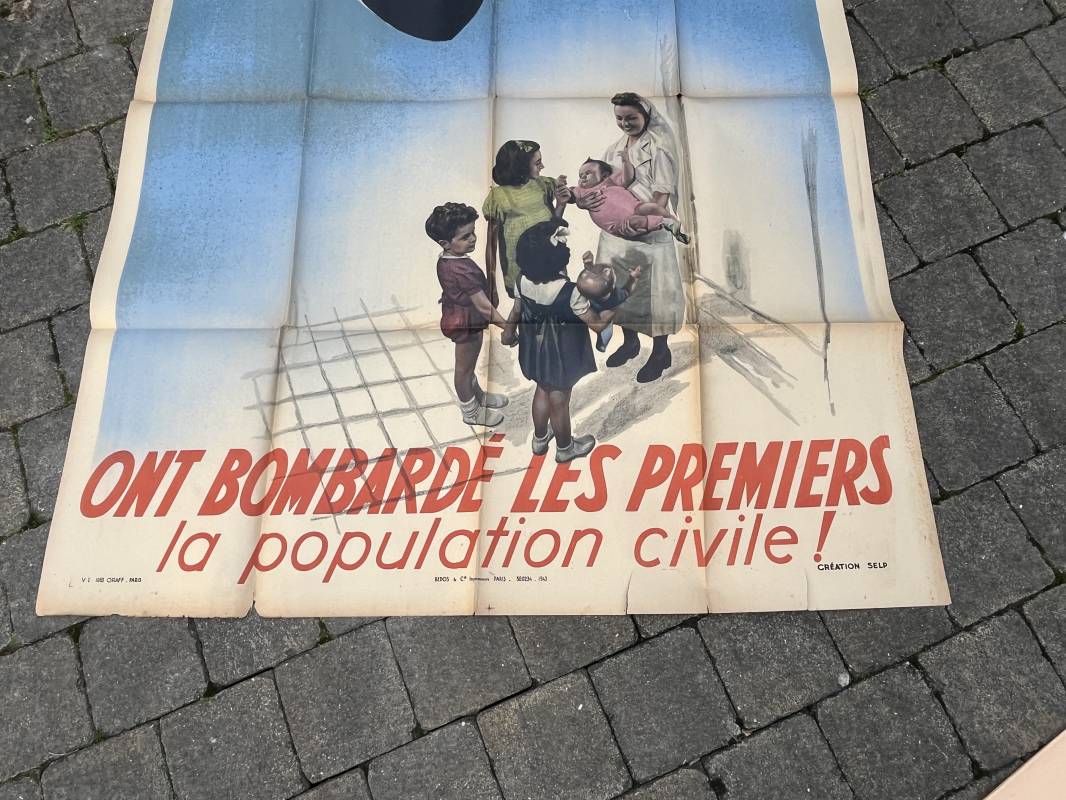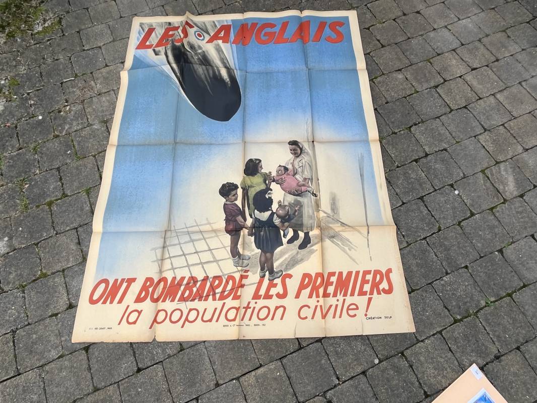 Rare affiche d epropagande Anglophobe ' Les anglais ont bombardé les premiers la population civile ' Affiche non entoilée , pliée , bel état Dimensions 153 X 118 cm . Oraff 1943 Affiche peu courante Ref 17869