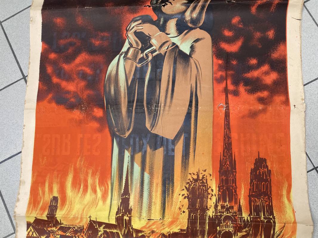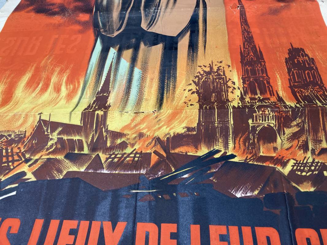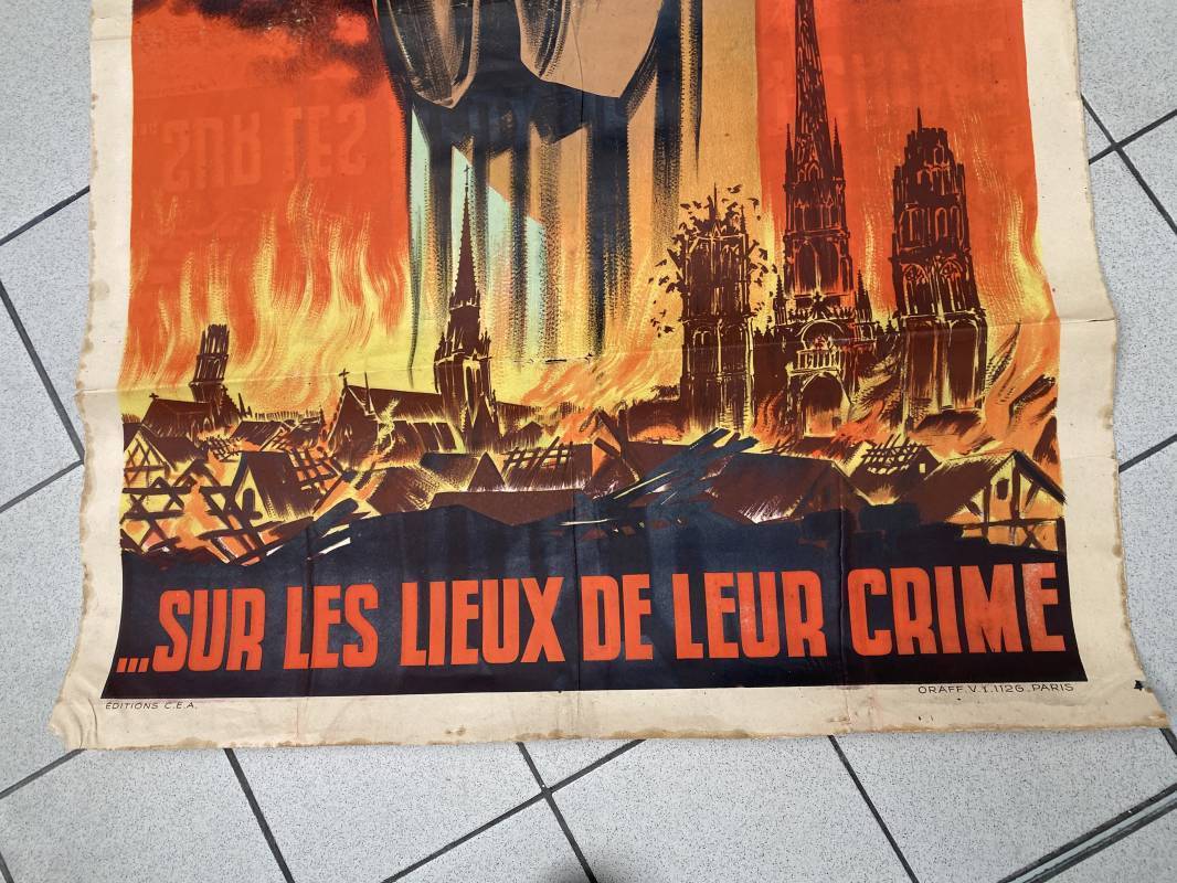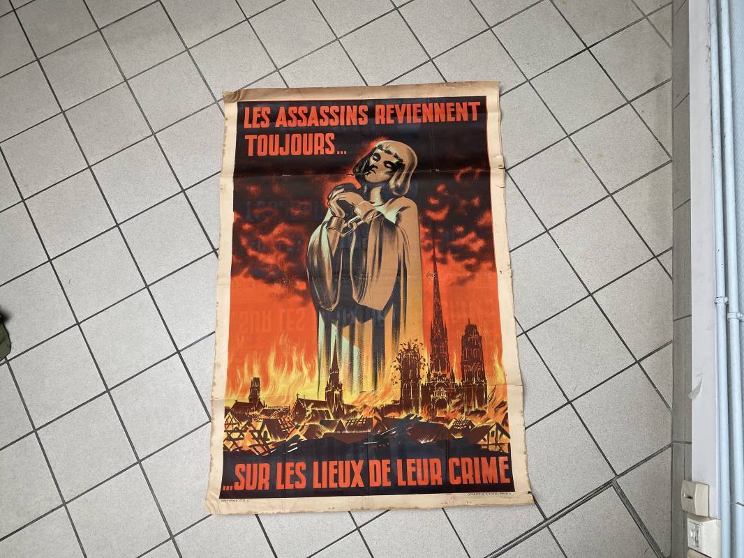 Très rare affiche de propagande anglophobe "Les Assassins reviennent toujours sur les lieux de leur crime". Affiche pliée, non entoilée. Dimensions 117x80cm. Belles couleurs, petites déchirures mais aucun manque. Edition CEA Oraff. Emblématique affiche représentant Jeanne d'Arc brulant sur le buchet à Rouen. Affiche faisant suite aux bombardements sur la ville de Rouen par les Anglais en Avril 1944 (semaine rouge). Rare affiche historique 1944. Ref 18129