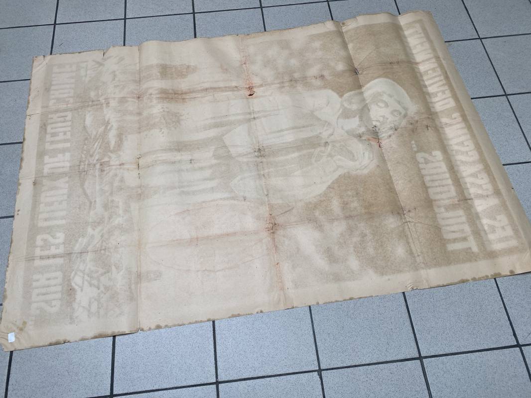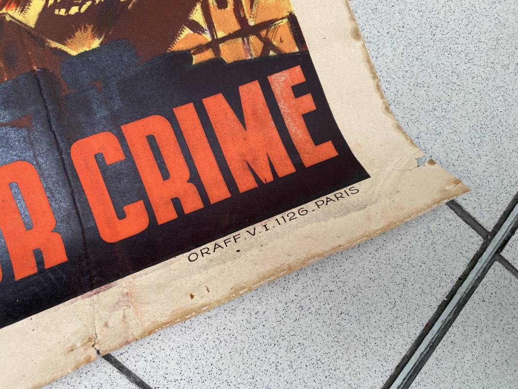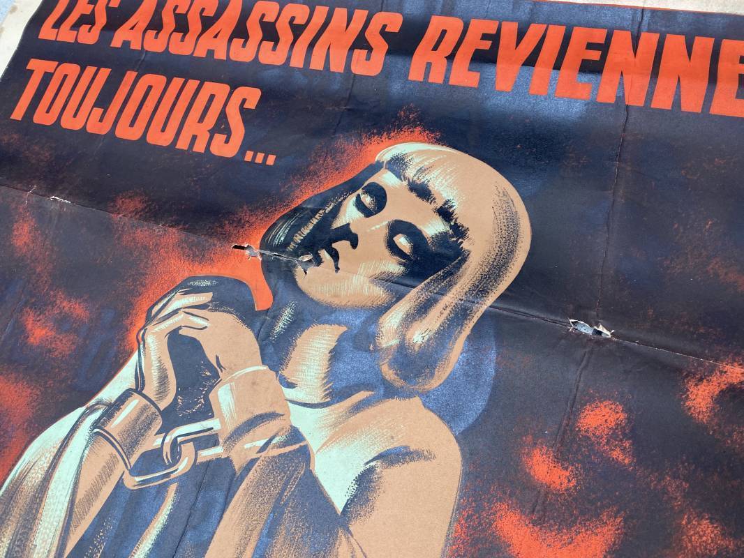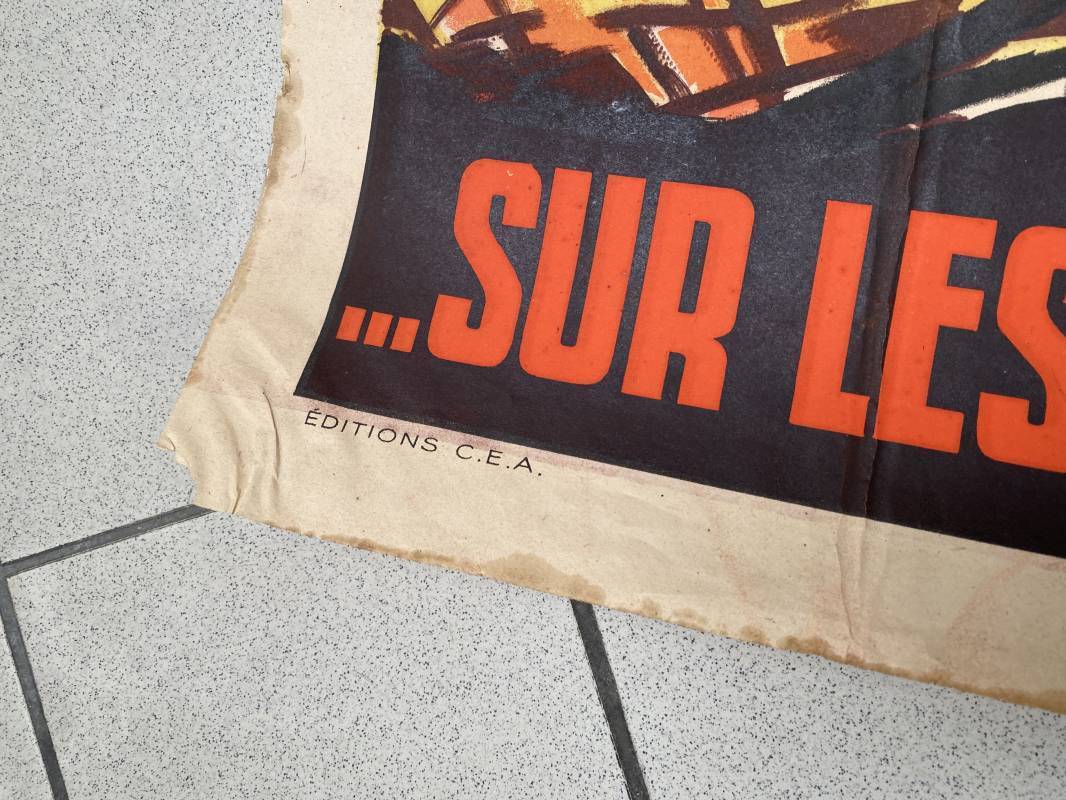 Très rare affiche de propagande anglophobe "Les Assassins reviennent toujours sur les lieux de leur crime". Affiche pliée, non entoilée. Dimensions 117x80cm. Belles couleurs, petites déchirures mais aucun manque. Edition CEA Oraff. Emblématique affiche représentant Jeanne d'Arc brulant sur le buchet à Rouen. Affiche faisant suite aux bombardements sur la ville de Rouen par les Anglais en Avril 1944 (semaine rouge). Rare affiche historique 1944. Ref 18129