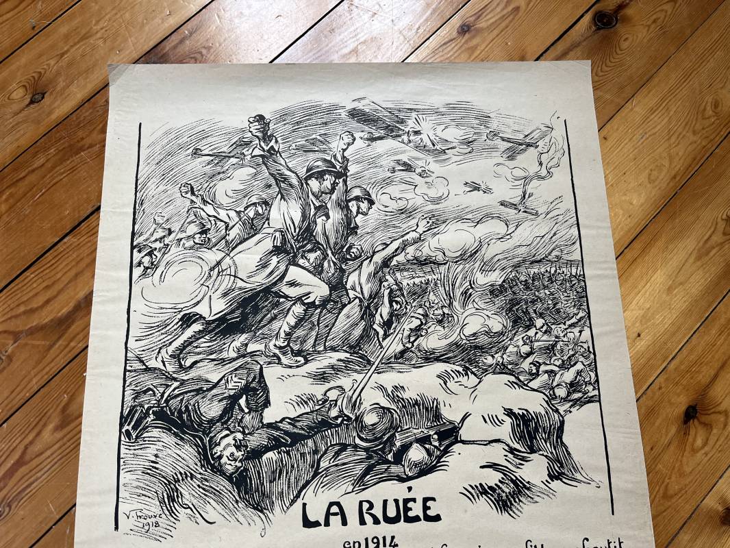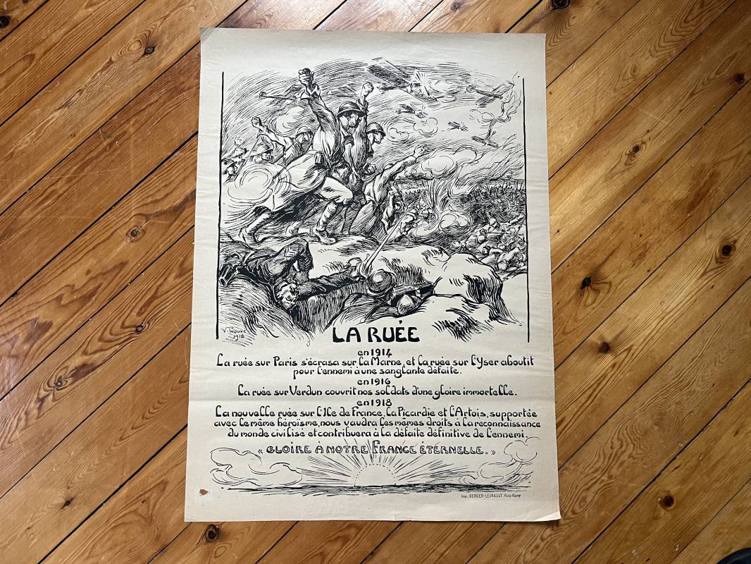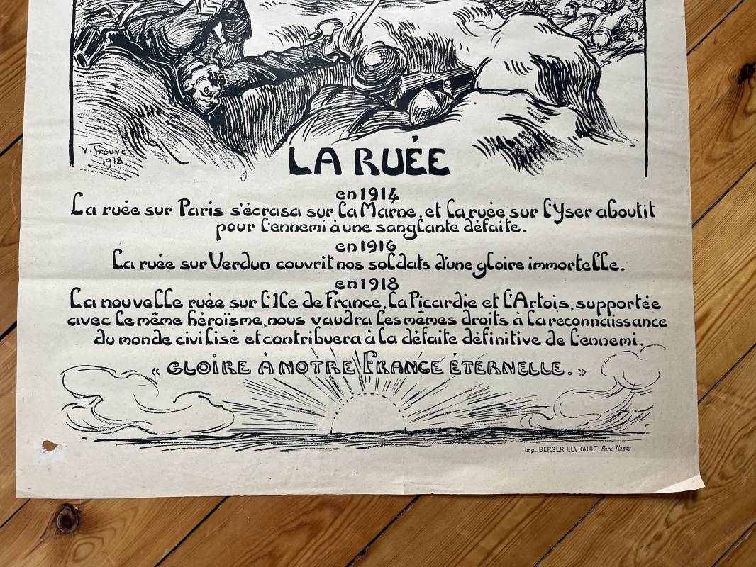 Belle affiche de propagande ' La ruée' 1918 . Affiche non entoilée Dimensions 47X65 cm . Parfait état . Beau dessin Signé V.Prouvé 1918 Imprimerie Berger Levrault Paris Nancy Ref 11254
