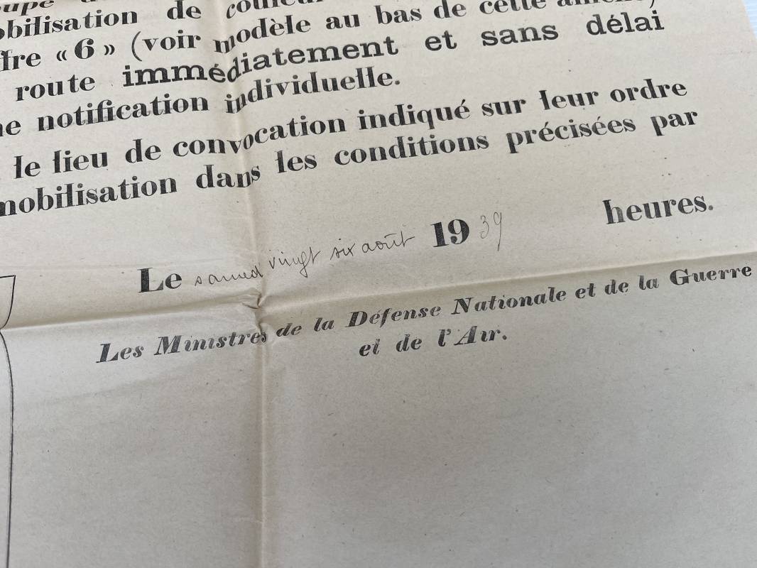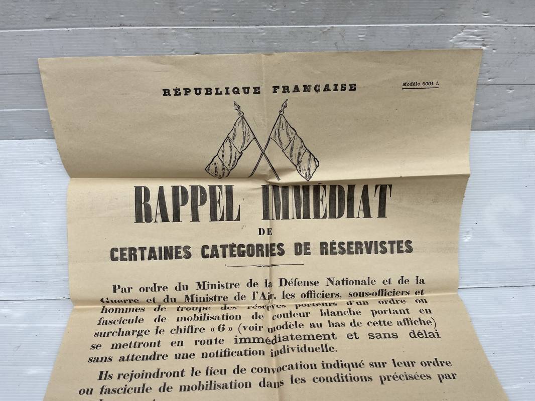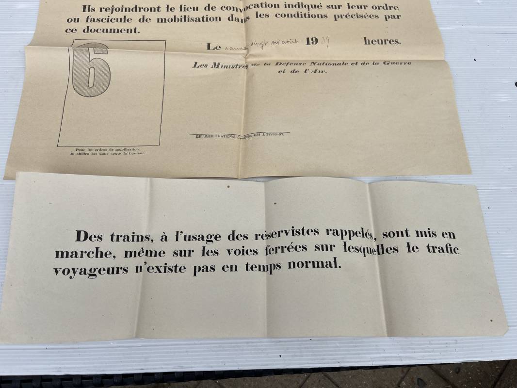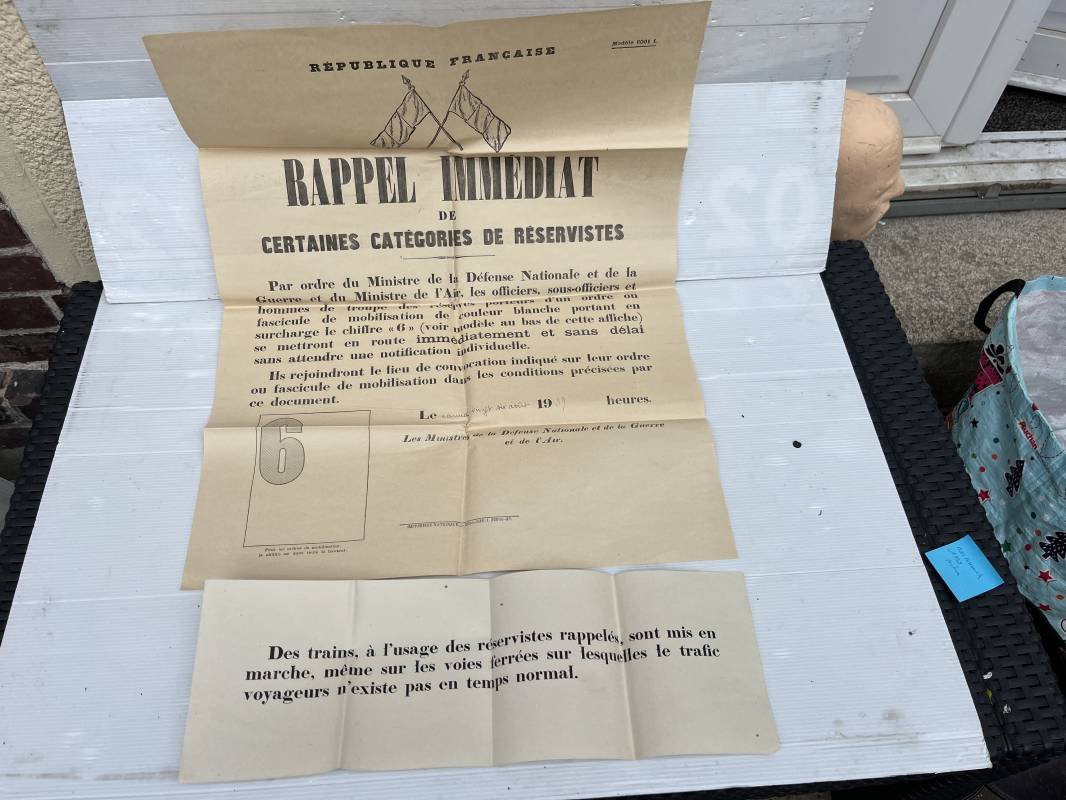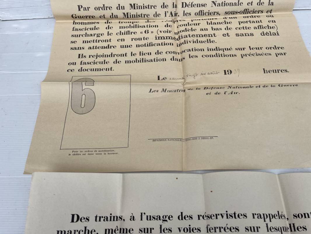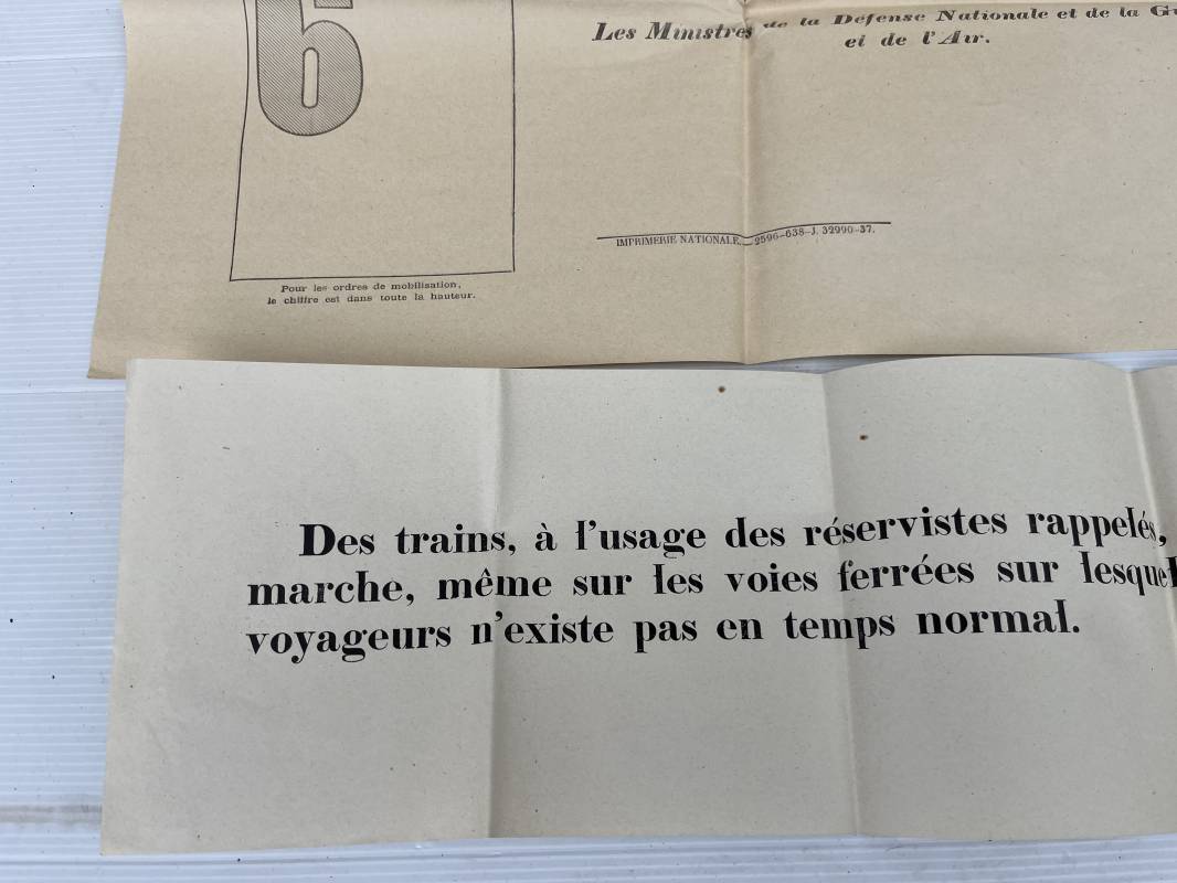 Rare affiche de rappel immediat des réservistes ( Modele 6001 f ) . Affiche pliée non entoilée dimensions 50X64 cm Parfait état . Mention manuscrite d origine 'Samedi 26 Aout 1939 ' . Petite affichette dimensions 16X47 cm , pliée a l usage des fonctionnement des trains des reservistes . Rare document historique et préambule de la mobilisation générale du 2 septembre 1939 Ref 18104