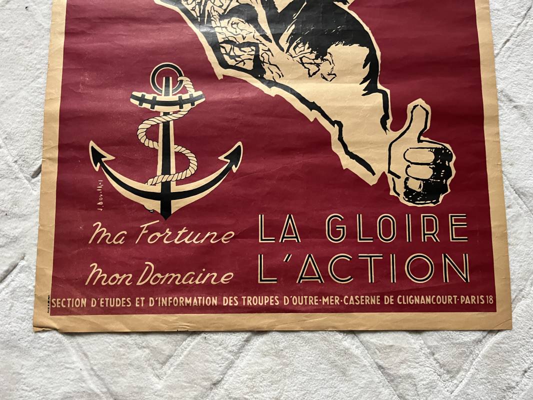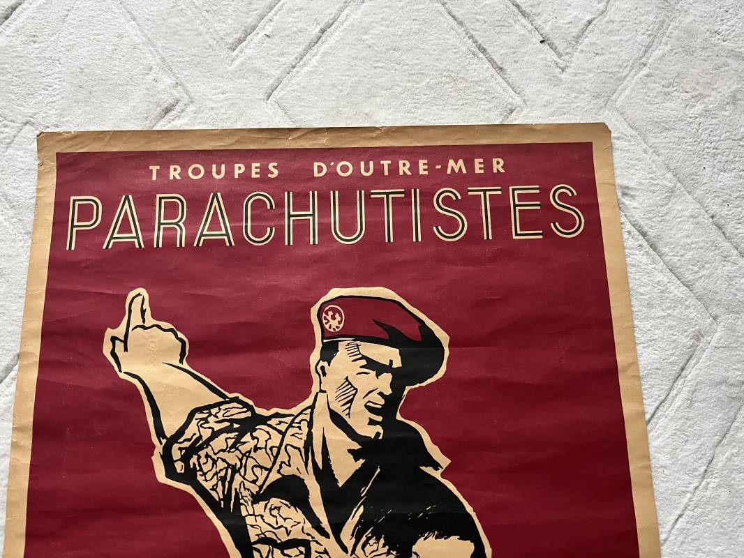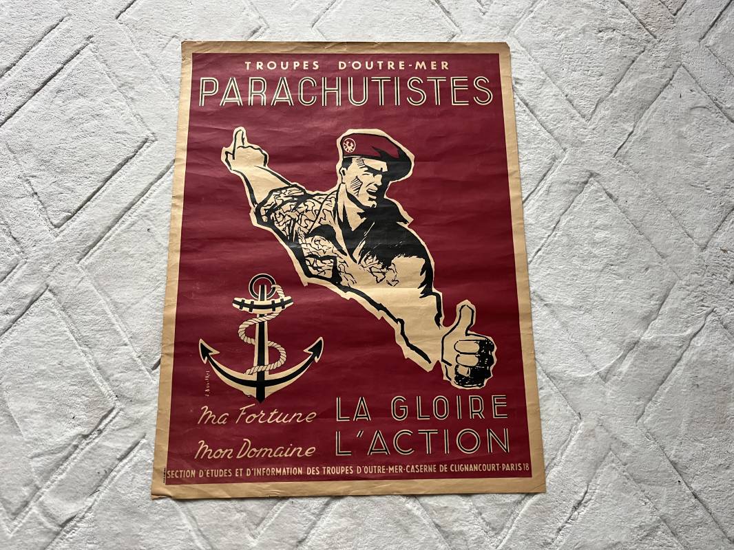 Rare affiche de recrutement des Parachutistes coloniaux .Affiche non plièe et non entoilée . ' Ma fortune , mon domaine , La gloire L Action' . Affiche emblématique des parachutistes coloniaux .Grande Ancre des troupes coloniales . Dimensions 75x58cm Belles couleurs et trés bel état. Rare exemplaire tres peu courant Ref 19693
