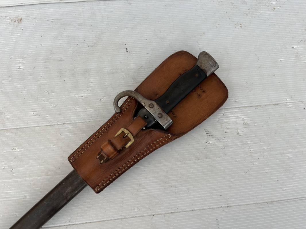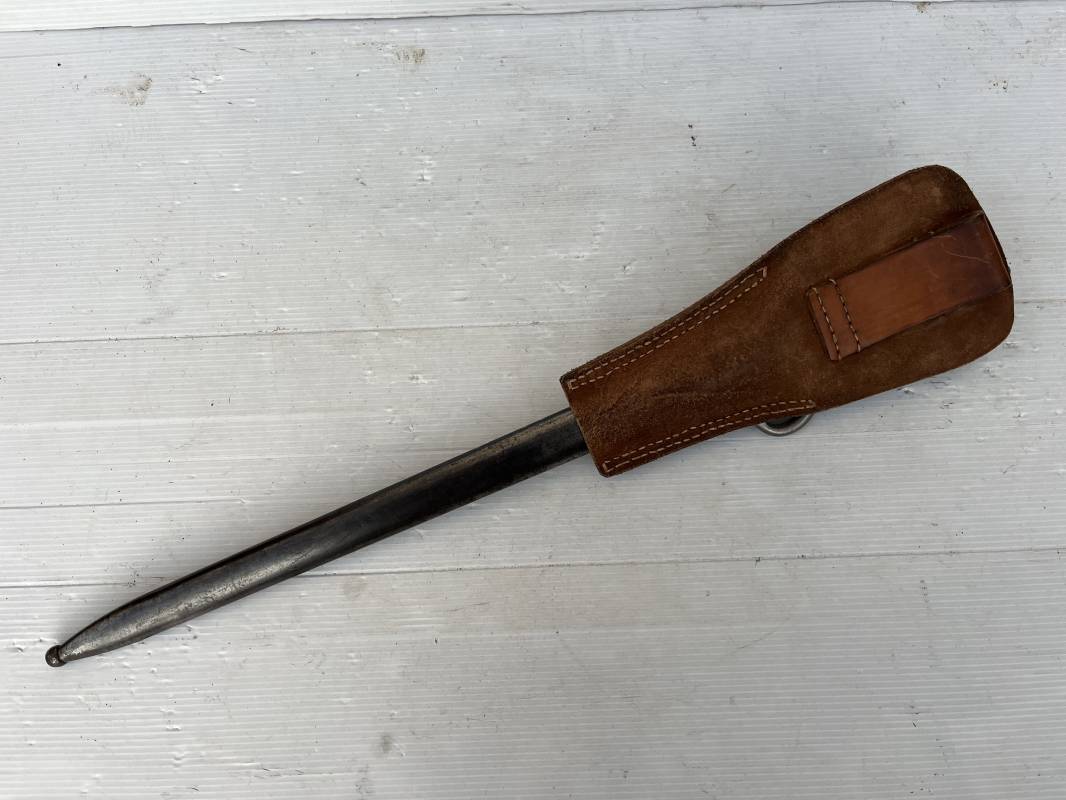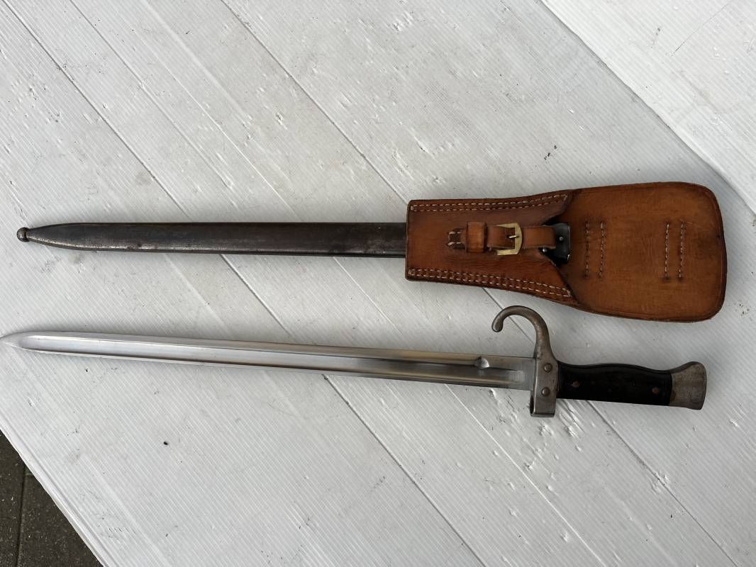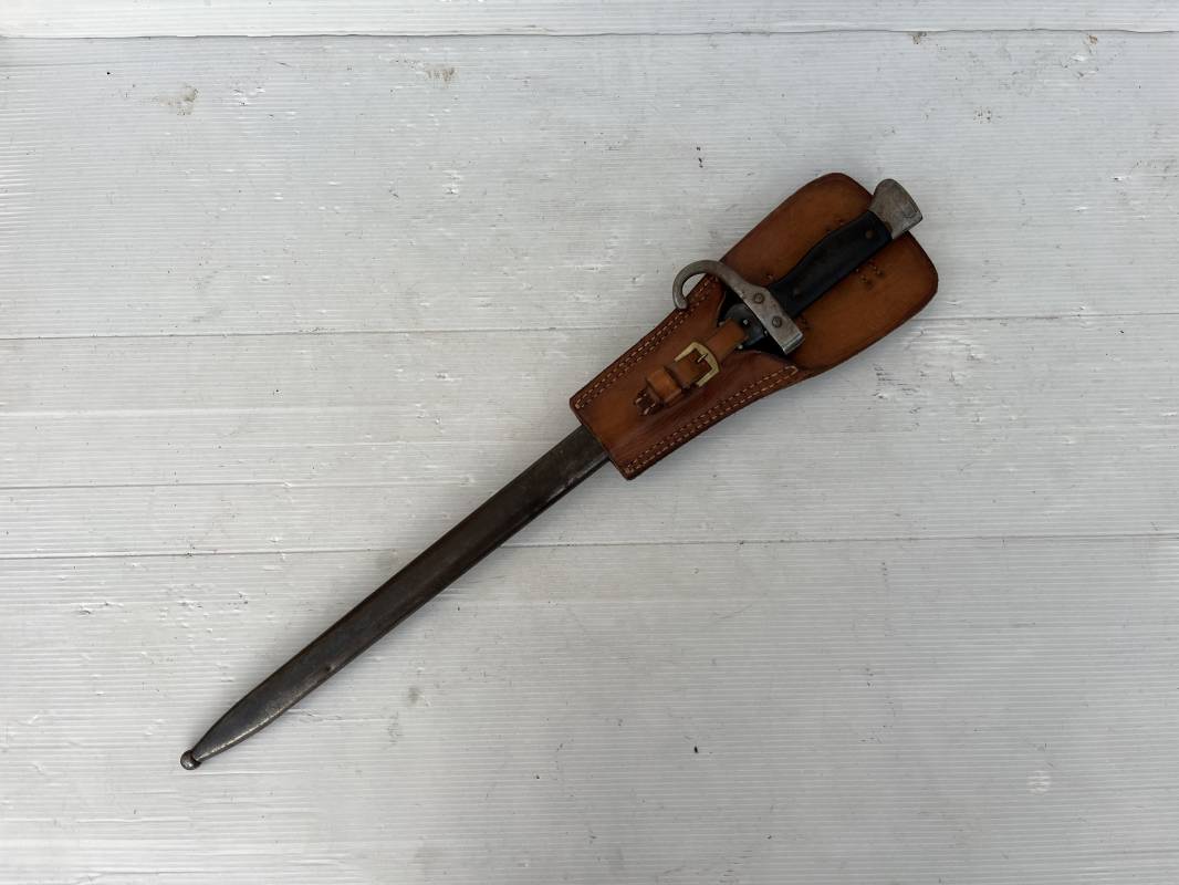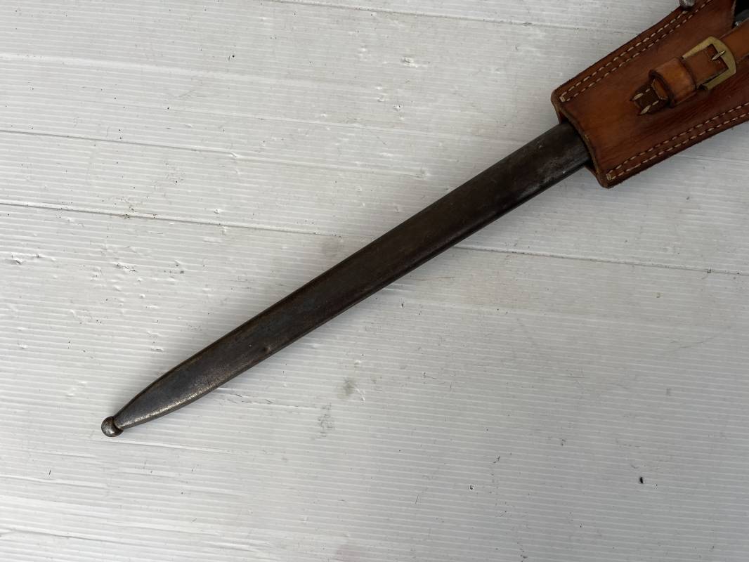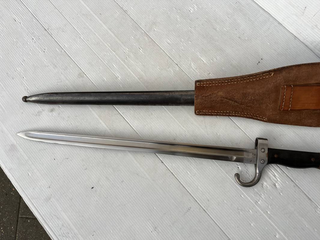 Baionnette modèle 1892 du fusil mousqueton premier modèle (avec quillon) et son gousset de dotation en cuir marron . Plaquettes en bois . Bouton poussoir. Lame acier avec goutière , sans trace de corrosion . Fourreau métallique avec passant de fixation au gousset. Fourreau bronzé . Baionnette légèrement utilisée en bel état. Numeros differents sur fourreau et garde . Gousset de dotation modéle 1892/15 en cuir marron . Passant cuir de ceinturon , lanière en cuir et boucle en laiton a un ardillon , cuir souple legerement porté en parfait état . Trés bel ensemble trouvé telquel en brocante dans le nord de la France . Parfait état 1939/40 Ref 19618