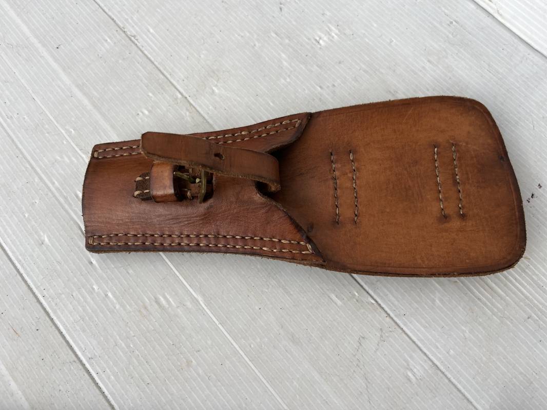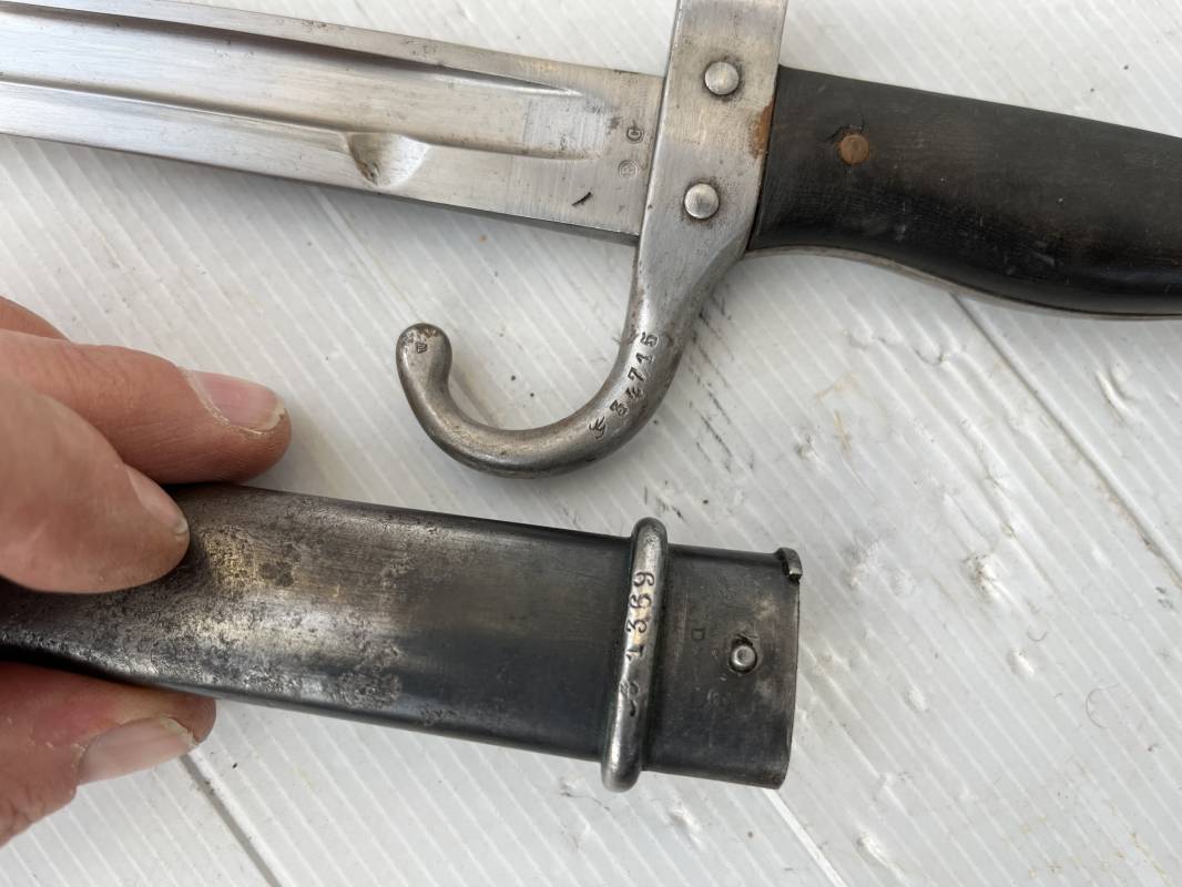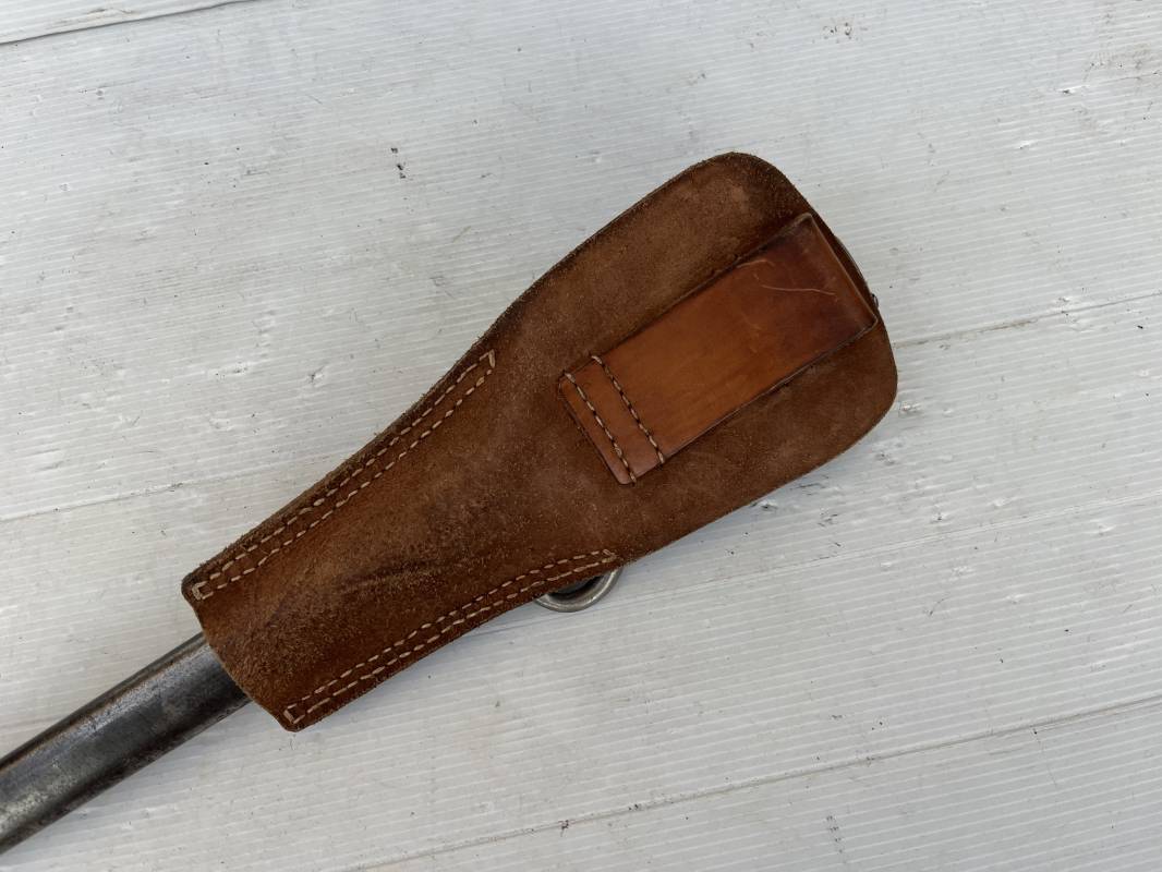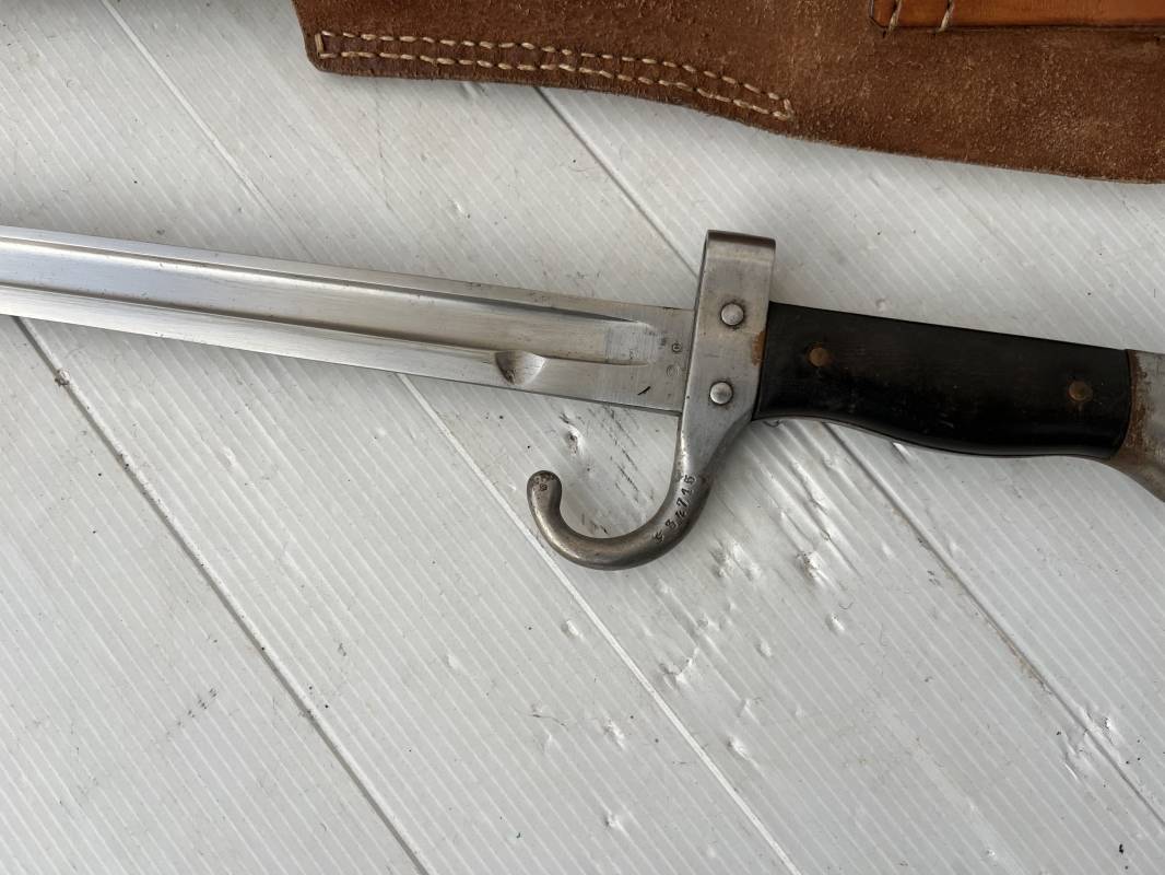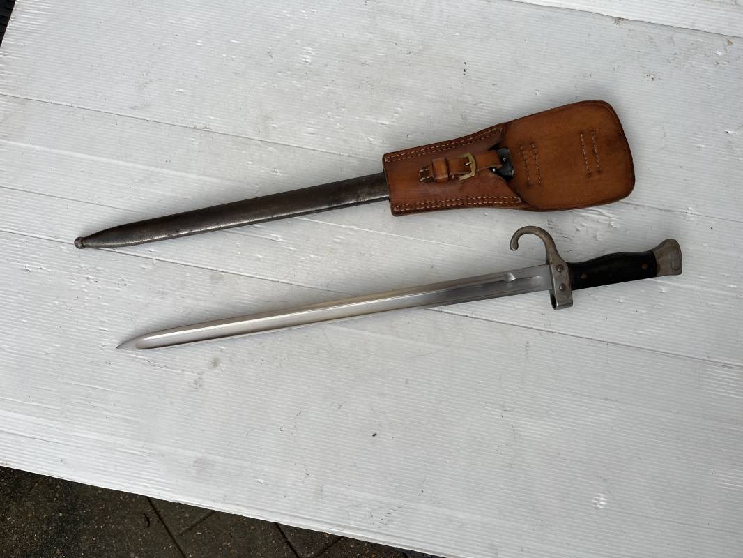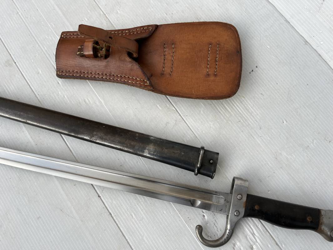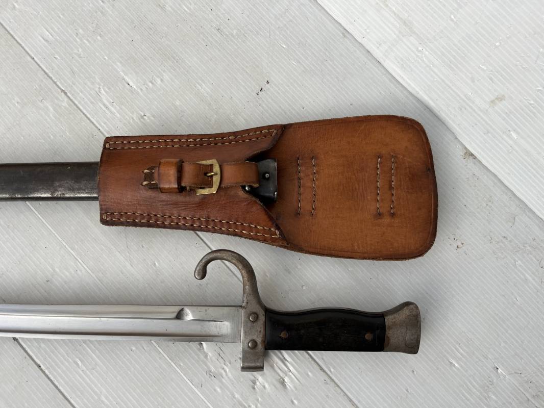 Baionnette modèle 1892 du fusil mousqueton premier modèle (avec quillon) et son gousset de dotation en cuir marron . Plaquettes en bois . Bouton poussoir. Lame acier avec goutière , sans trace de corrosion . Fourreau métallique avec passant de fixation au gousset. Fourreau bronzé . Baionnette légèrement utilisée en bel état. Numeros differents sur fourreau et garde . Gousset de dotation modéle 1892/15 en cuir marron . Passant cuir de ceinturon , lanière en cuir et boucle en laiton a un ardillon , cuir souple legerement porté en parfait état . Trés bel ensemble trouvé telquel en brocante dans le nord de la France . Parfait état 1939/40 Ref 19618