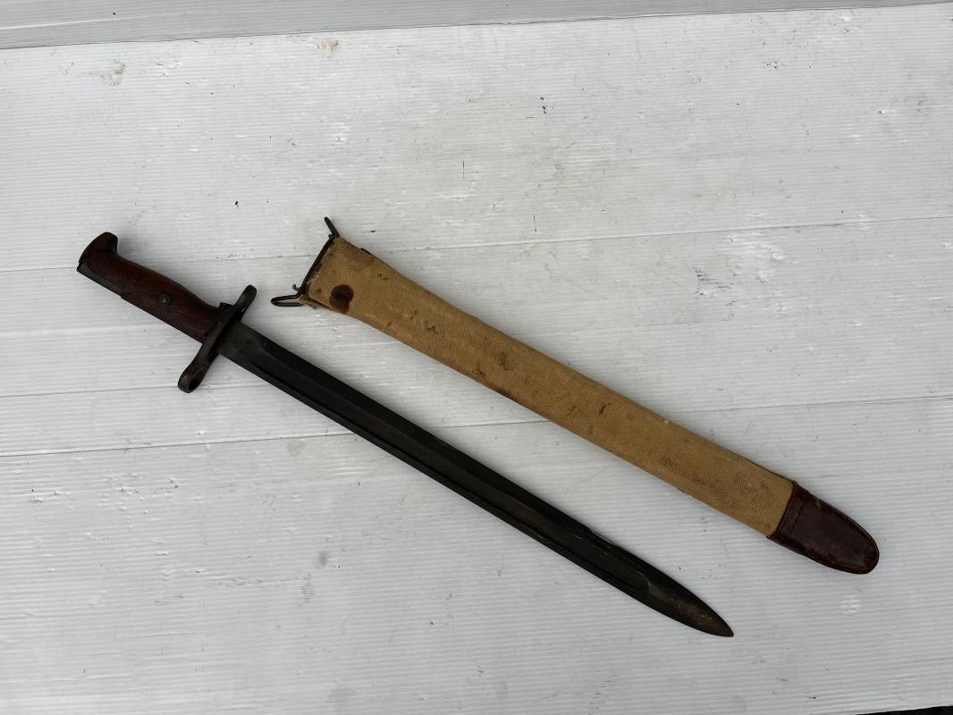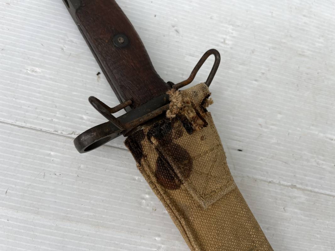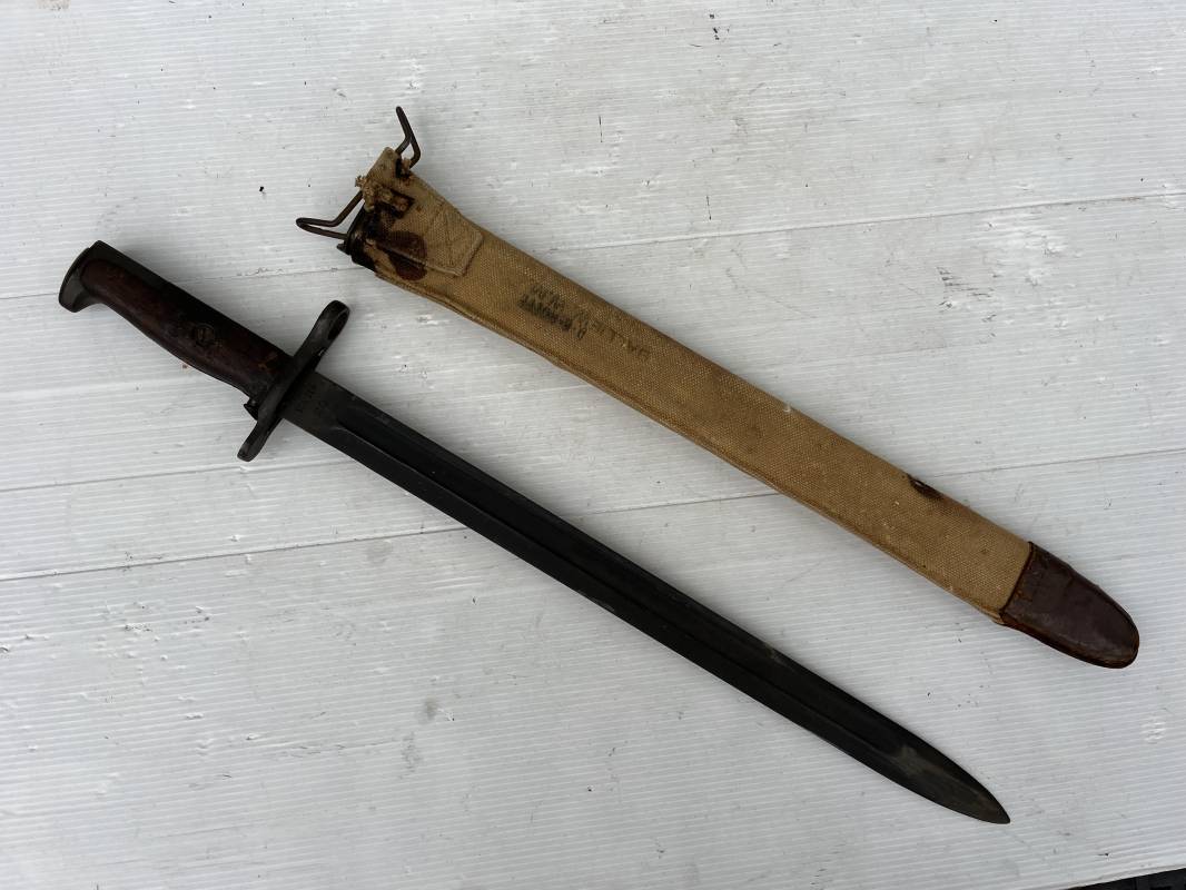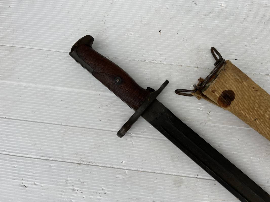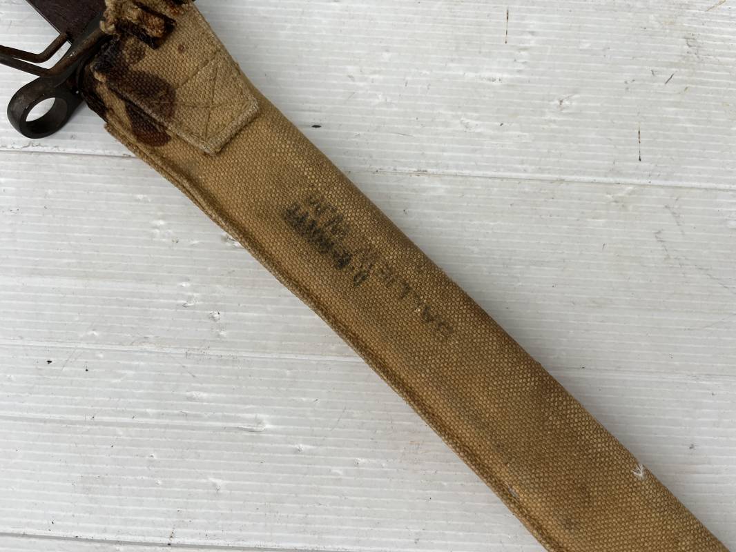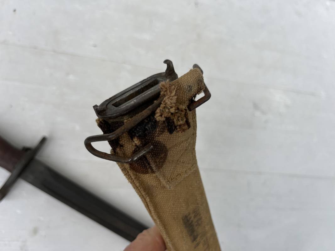 Rare baionnette americaine Modèle 1905 avec fourreau housse toile modele 1910 . Baionnette avec plaquettes de manche en bois , pommeau en forme de bec , garde et bouton poussoir . Trés belle lame parkérisée d origine , marquage fabricant RIA 1918 US et numero matricule Grenade de l ordonnance corps . Fourreau avec housse en forte toile kaki clair , embout en cuir marron , crochet mmeatllique d efixatio au ceinturon . A noté la toile de fixation du crochet endommagé par la corrosion ( voir photo ) Belle baionnete typique du Doughboy en 1917/18 Bel état Ref 19012