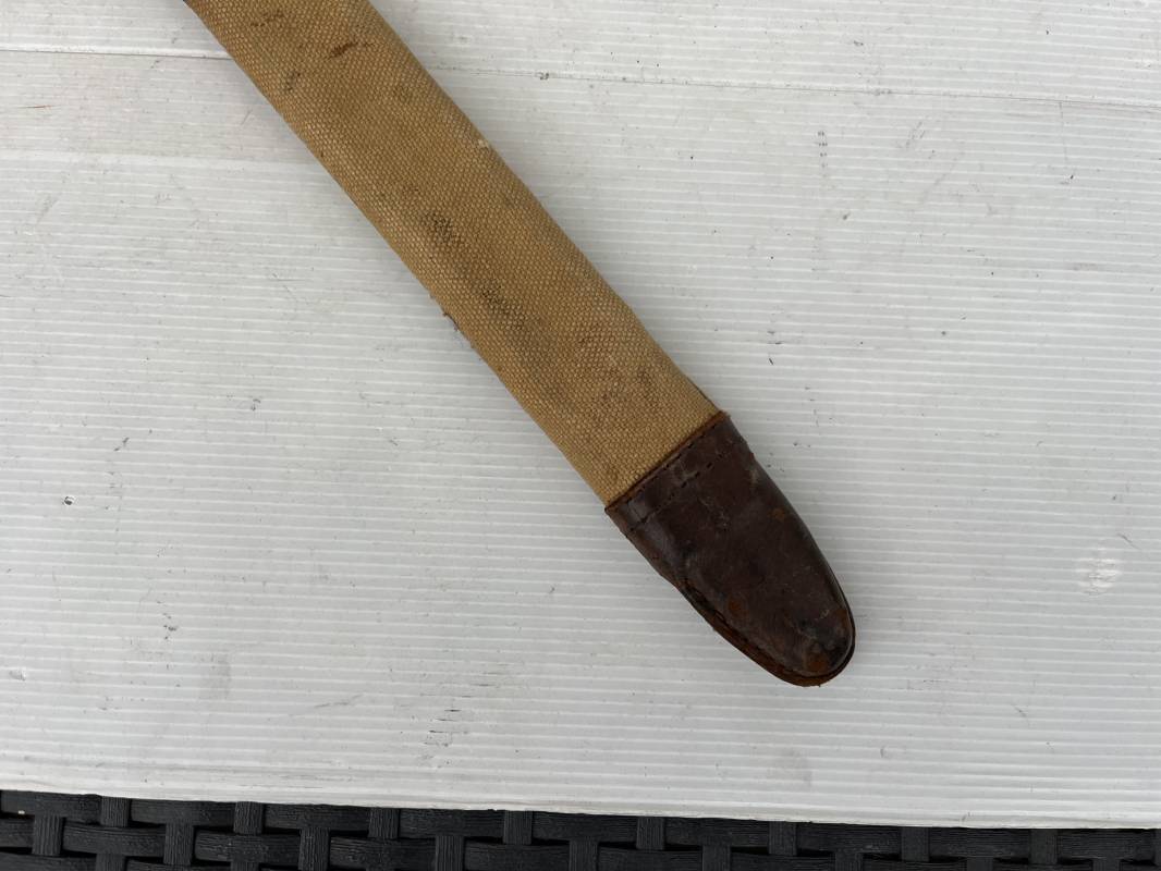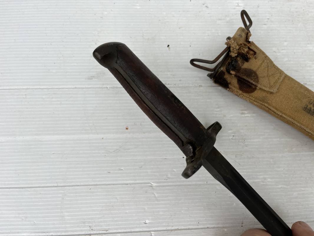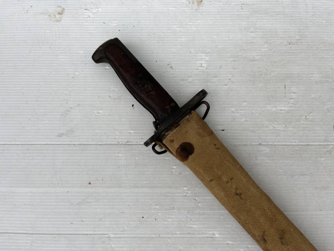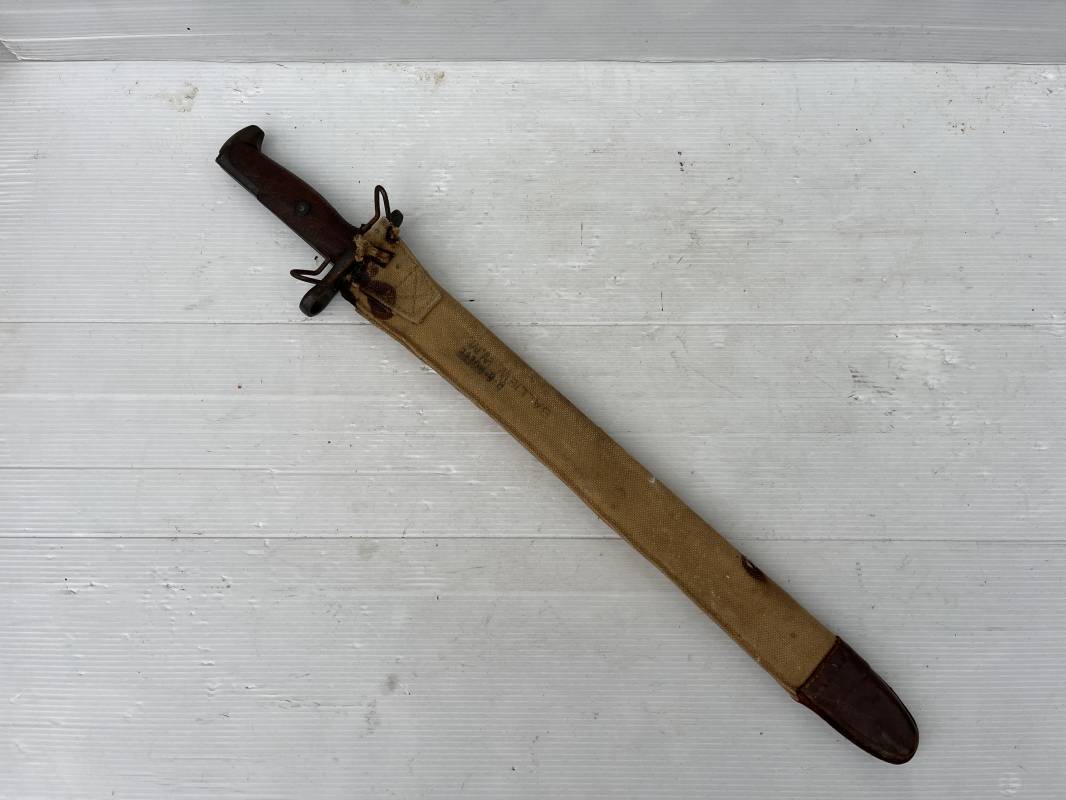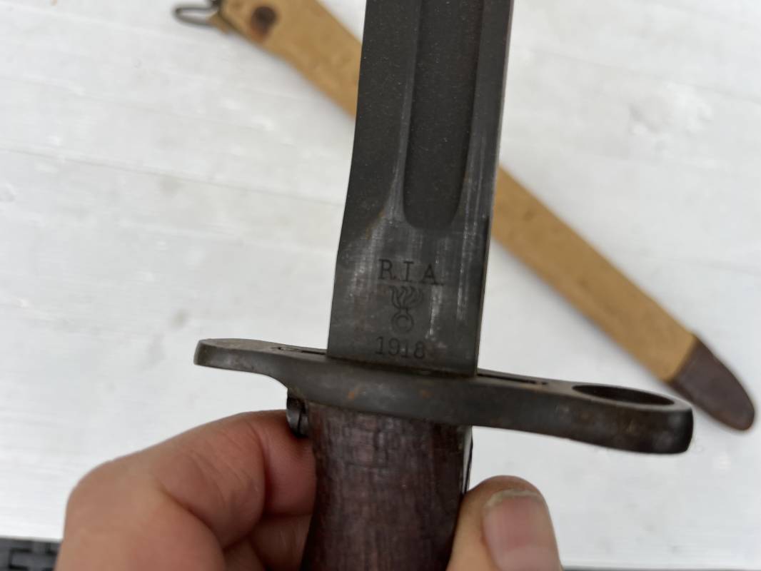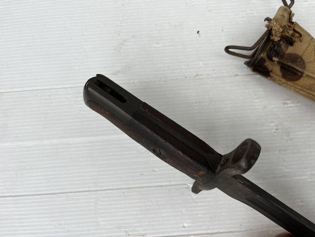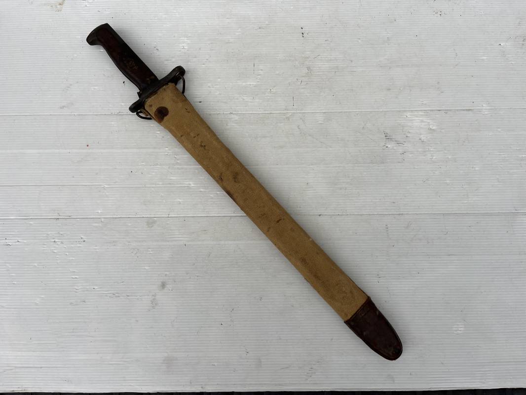 Rare baionnette americaine Modèle 1905 avec fourreau housse toile modele 1910 . Baionnette avec plaquettes de manche en bois , pommeau en forme de bec , garde et bouton poussoir . Trés belle lame parkérisée d origine , marquage fabricant RIA 1918 US et numero matricule Grenade de l ordonnance corps . Fourreau avec housse en forte toile kaki clair , embout en cuir marron , crochet mmeatllique d efixatio au ceinturon . A noté la toile de fixation du crochet endommagé par la corrosion ( voir photo ) Belle baionnete typique du Doughboy en 1917/18 Bel état Ref 19012