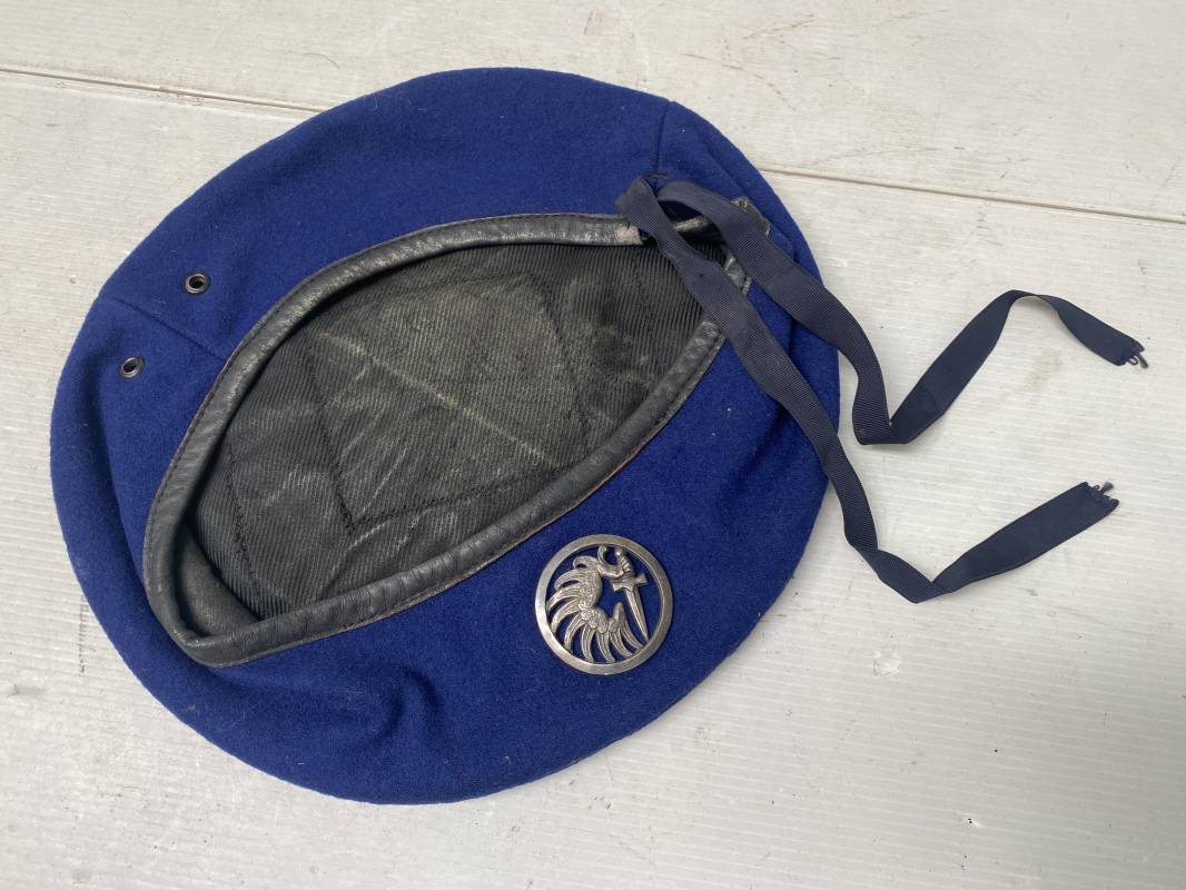 Trés beau béret parachutiste "Métropolitain " en drap de laine bleu roi. Béret modèle 1946 réglementaire, confection en trois parties. Oeillets de ventilation. Bordure cuir noir et lacet coton soie noire. Intèrieur doublé en coton noir. Taille 59. Renfort en cuir intèrieur pour fixation de l'insigne. Bon insigne Chasseur Parachutiste en métal. Marquage fabricant au dos Drago Paris Deposé. Fixation par deux anneaux et épingle. Béret très légèrement porté en parfait état 1946/55. Ref 17977