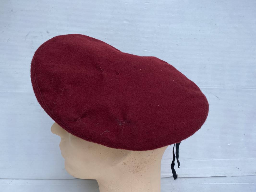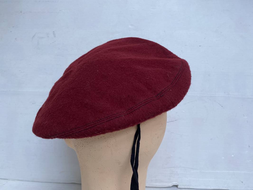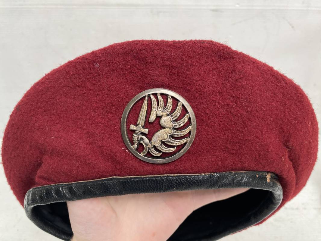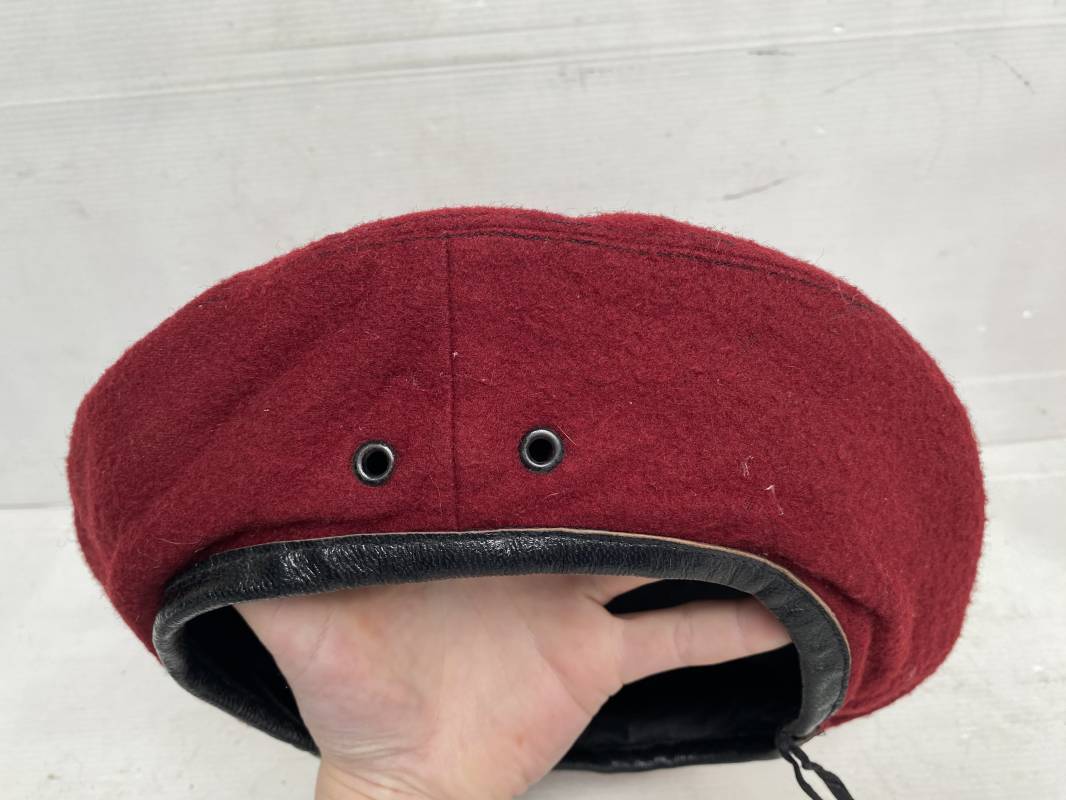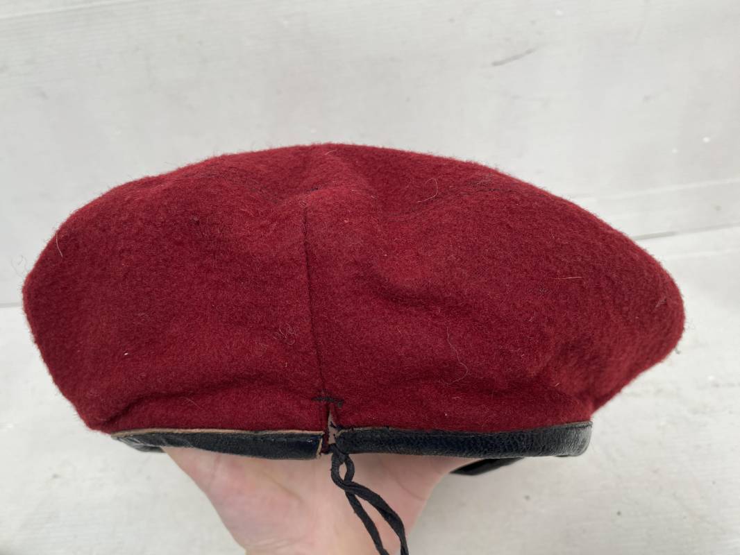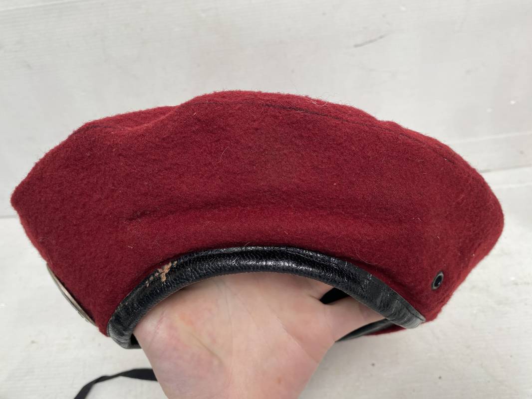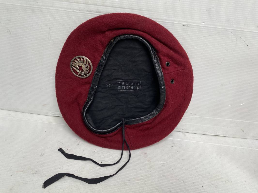 Beau béret "rouge" modèle 1946 d'un Parachutiste. Béret de confection réglementaire modèle 1946 en trois parties. Oeillets de ventilation métalliques. Pourtour en cuir noir. Lacet en coton noir. Intèrieur doublé en coton noir. Marquage encre blanc fabricant H. Chomelin Le Puy taille 58. Insigne métallique de Chasseur Parachutiste. Marquage fabricant Beraudy Vaure 63600 Ambert. Fixation par épingle sur renfort cuir. Béret porté en bon état 1946/54. Ref 17855