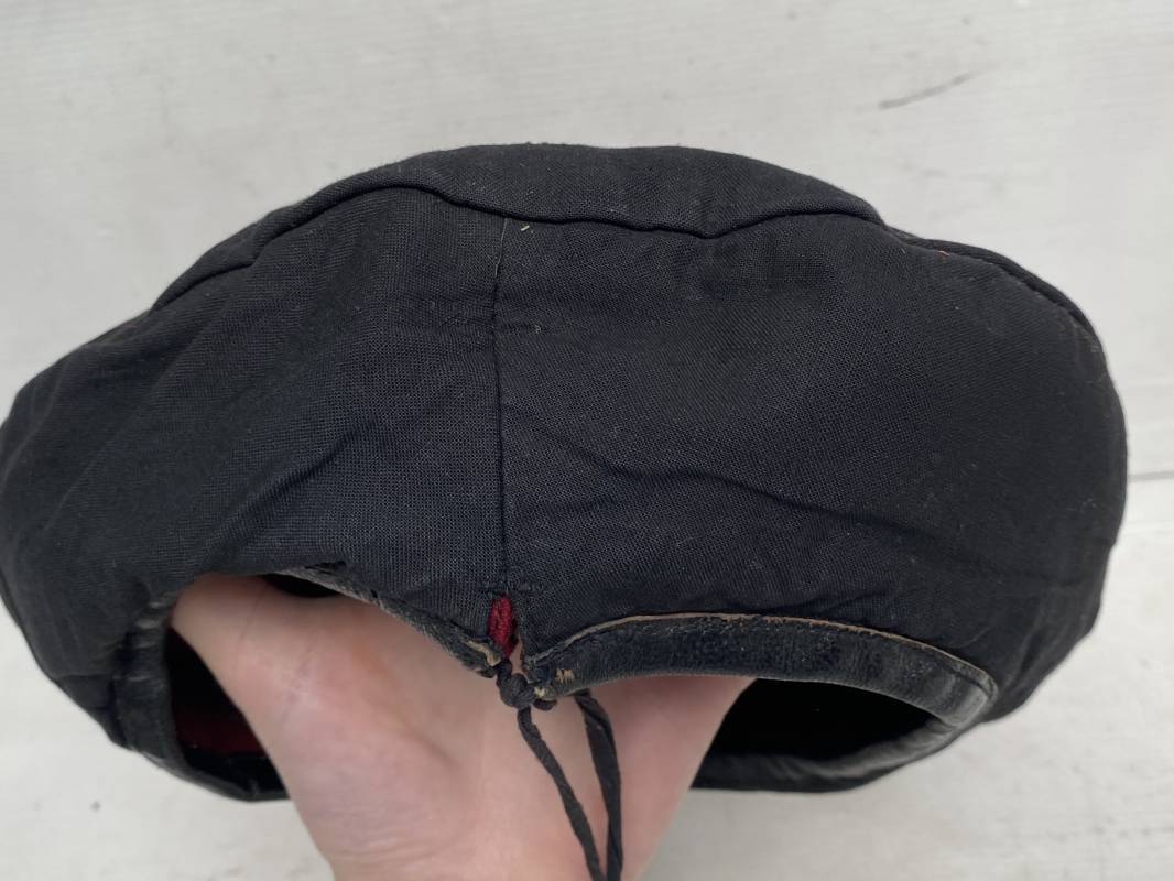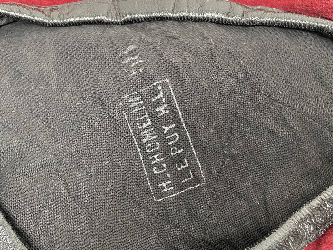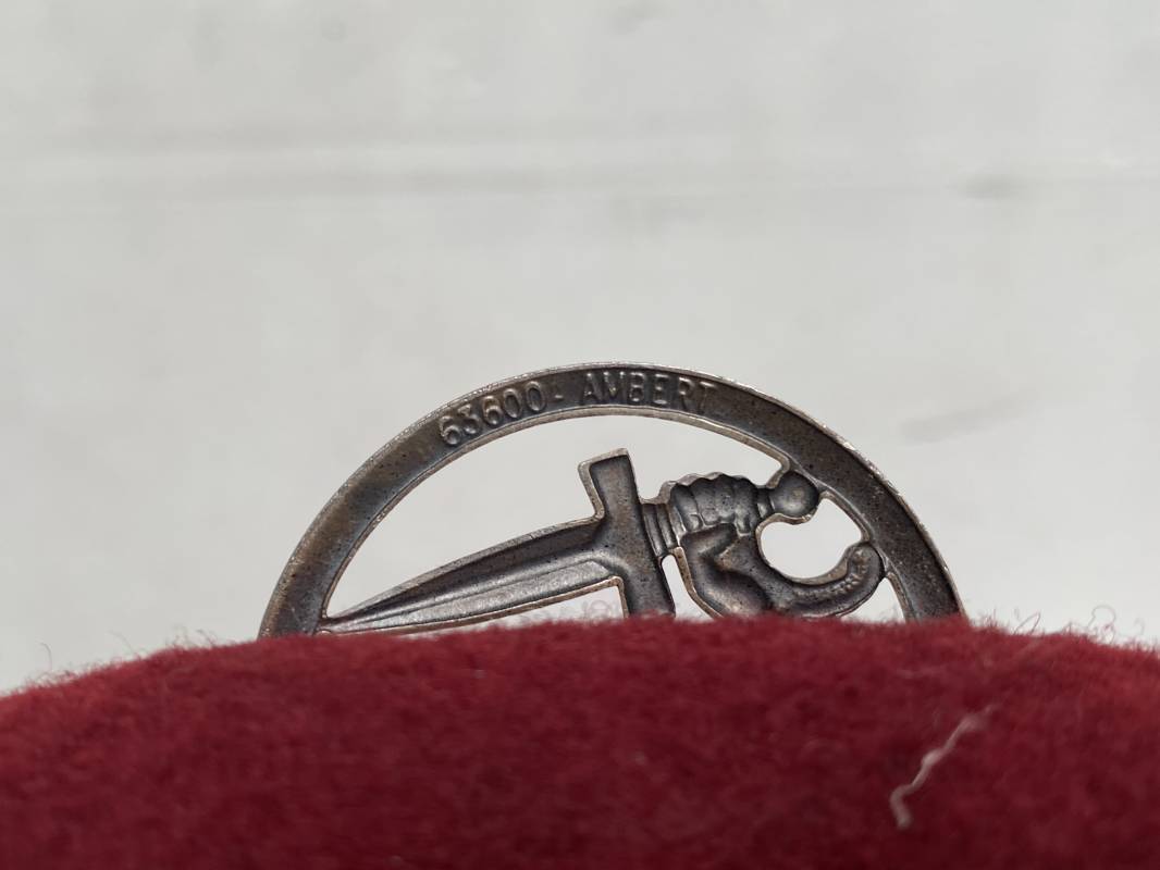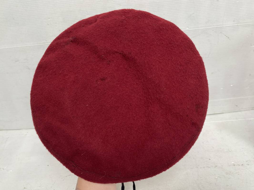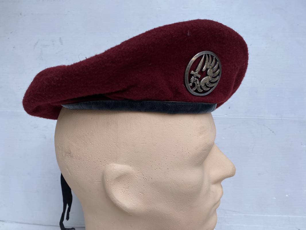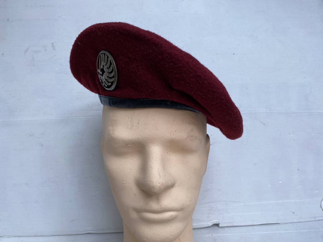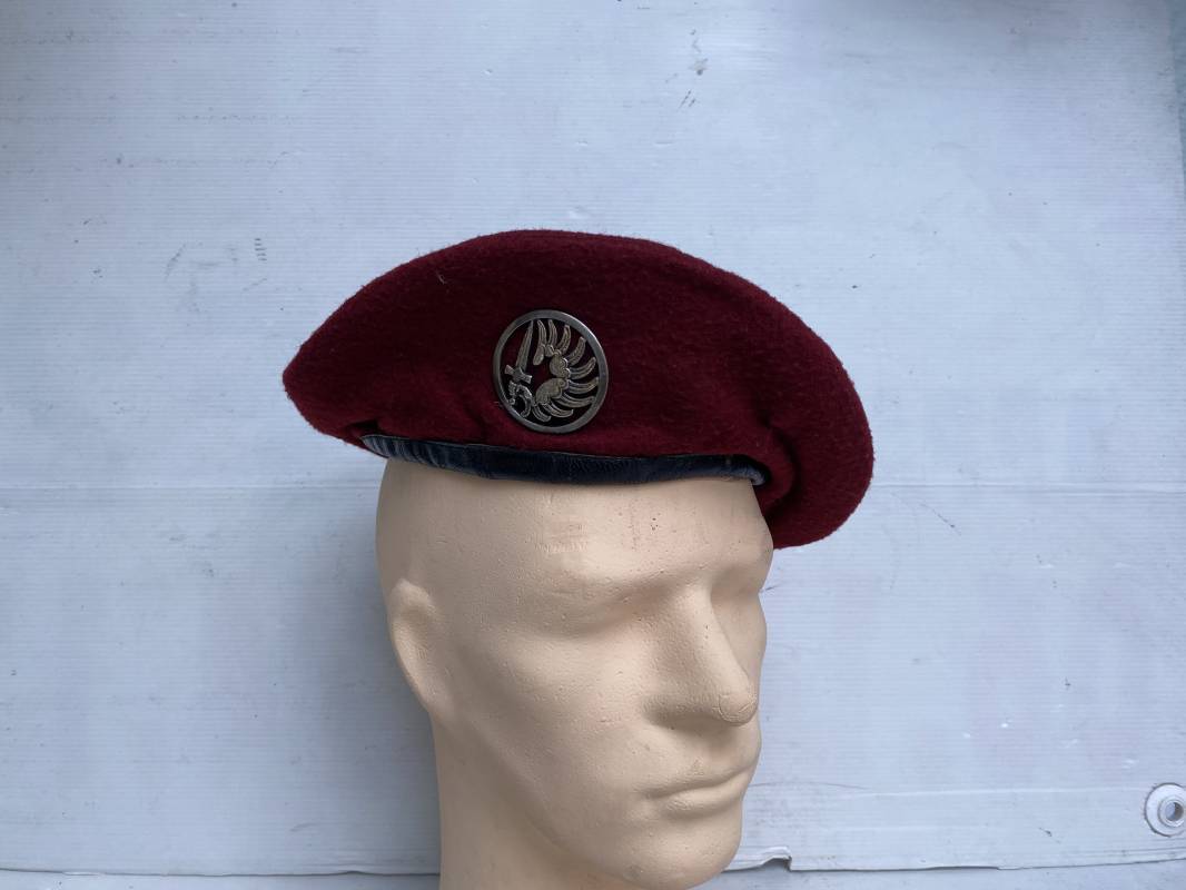 Beau béret "rouge" modèle 1946 d'un Parachutiste. Béret de confection réglementaire modèle 1946 en trois parties. Oeillets de ventilation métalliques. Pourtour en cuir noir. Lacet en coton noir. Intèrieur doublé en coton noir. Marquage encre blanc fabricant H. Chomelin Le Puy taille 58. Insigne métallique de Chasseur Parachutiste. Marquage fabricant Beraudy Vaure 63600 Ambert. Fixation par épingle sur renfort cuir. Béret porté en bon état 1946/54. Ref 17855