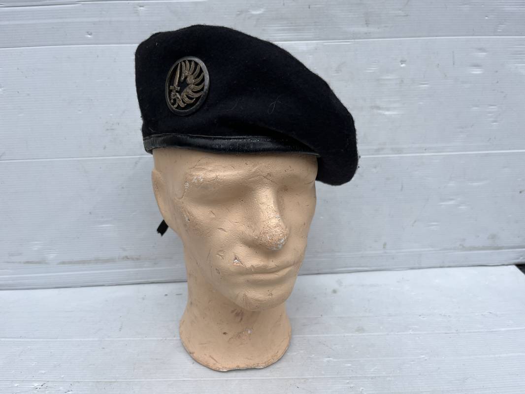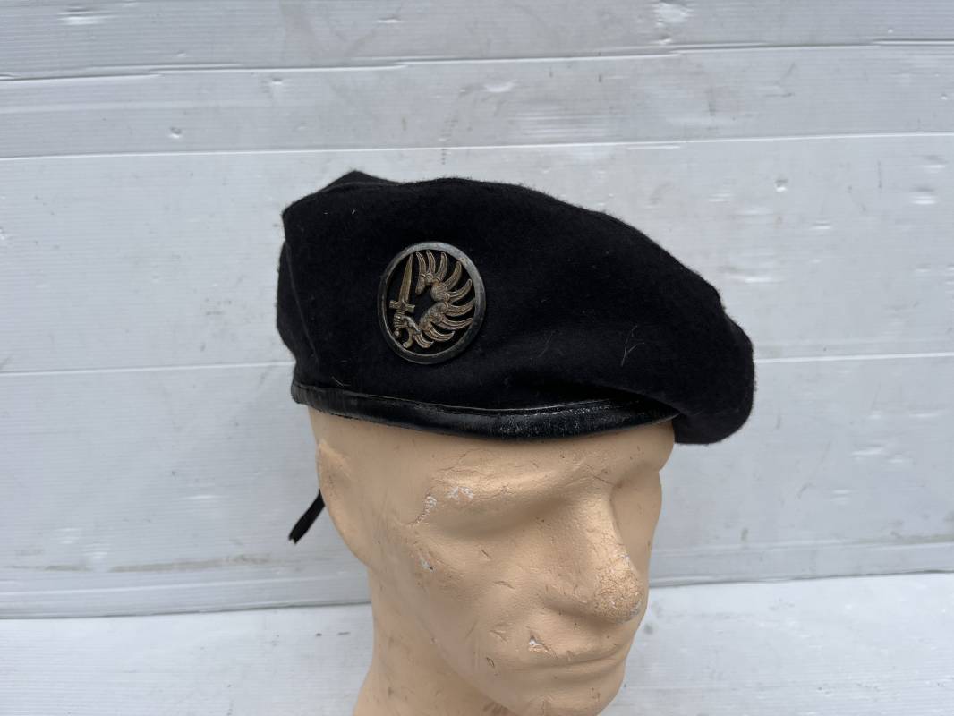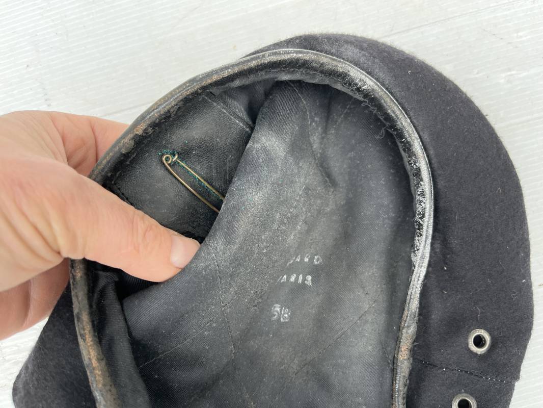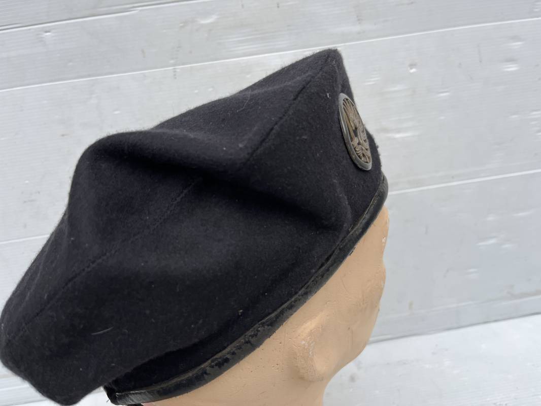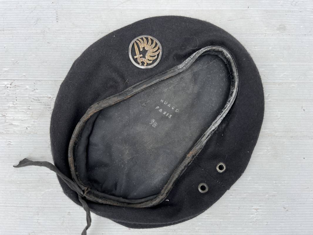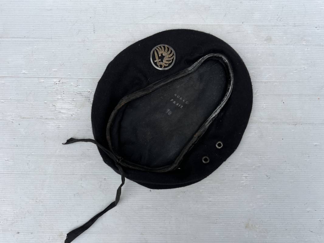 Rare béret type commando parachutiste en drap de laine bleu foncé / noir . Béret modèle 1946 réglementaire, confection en trois parties. Oeillets de ventilation. Bordure cuir noir et lacet coton soie noire. Intèrieur doublé en coton noir. Taille 58. Marquage encre fabricant Huart Paris Renfort en cuir intèrieur pour fixation de l'insigne. Bon insigne Chasseur Parachutiste en métal. Marquage fabricant Quinderoux Paris . Fixation par deux anneaux et épingle. Béret très légèrement porté en parfait état 1946/50 Typique bataillon de choc . Ref 21207