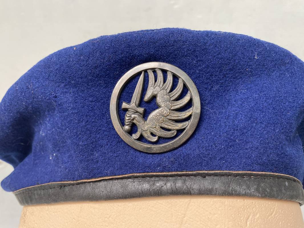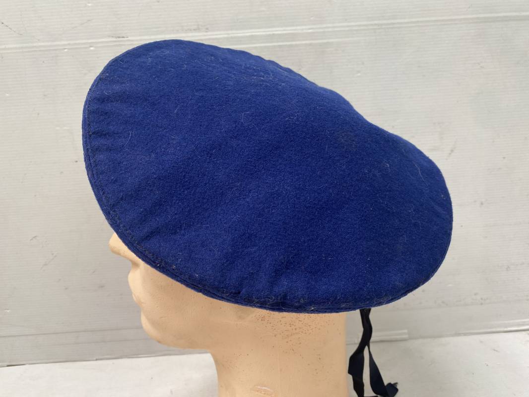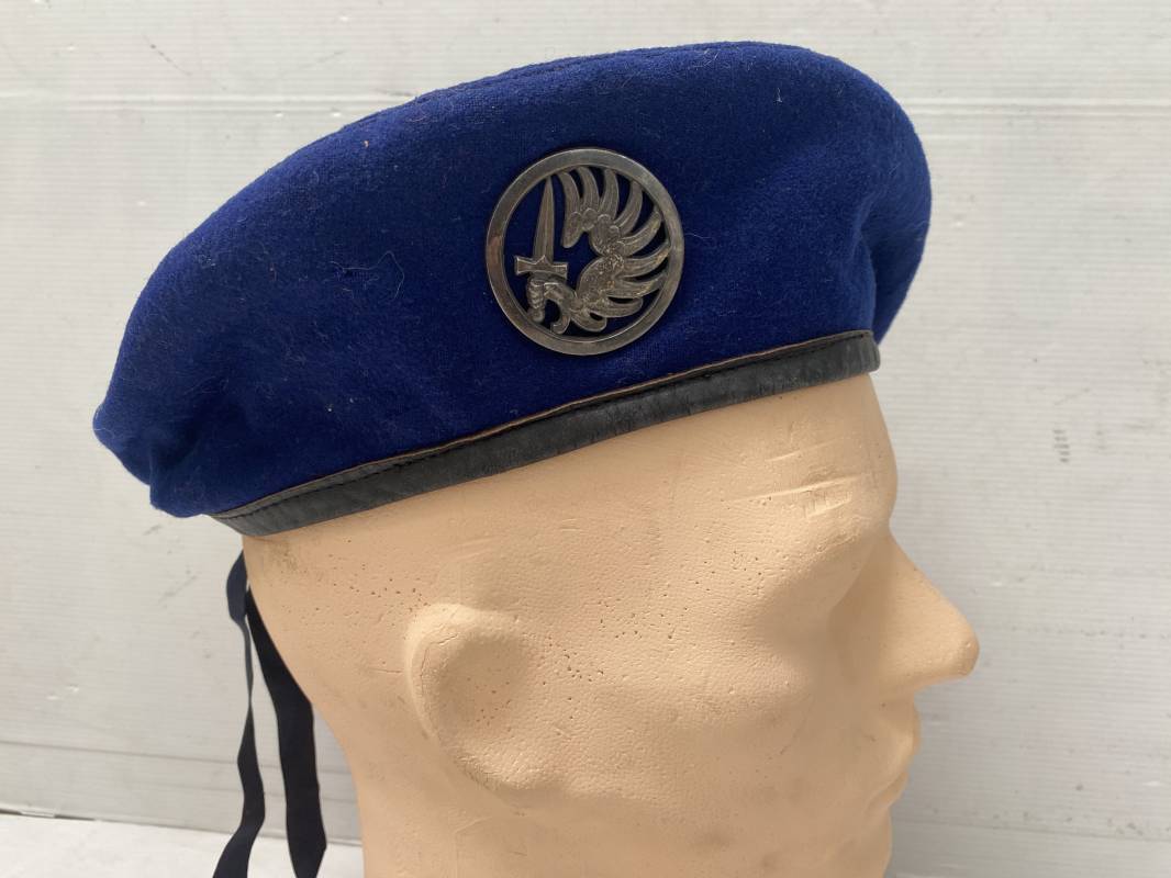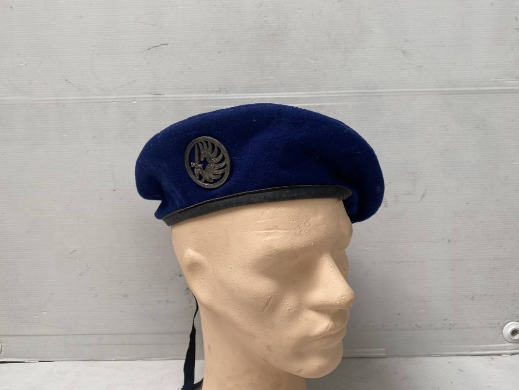 Trés beau béret parachutiste "Métropolitain " en drap de laine bleu roi. Béret modèle 1946 réglementaire, confection en trois parties. Oeillets de ventilation. Bordure cuir noir et lacet coton soie noire. Intèrieur doublé en coton noir. Taille 59. Renfort en cuir intèrieur pour fixation de l'insigne. Bon insigne Chasseur Parachutiste en métal. Marquage fabricant au dos Drago Paris Deposé. Fixation par deux anneaux et épingle. Béret très légèrement porté en parfait état 1946/55. Ref 17977