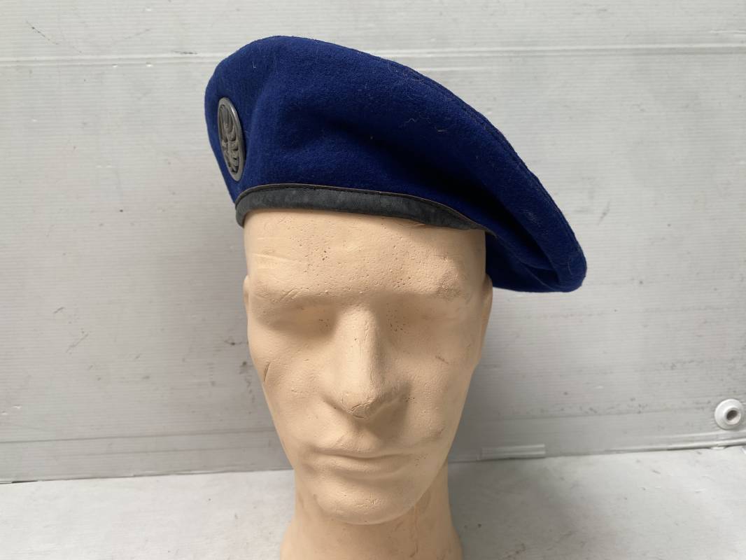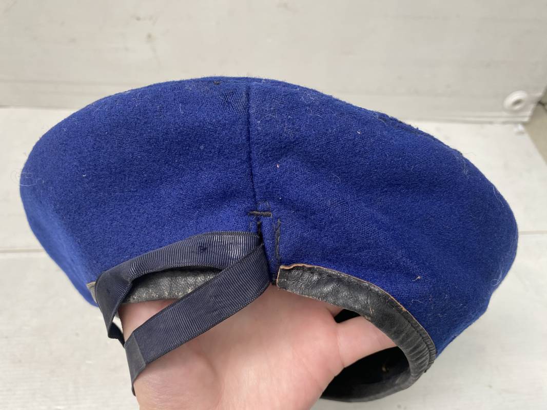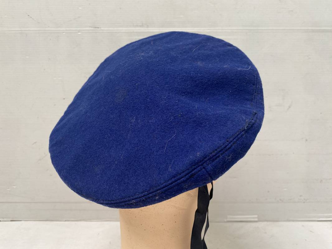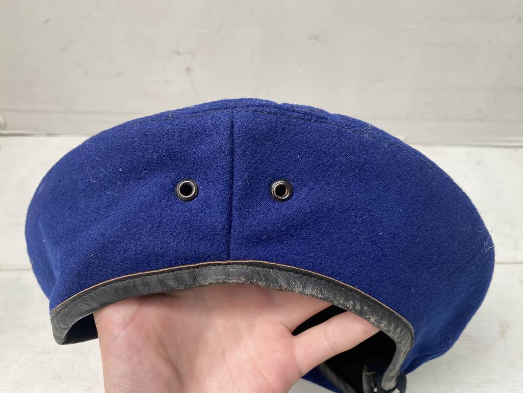 Trés beau béret parachutiste "Métropolitain " en drap de laine bleu roi. Béret modèle 1946 réglementaire, confection en trois parties. Oeillets de ventilation. Bordure cuir noir et lacet coton soie noire. Intèrieur doublé en coton noir. Taille 59. Renfort en cuir intèrieur pour fixation de l'insigne. Bon insigne Chasseur Parachutiste en métal. Marquage fabricant au dos Drago Paris Deposé. Fixation par deux anneaux et épingle. Béret très légèrement porté en parfait état 1946/55. Ref 17977