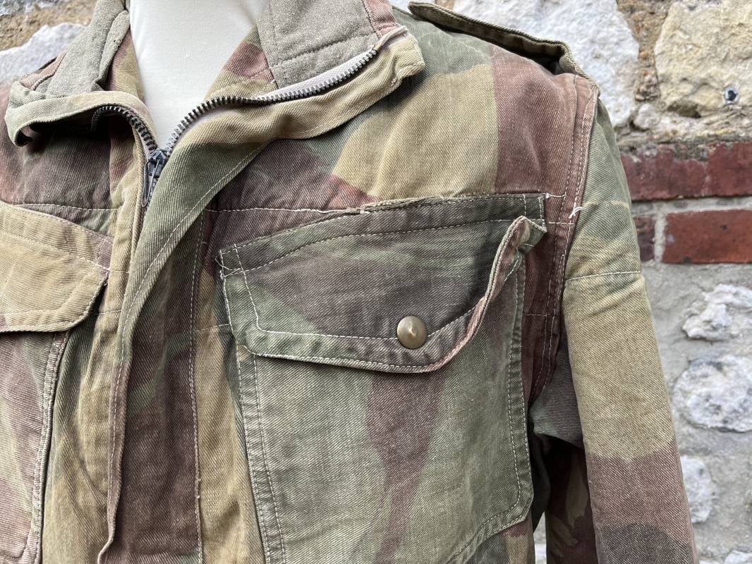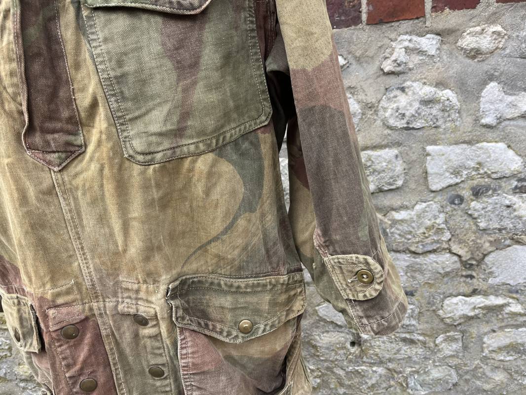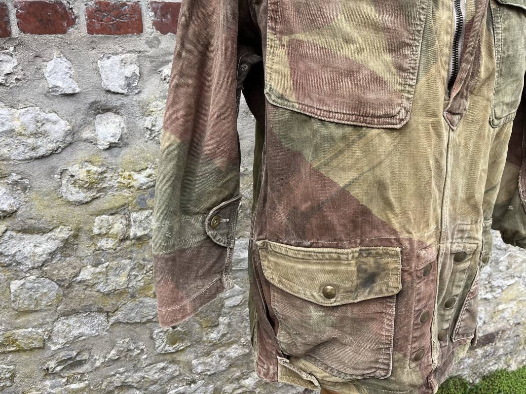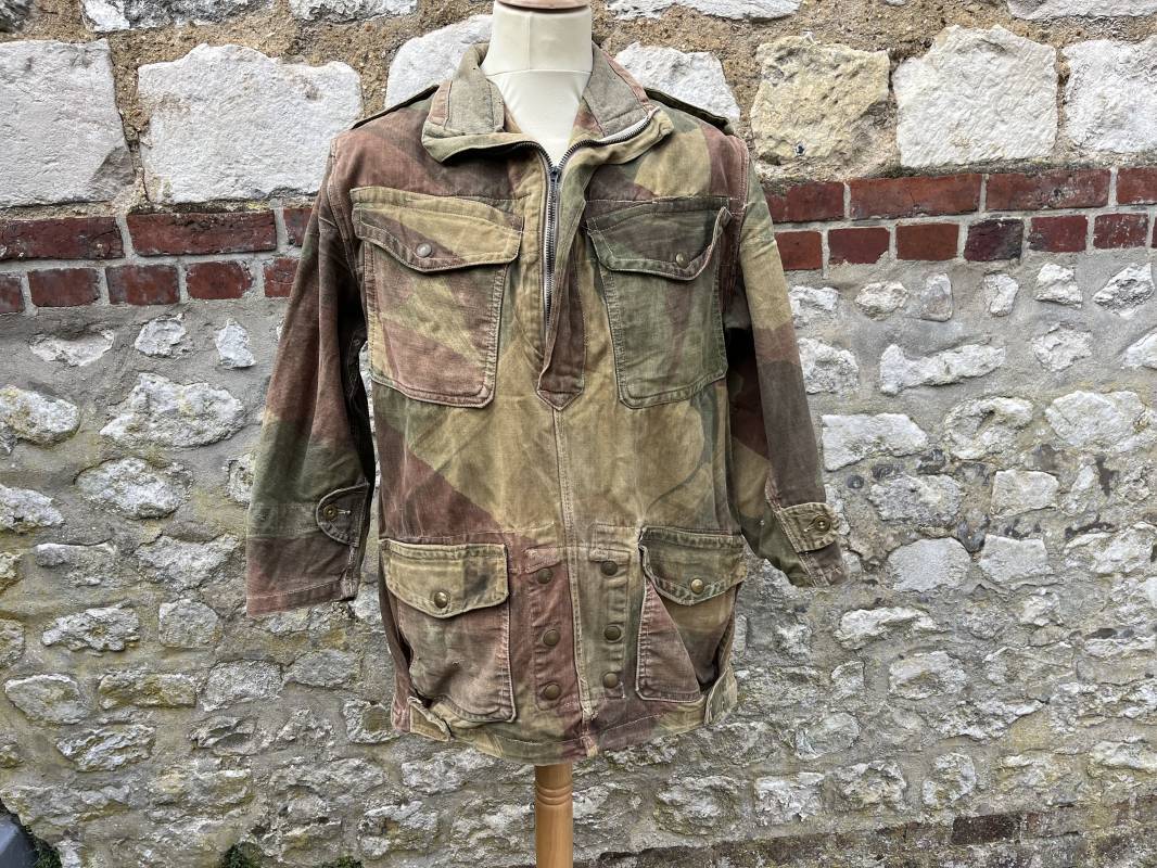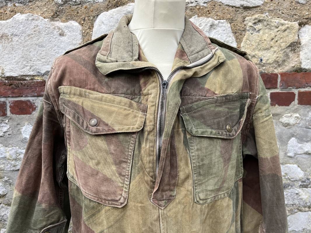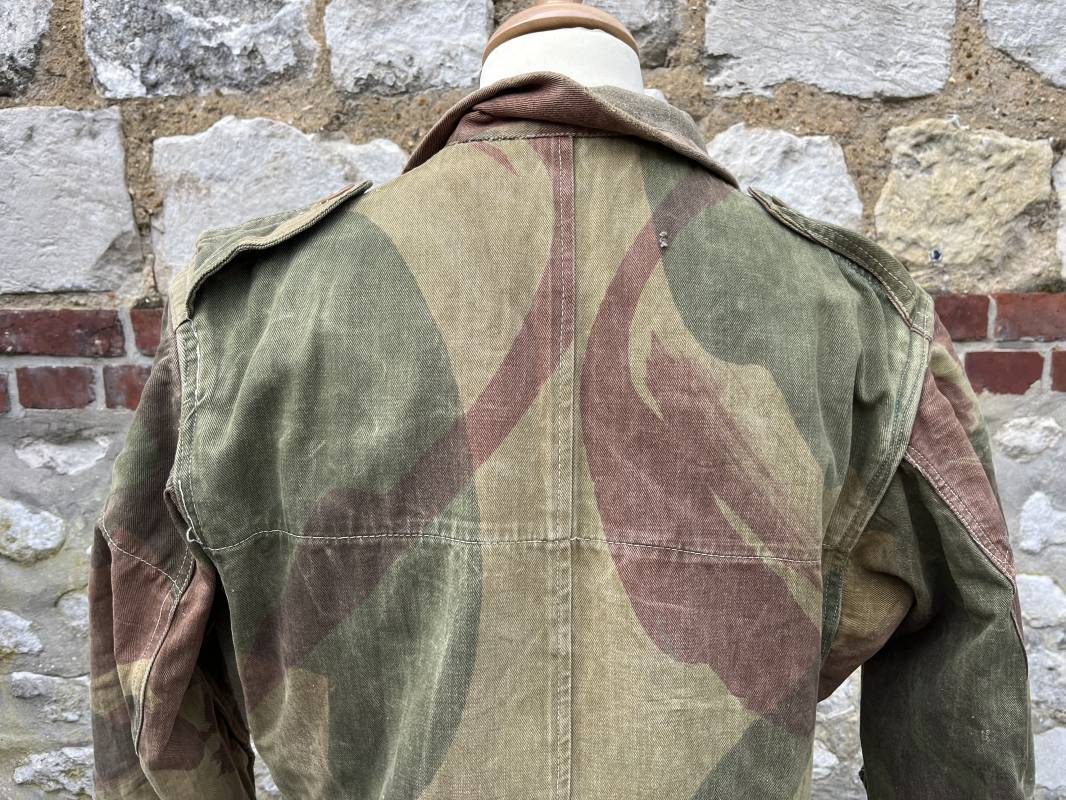 Rare blouse de saut de Parachutiste Anglais. Blouse Denison Smock du 2ème modèle.Cette blouse a ete trouvée en brocante dans le secteur de Pont l eveque ( 14 ) dans les années 1980 . Quatre poches à fermeture par pressions en laiton du type "Newey". Fermeture par glissière à mi poitrine. Glissière d'origine et fonctionnelle ( a noté que la tirette a ete remplacée par un trombonne metalllique voir photo ) . Pattes d'épaules, bouts des manches à pattes boutonnées. Queue de castor avec fermeture par pressions. Deux pattes de serrage à pressions sur les côtés. Etiquette coton avec marquage fabricant Gordon and Co 1944. Taille 3. Largeur d'épaules 48cm. Longueur 77cm. Manches 53cm. Belle Denison portée en bon état. Belles couleurs de camouflage. Très belle patine générale 1943/45. Rare uniforme pour commando , SAS ou parachutiste Ref 22176