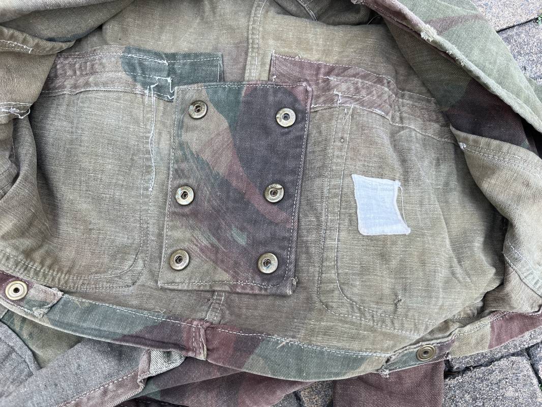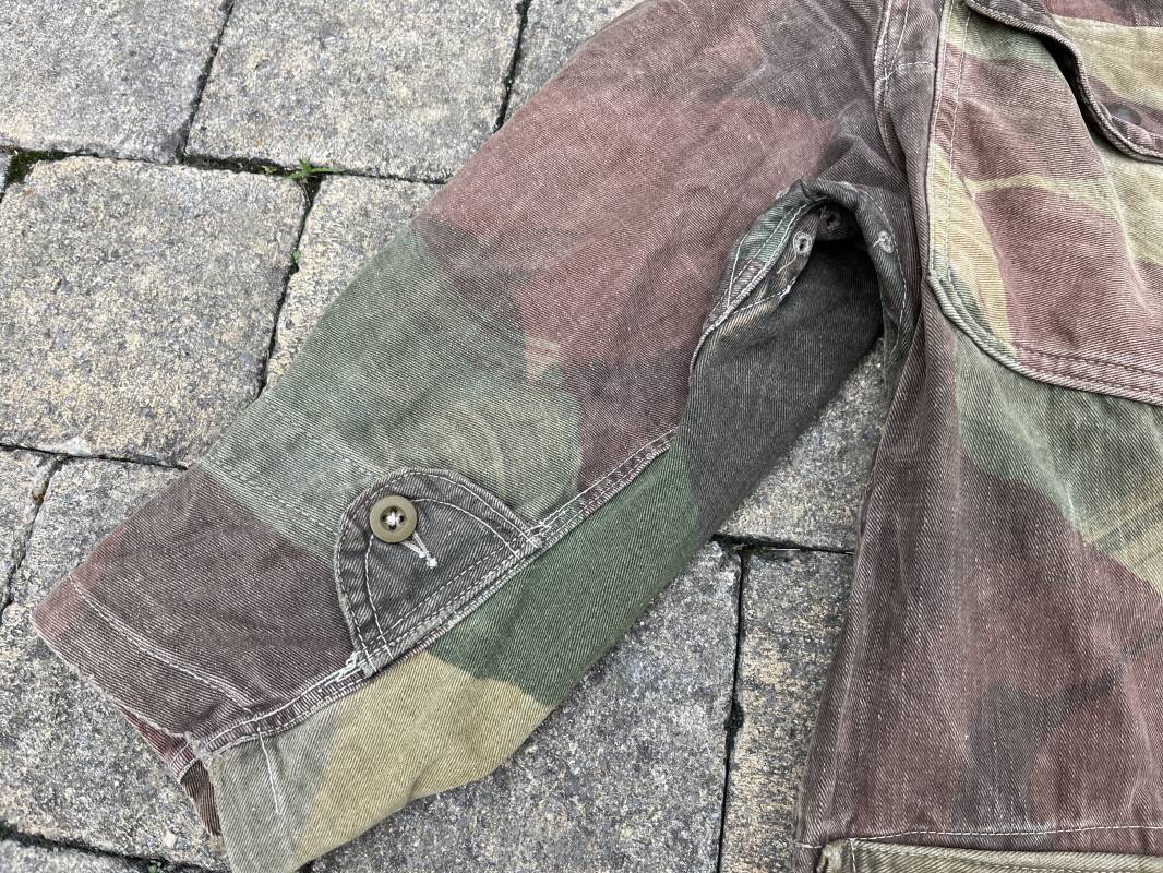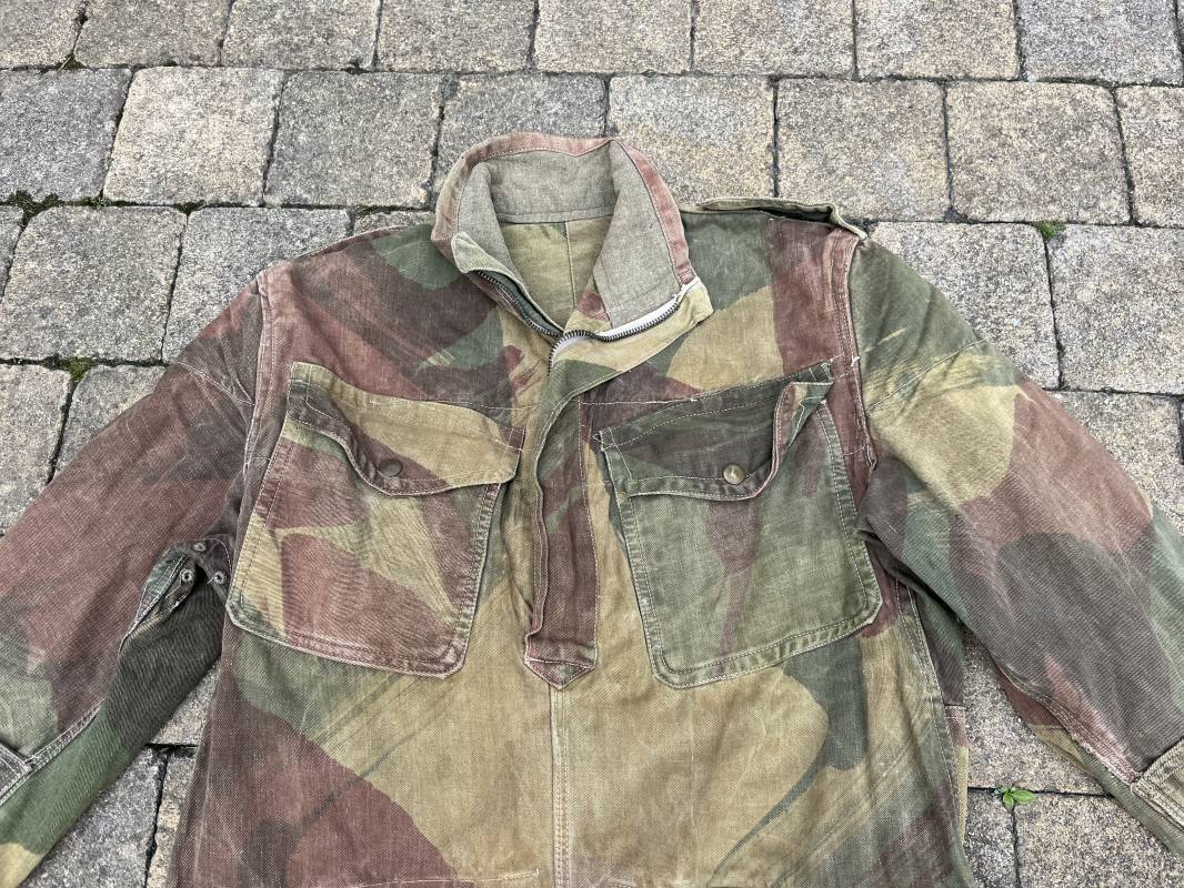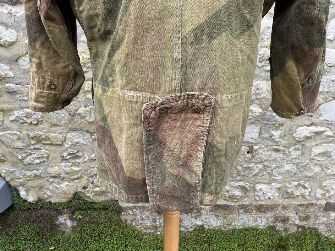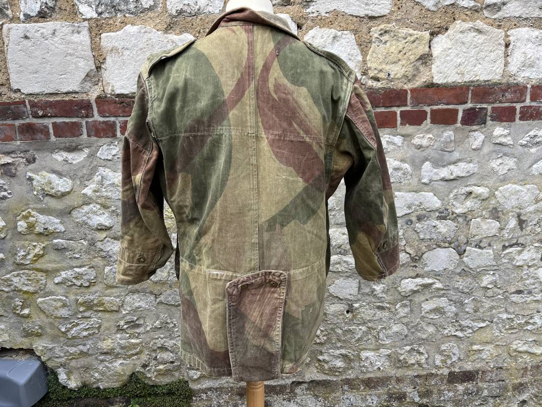 Rare blouse de saut de Parachutiste Anglais. Blouse Denison Smock du 2ème modèle.Cette blouse a ete trouvée en brocante dans le secteur de Pont l eveque ( 14 ) dans les années 1980 . Quatre poches à fermeture par pressions en laiton du type "Newey". Fermeture par glissière à mi poitrine. Glissière d'origine et fonctionnelle ( a noté que la tirette a ete remplacée par un trombonne metalllique voir photo ) . Pattes d'épaules, bouts des manches à pattes boutonnées. Queue de castor avec fermeture par pressions. Deux pattes de serrage à pressions sur les côtés. Etiquette coton avec marquage fabricant Gordon and Co 1944. Taille 3. Largeur d'épaules 48cm. Longueur 77cm. Manches 53cm. Belle Denison portée en bon état. Belles couleurs de camouflage. Très belle patine générale 1943/45. Rare uniforme pour commando , SAS ou parachutiste Ref 22176