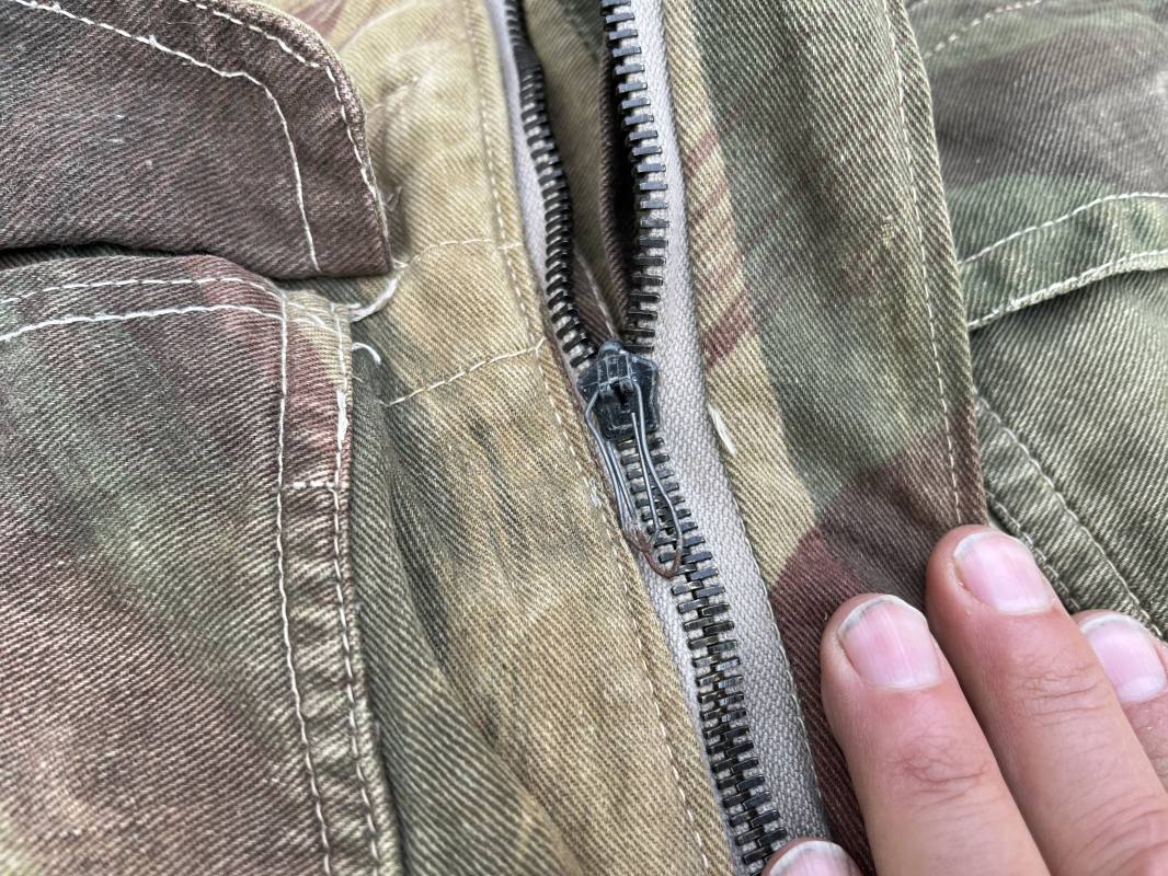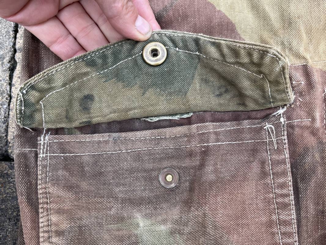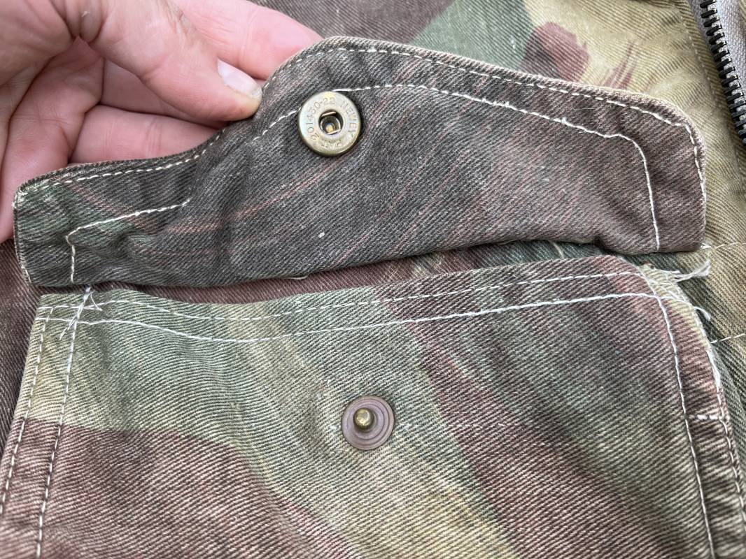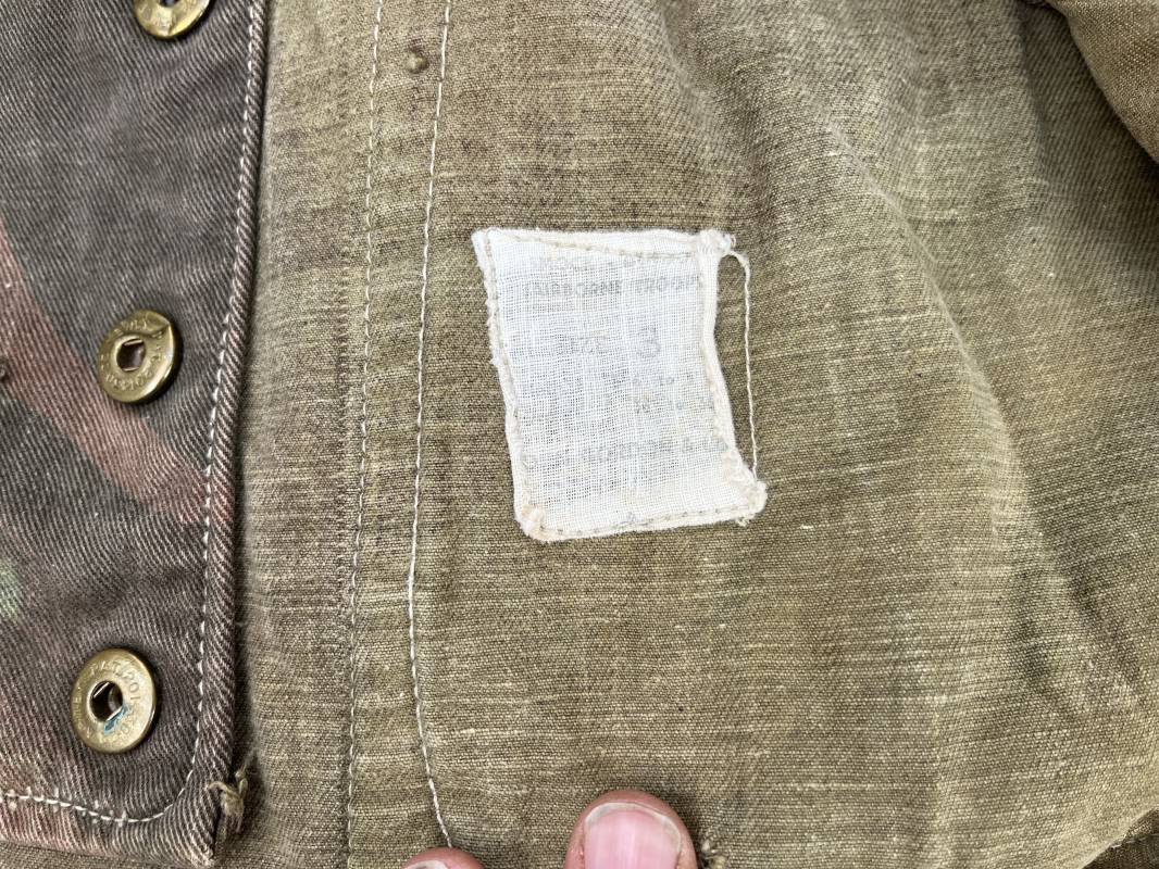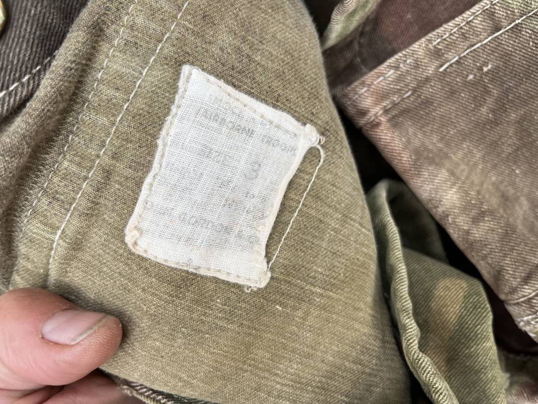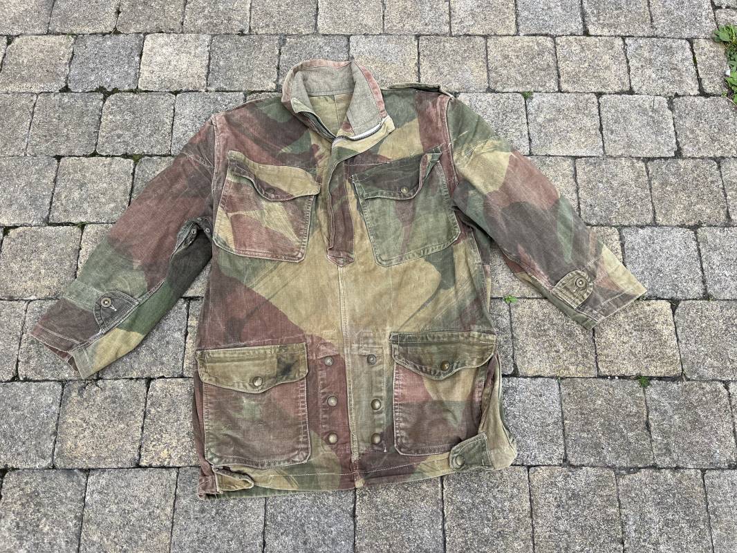 Rare blouse de saut de Parachutiste Anglais. Blouse Denison Smock du 2ème modèle.Cette blouse a ete trouvée en brocante dans le secteur de Pont l eveque ( 14 ) dans les années 1980 . Quatre poches à fermeture par pressions en laiton du type "Newey". Fermeture par glissière à mi poitrine. Glissière d'origine et fonctionnelle ( a noté que la tirette a ete remplacée par un trombonne metalllique voir photo ) . Pattes d'épaules, bouts des manches à pattes boutonnées. Queue de castor avec fermeture par pressions. Deux pattes de serrage à pressions sur les côtés. Etiquette coton avec marquage fabricant Gordon and Co 1944. Taille 3. Largeur d'épaules 48cm. Longueur 77cm. Manches 53cm. Belle Denison portée en bon état. Belles couleurs de camouflage. Très belle patine générale 1943/45. Rare uniforme pour commando , SAS ou parachutiste Ref 22176