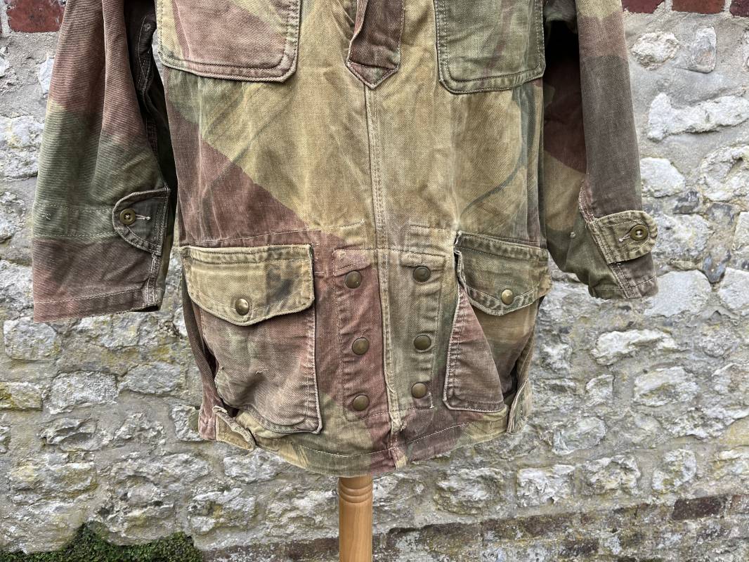 Rare blouse de saut de Parachutiste Anglais. Blouse Denison Smock du 2ème modèle.Cette blouse a ete trouvée en brocante dans le secteur de Pont l eveque ( 14 ) dans les années 1980 . Quatre poches à fermeture par pressions en laiton du type "Newey". Fermeture par glissière à mi poitrine. Glissière d'origine et fonctionnelle ( a noté que la tirette a ete remplacée par un trombonne metalllique voir photo ) . Pattes d'épaules, bouts des manches à pattes boutonnées. Queue de castor avec fermeture par pressions. Deux pattes de serrage à pressions sur les côtés. Etiquette coton avec marquage fabricant Gordon and Co 1944. Taille 3. Largeur d'épaules 48cm. Longueur 77cm. Manches 53cm. Belle Denison portée en bon état. Belles couleurs de camouflage. Très belle patine générale 1943/45. Rare uniforme pour commando , SAS ou parachutiste Ref 22176