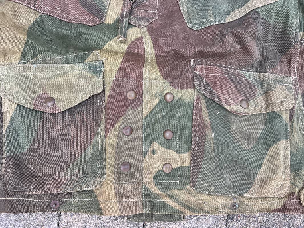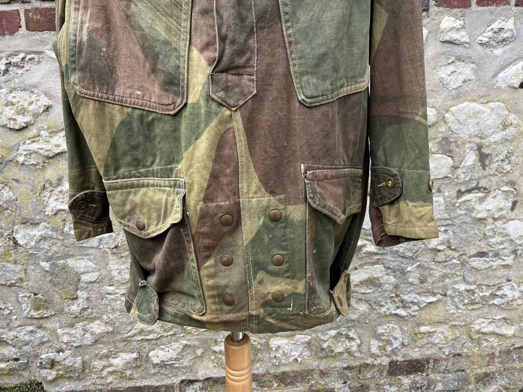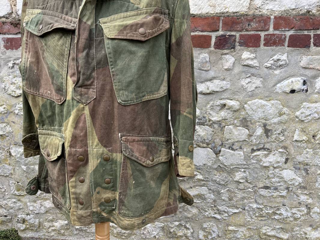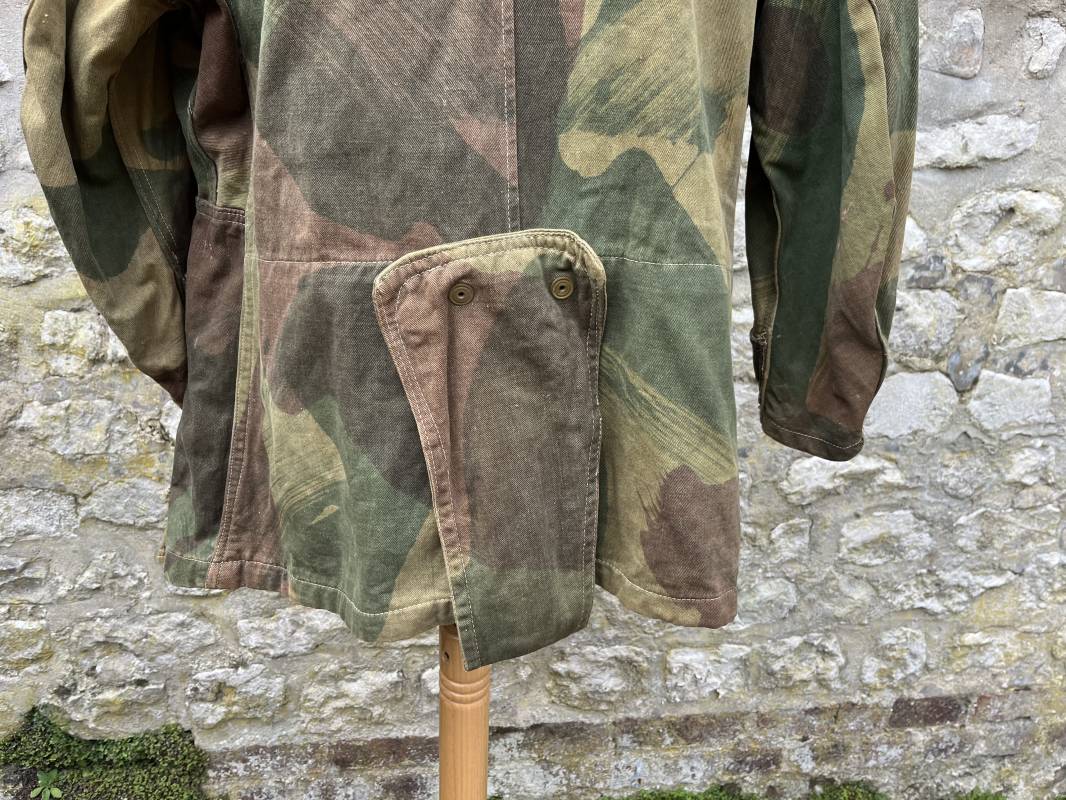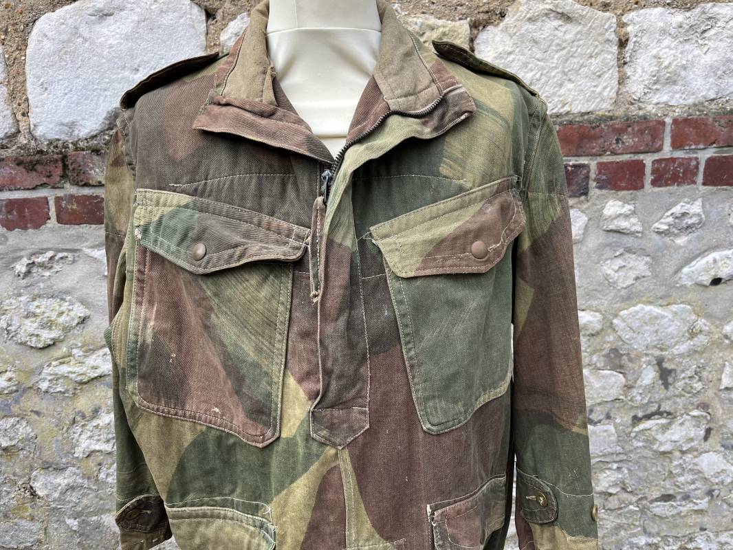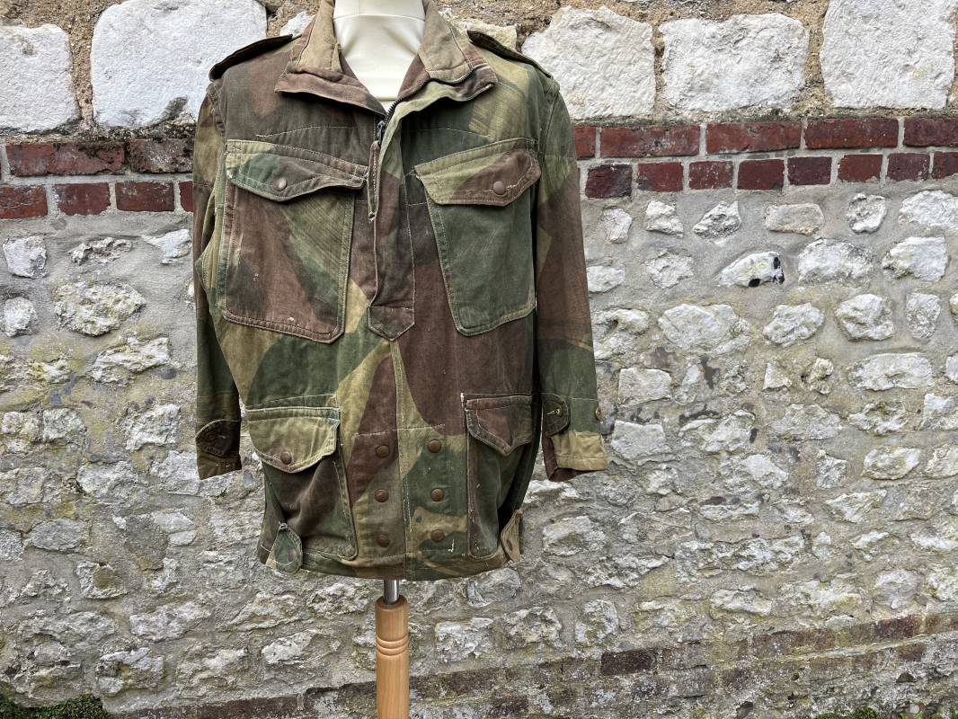 Rare blouse de saut de Parachutiste Anglais. Blouse Denison Smock du 2ème modèle . Quatre poches à fermeture par pressions en laiton du type "Newey". Fermeture par glissière à mi poitrine. Glissière d'origine et fonctionnelle Marquage fabricant Dot Made in england , tirette en coton camouflé . Pattes d'épaules, bouts des manches à pattes boutonnées.Brevet coton de parachutiste cousu d'origine sur la manche droite . Brevet coton en mauvais etat ( voir photos ) Queue de castor avec fermeture par pressions. Deux pattes de serrage à pressions sur les côtés. Etiquette coton avec marquage fabricant Gordon and Co 1944. Taille 4. Largeur d'épaules 50cm. Longueur 80cm. Manches 56cm. Belle Denison portée en bon état. Belles couleurs de camouflage. Très belle patine générale 1943/45. Rare uniforme pour commando , SAS ou parachutiste Ref 22198