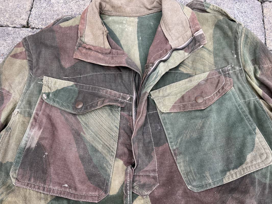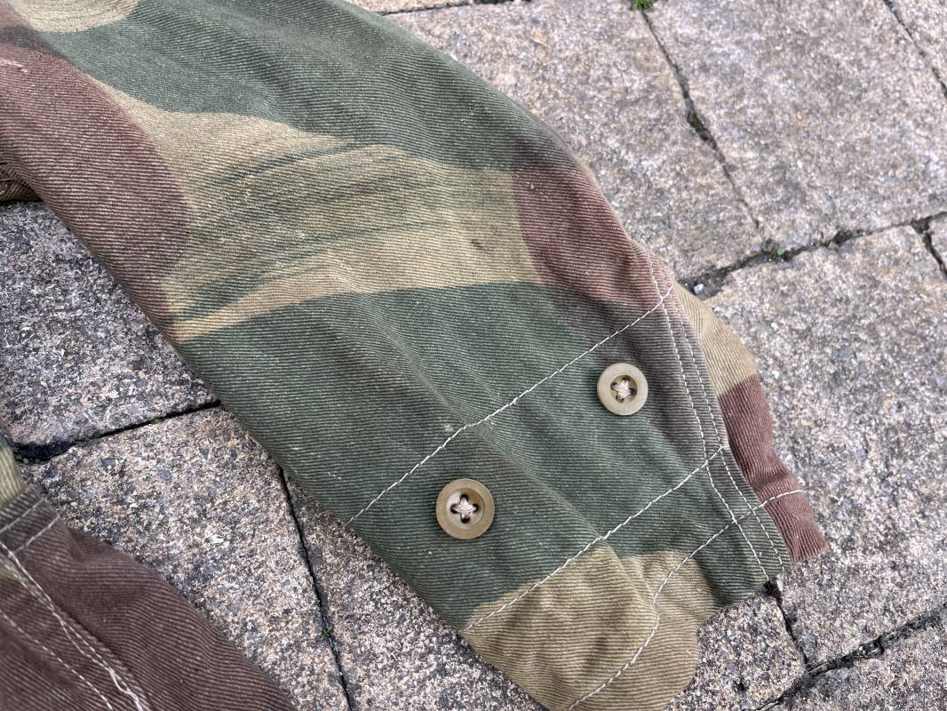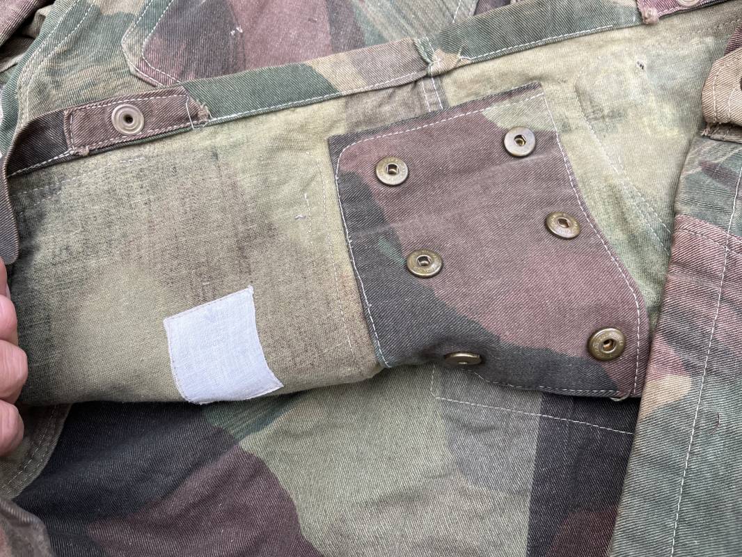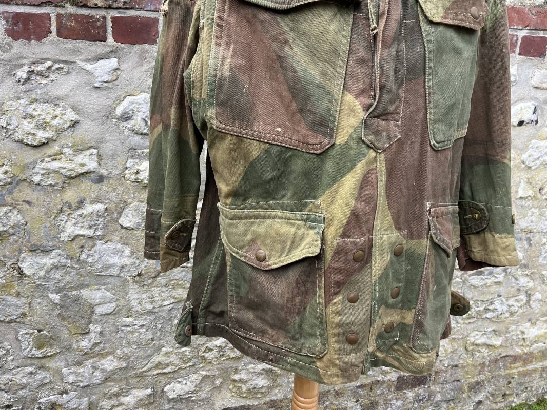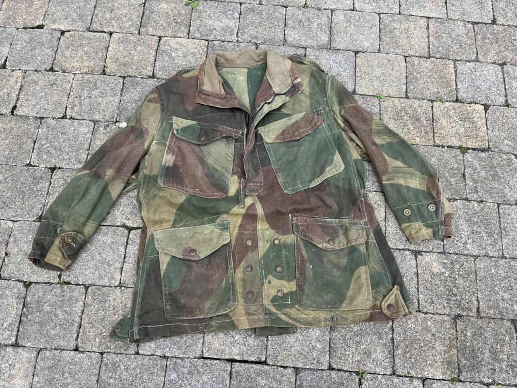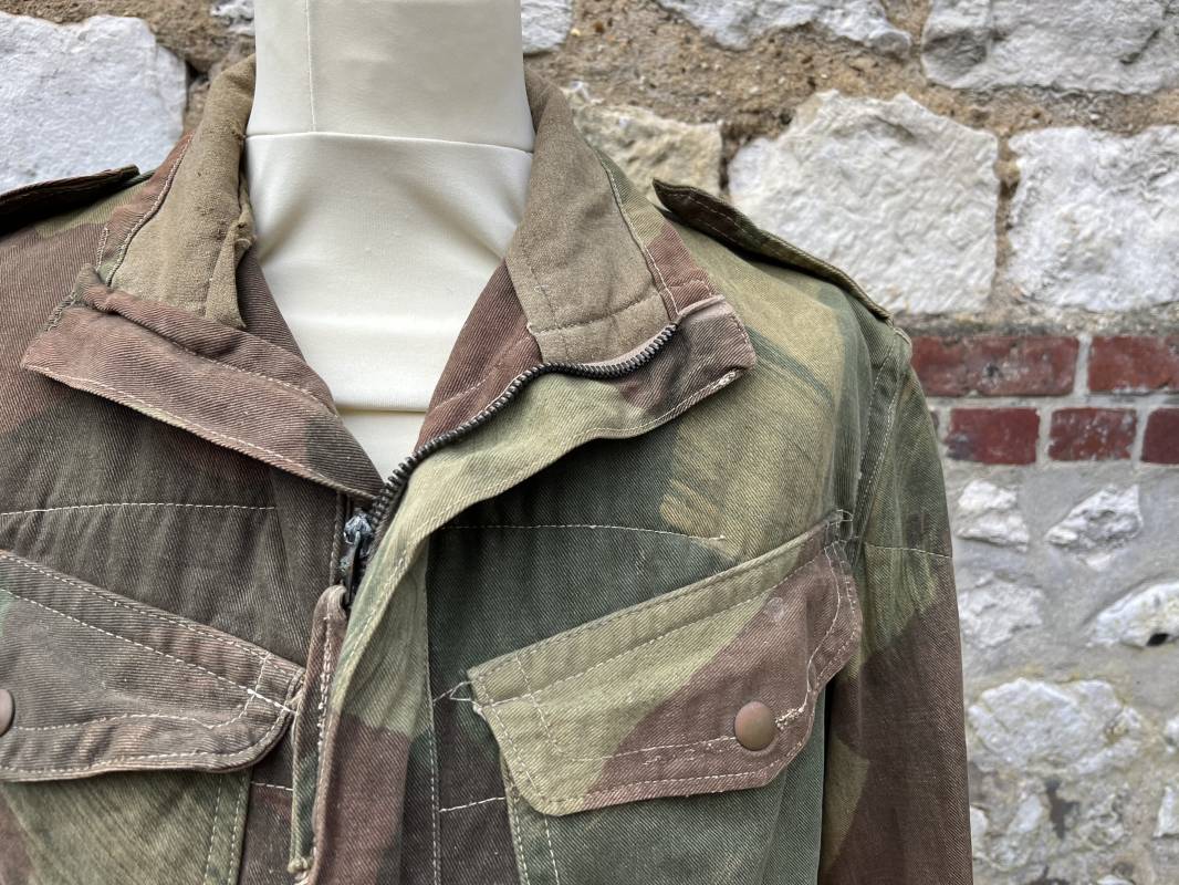 Rare blouse de saut de Parachutiste Anglais. Blouse Denison Smock du 2ème modèle . Quatre poches à fermeture par pressions en laiton du type "Newey". Fermeture par glissière à mi poitrine. Glissière d'origine et fonctionnelle Marquage fabricant Dot Made in england , tirette en coton camouflé . Pattes d'épaules, bouts des manches à pattes boutonnées.Brevet coton de parachutiste cousu d'origine sur la manche droite . Brevet coton en mauvais etat ( voir photos ) Queue de castor avec fermeture par pressions. Deux pattes de serrage à pressions sur les côtés. Etiquette coton avec marquage fabricant Gordon and Co 1944. Taille 4. Largeur d'épaules 50cm. Longueur 80cm. Manches 56cm. Belle Denison portée en bon état. Belles couleurs de camouflage. Très belle patine générale 1943/45. Rare uniforme pour commando , SAS ou parachutiste Ref 22198