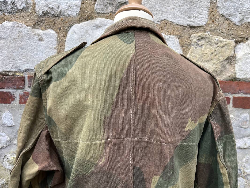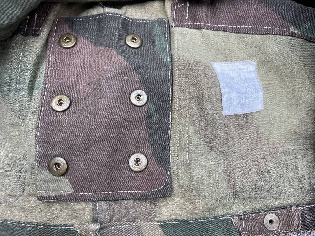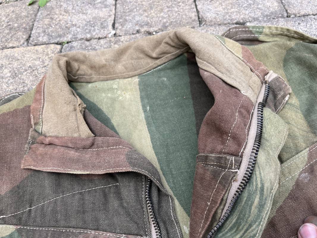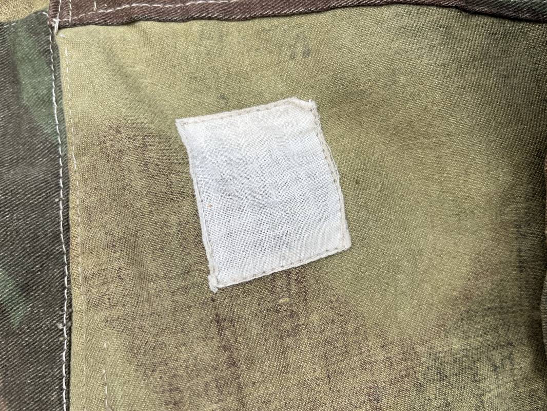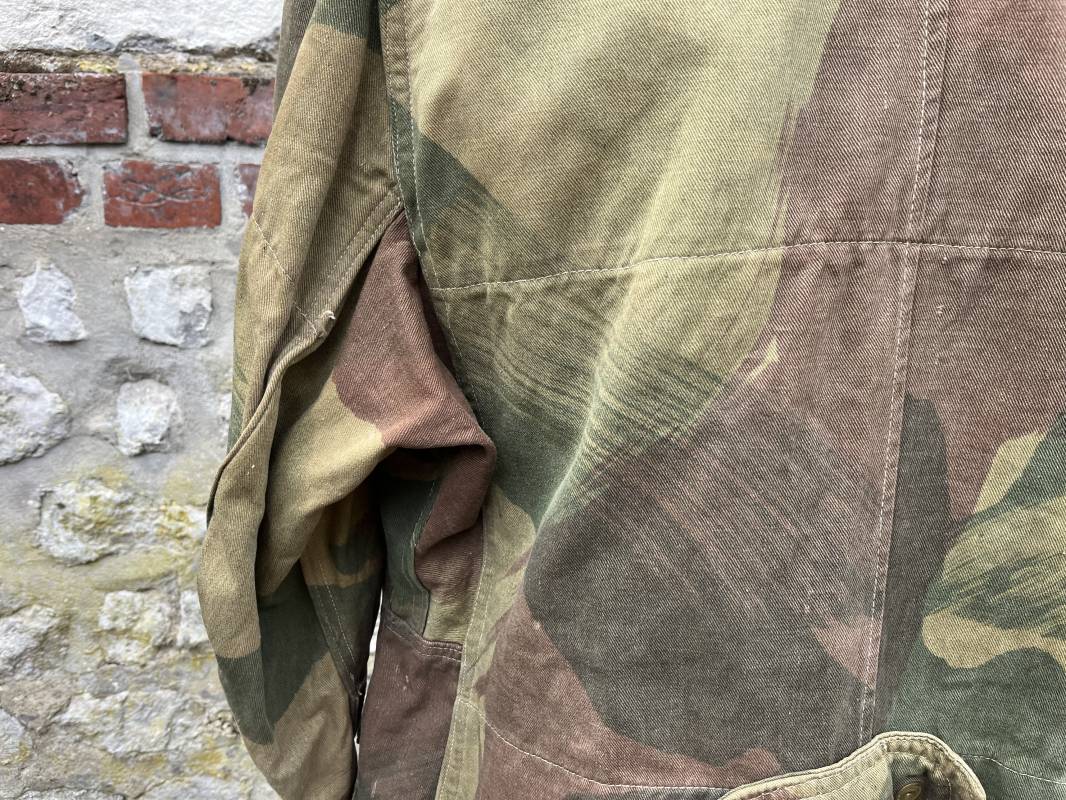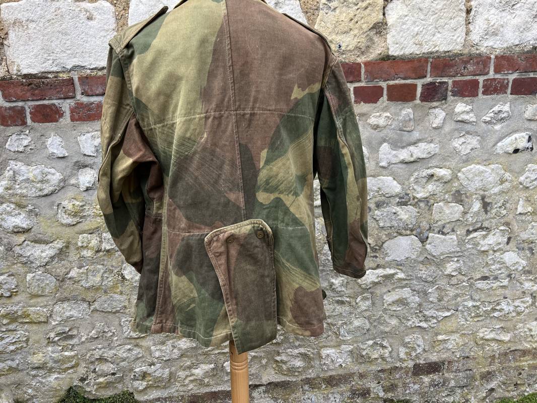 Rare blouse de saut de Parachutiste Anglais. Blouse Denison Smock du 2ème modèle . Quatre poches à fermeture par pressions en laiton du type "Newey". Fermeture par glissière à mi poitrine. Glissière d'origine et fonctionnelle Marquage fabricant Dot Made in england , tirette en coton camouflé . Pattes d'épaules, bouts des manches à pattes boutonnées.Brevet coton de parachutiste cousu d'origine sur la manche droite . Brevet coton en mauvais etat ( voir photos ) Queue de castor avec fermeture par pressions. Deux pattes de serrage à pressions sur les côtés. Etiquette coton avec marquage fabricant Gordon and Co 1944. Taille 4. Largeur d'épaules 50cm. Longueur 80cm. Manches 56cm. Belle Denison portée en bon état. Belles couleurs de camouflage. Très belle patine générale 1943/45. Rare uniforme pour commando , SAS ou parachutiste Ref 22198