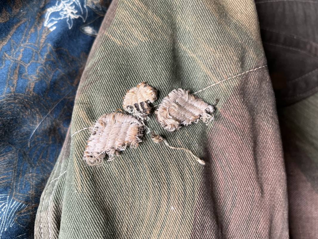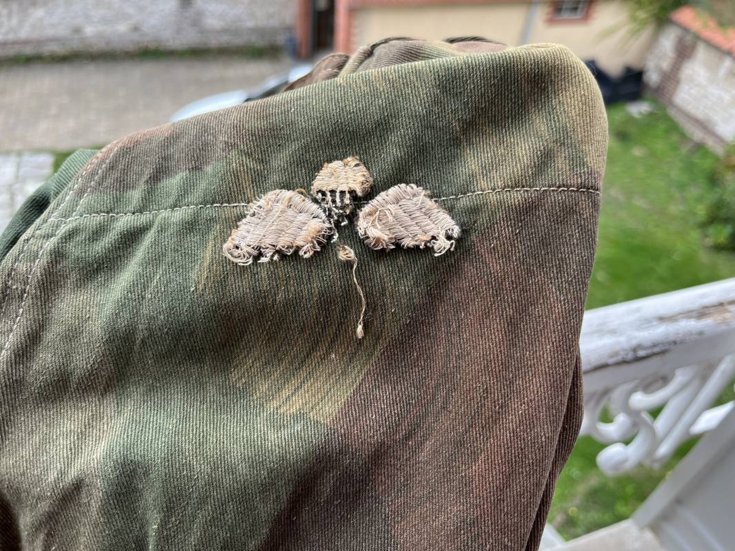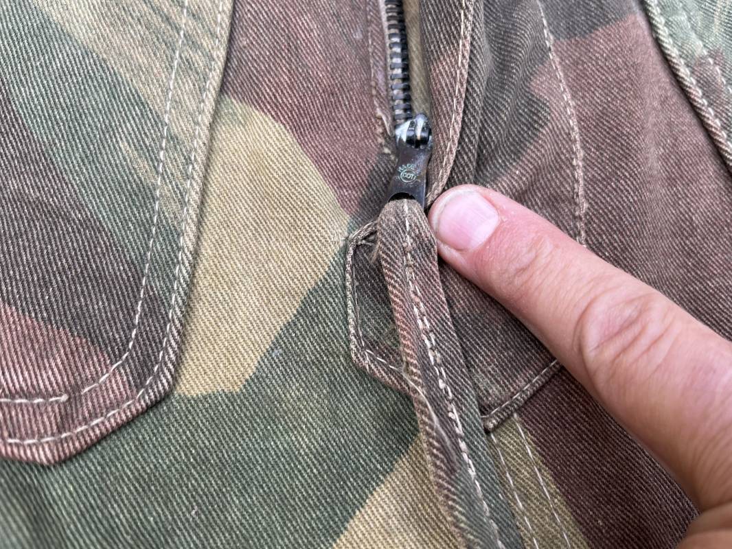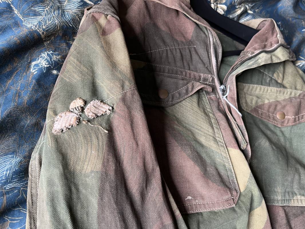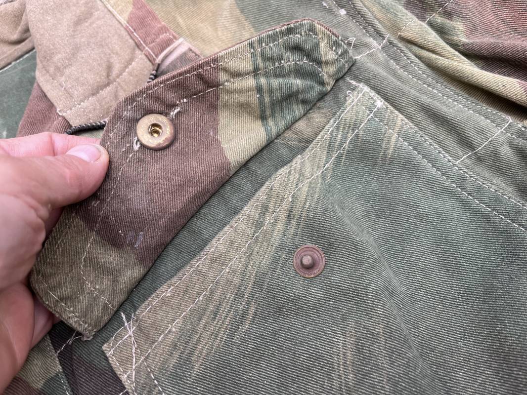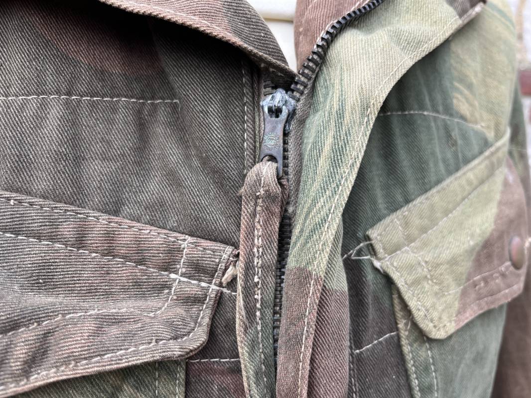 Rare blouse de saut de Parachutiste Anglais. Blouse Denison Smock du 2ème modèle . Quatre poches à fermeture par pressions en laiton du type "Newey". Fermeture par glissière à mi poitrine. Glissière d'origine et fonctionnelle Marquage fabricant Dot Made in england , tirette en coton camouflé . Pattes d'épaules, bouts des manches à pattes boutonnées.Brevet coton de parachutiste cousu d'origine sur la manche droite . Brevet coton en mauvais etat ( voir photos ) Queue de castor avec fermeture par pressions. Deux pattes de serrage à pressions sur les côtés. Etiquette coton avec marquage fabricant Gordon and Co 1944. Taille 4. Largeur d'épaules 50cm. Longueur 80cm. Manches 56cm. Belle Denison portée en bon état. Belles couleurs de camouflage. Très belle patine générale 1943/45. Rare uniforme pour commando , SAS ou parachutiste Ref 22198