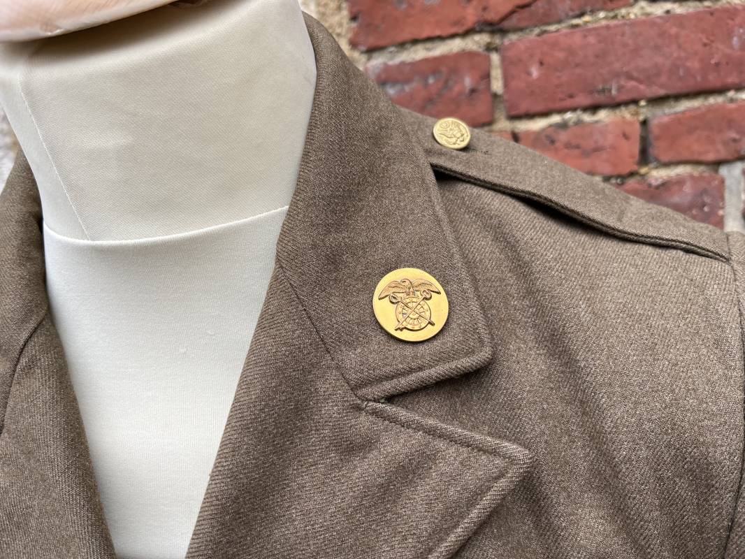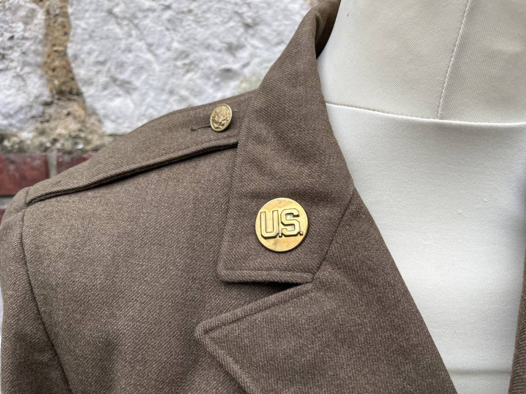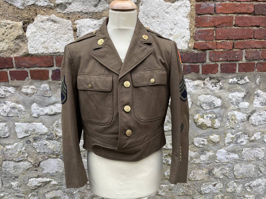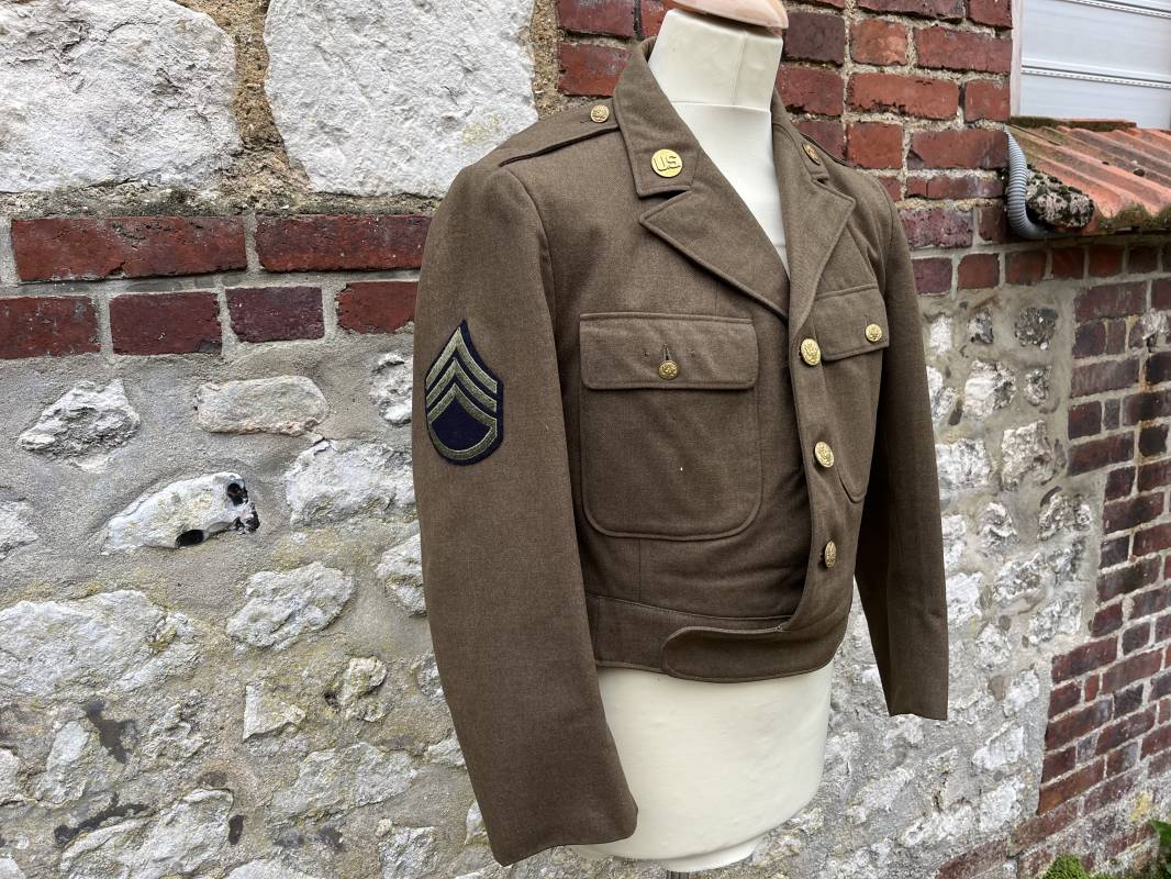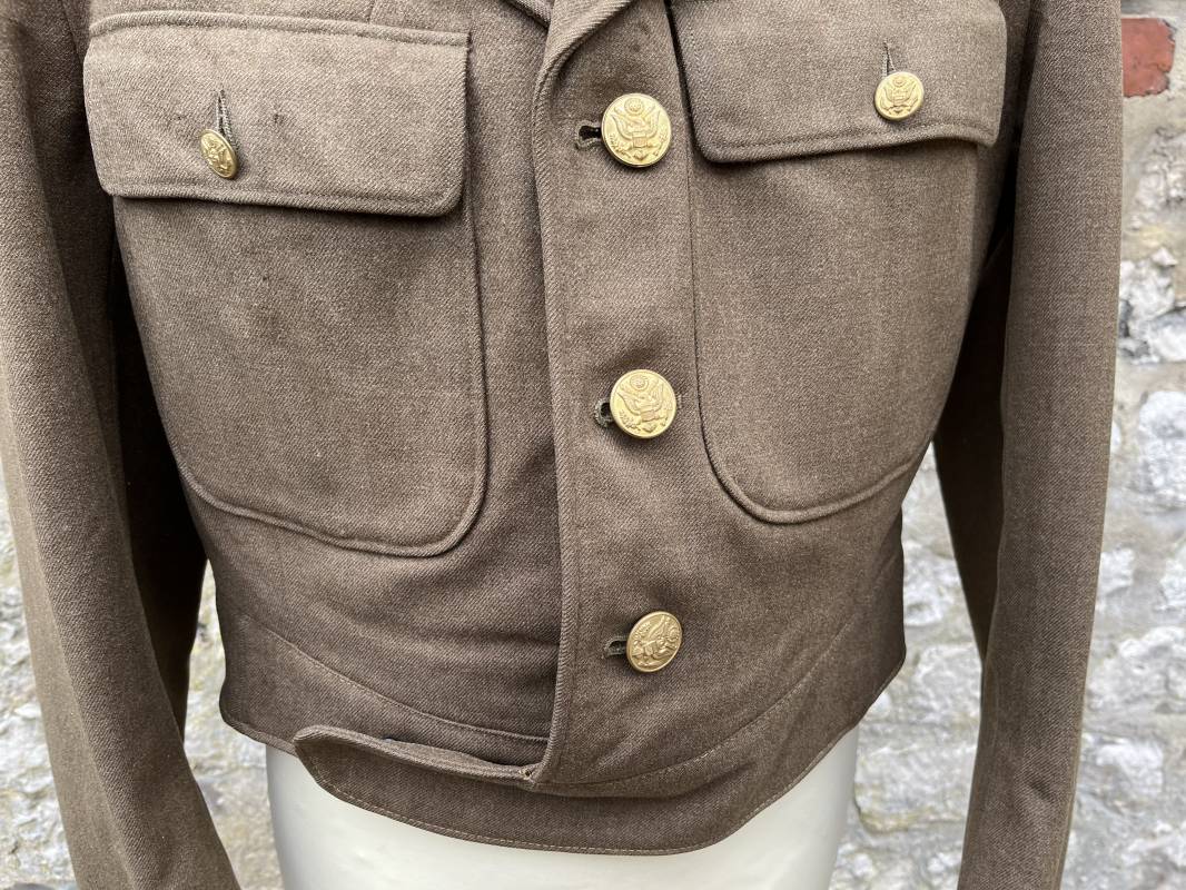 Blouson mdle 1944 d 'un sous officier de l'etat major de l' ETO ( Europeen Theater of Operations ) Blouson Jacket Fild Wool OD M44 . ' Ike Jacket ' en laine kaki . Col ouvert , fermeture frontale a boutons dorés avec aigle américain . Pattes de col a disque du Quarter Master corps ( état major) . Galon de grade de manche de Staff sergeant , service stripes et overseas service bars en bas de manche gauche . Deux poches de poitrine . Insigne ETO sur le haut de la manche gauche . Tous les insignes sont cousus d'origine . Intérieur doublé en satnette kaki . Tampons encre matricule et taille 40 L . Largeur épaules45 cm longueur 55 cm , manche 57 cm . Blouson légérement porté en parfait état 1944/45 Ref 21088