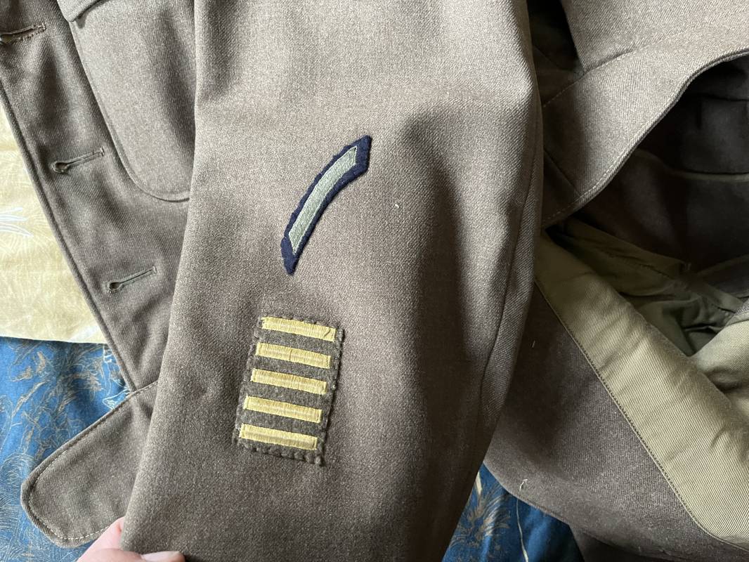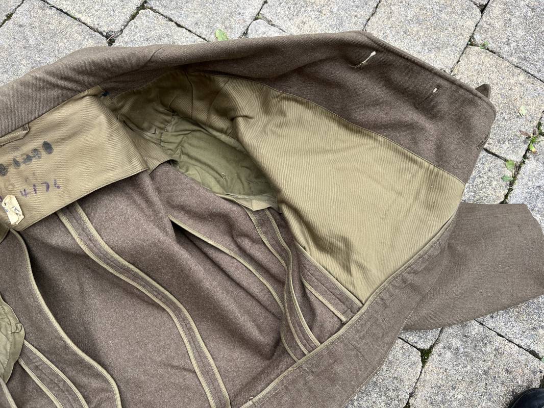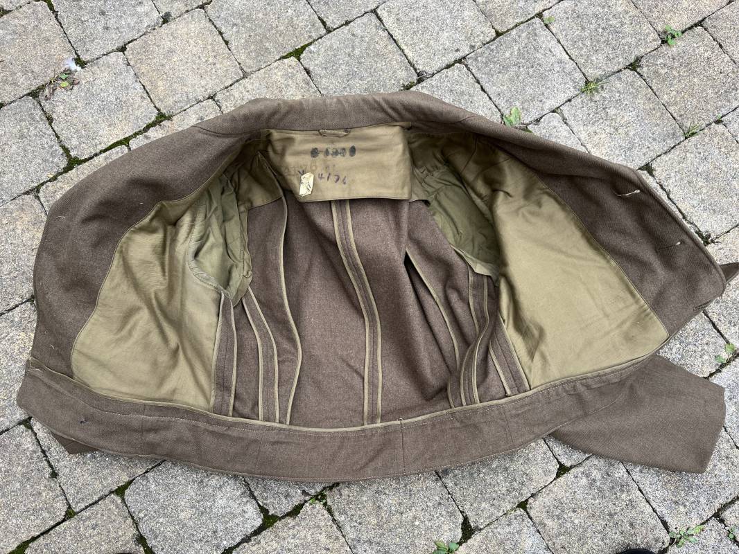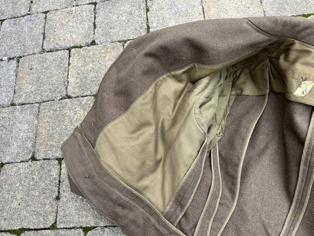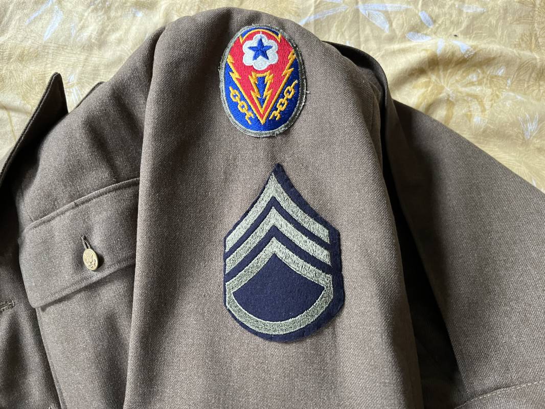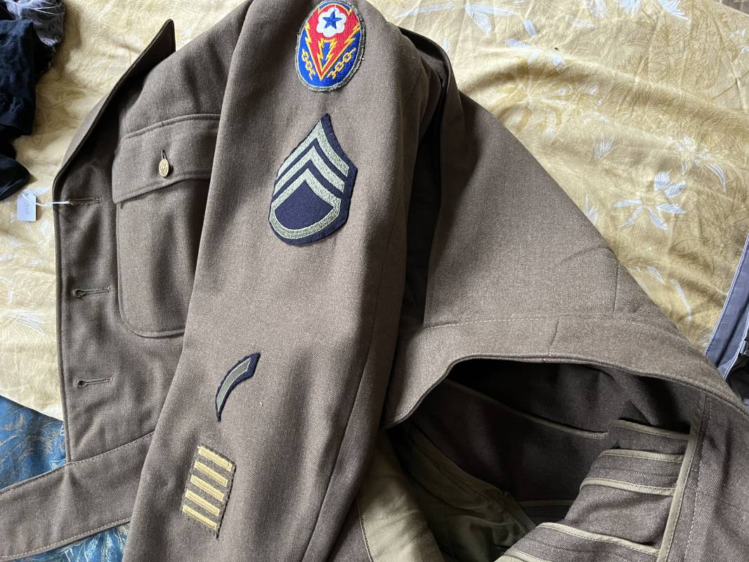 Blouson mdle 1944 d 'un sous officier de l'etat major de l' ETO ( Europeen Theater of Operations ) Blouson Jacket Fild Wool OD M44 . ' Ike Jacket ' en laine kaki . Col ouvert , fermeture frontale a boutons dorés avec aigle américain . Pattes de col a disque du Quarter Master corps ( état major) . Galon de grade de manche de Staff sergeant , service stripes et overseas service bars en bas de manche gauche . Deux poches de poitrine . Insigne ETO sur le haut de la manche gauche . Tous les insignes sont cousus d'origine . Intérieur doublé en satnette kaki . Tampons encre matricule et taille 40 L . Largeur épaules45 cm longueur 55 cm , manche 57 cm . Blouson légérement porté en parfait état 1944/45 Ref 21088