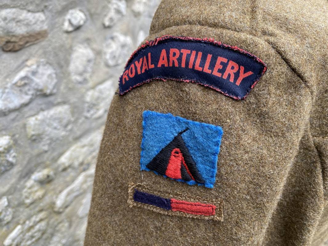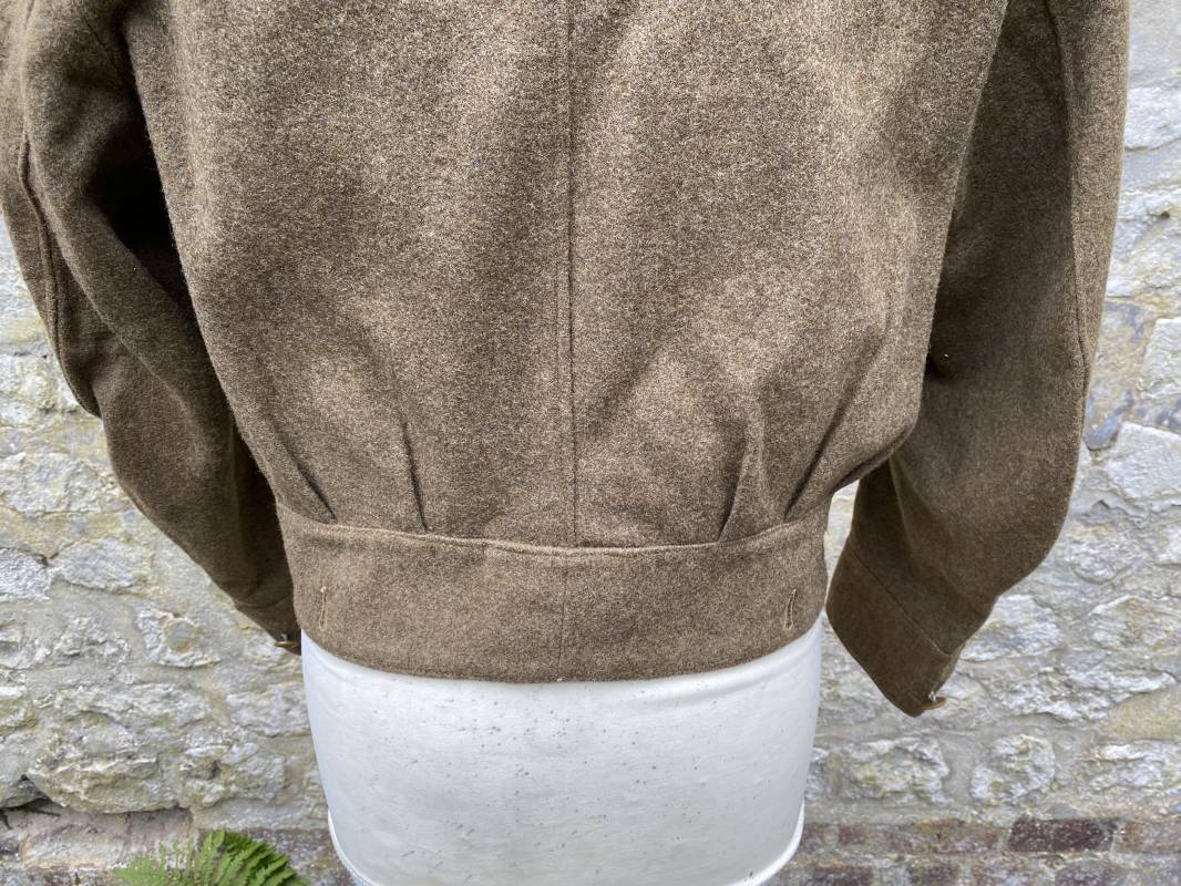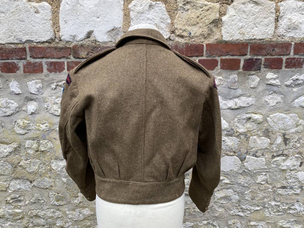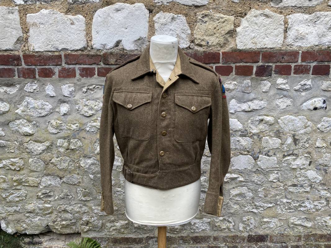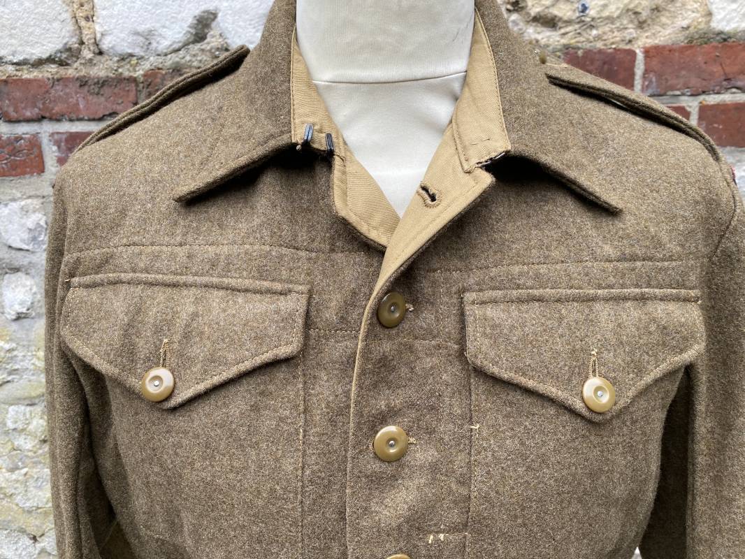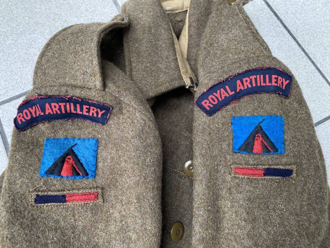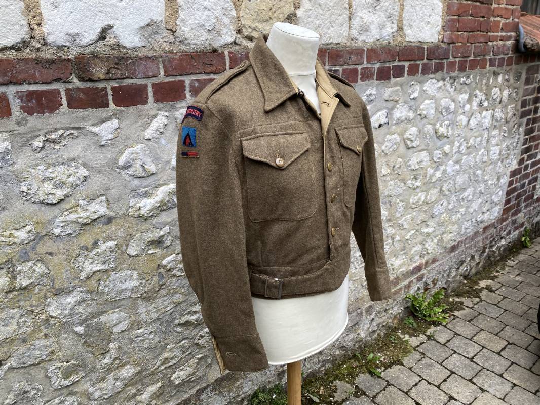 Rare blouson Battle dress pattern 1940 d'un Artilleur de la 59ème Division d'Infanterie (Staffordishine). Blouson réglementaire en drap kaki trouvé en collection en Normandie . Deux poches de poitrine. Col avec crochets métalliques. Pattes d'épaules en drap. Boutons en plastique cousus d'origine , ceinture en drap et boucle métallique. Intérieur doublé en coton beige. Etiquette fabricant daté 1942 taille 6. Tampon encre noir WD code O (année 1942). Insigne de manche cousus machine et mains ; Insignes Divisionnaires de la 59ème DI du modèle brodé ,monté mains . Titles Royal Artillery du modèle imprimé montés machine. Strips du modèle brodé montés machine , drap de fond kaki et aux strips aux couleurs de l'Artillerie (rouge et bleu). Blouson légèrement porté en parfait état. Largeur d'épaules 43cm. Longueur 57cm. Manches 58cm. Beau blouson d'un soldat de la bataille de Normandie 1944 Ref 16416
