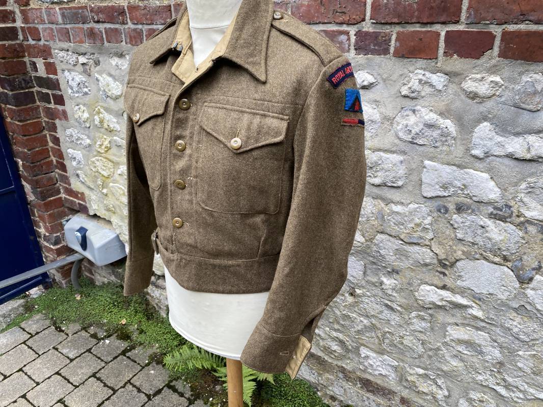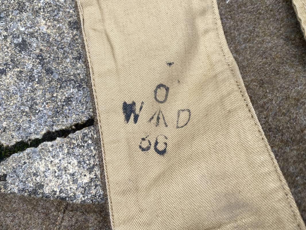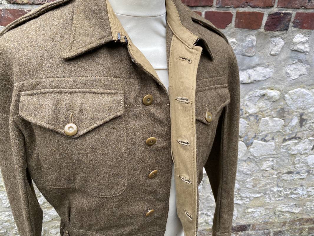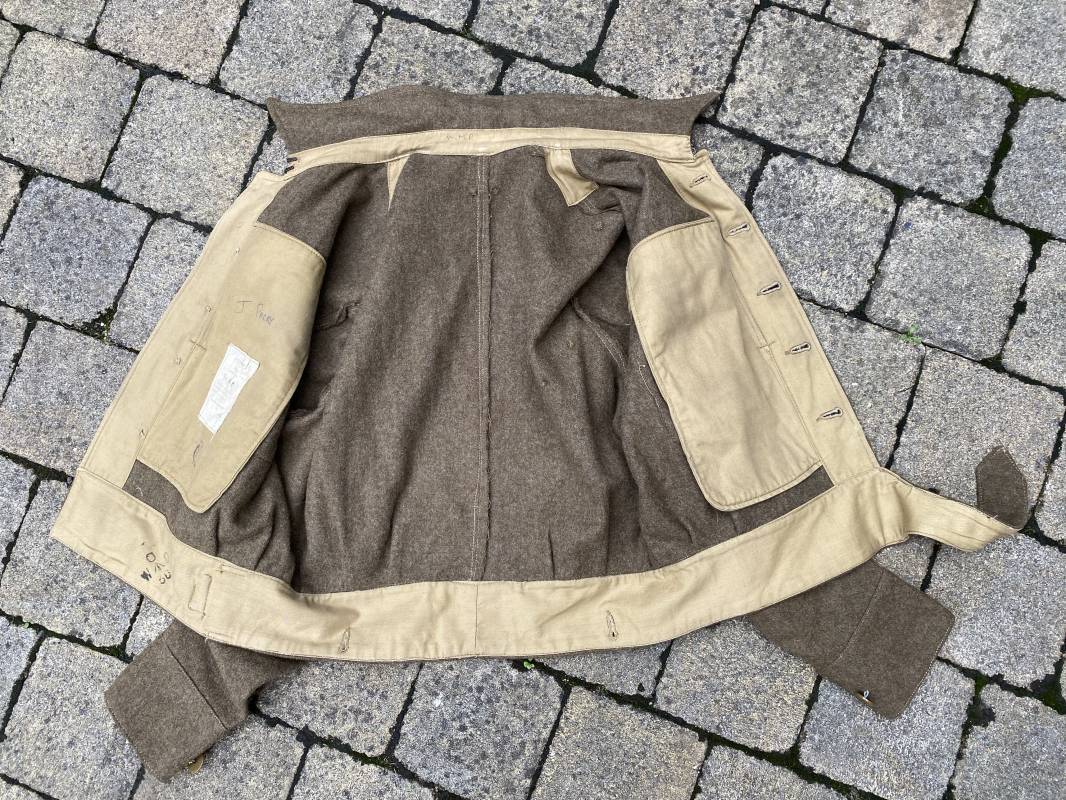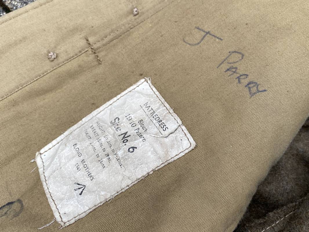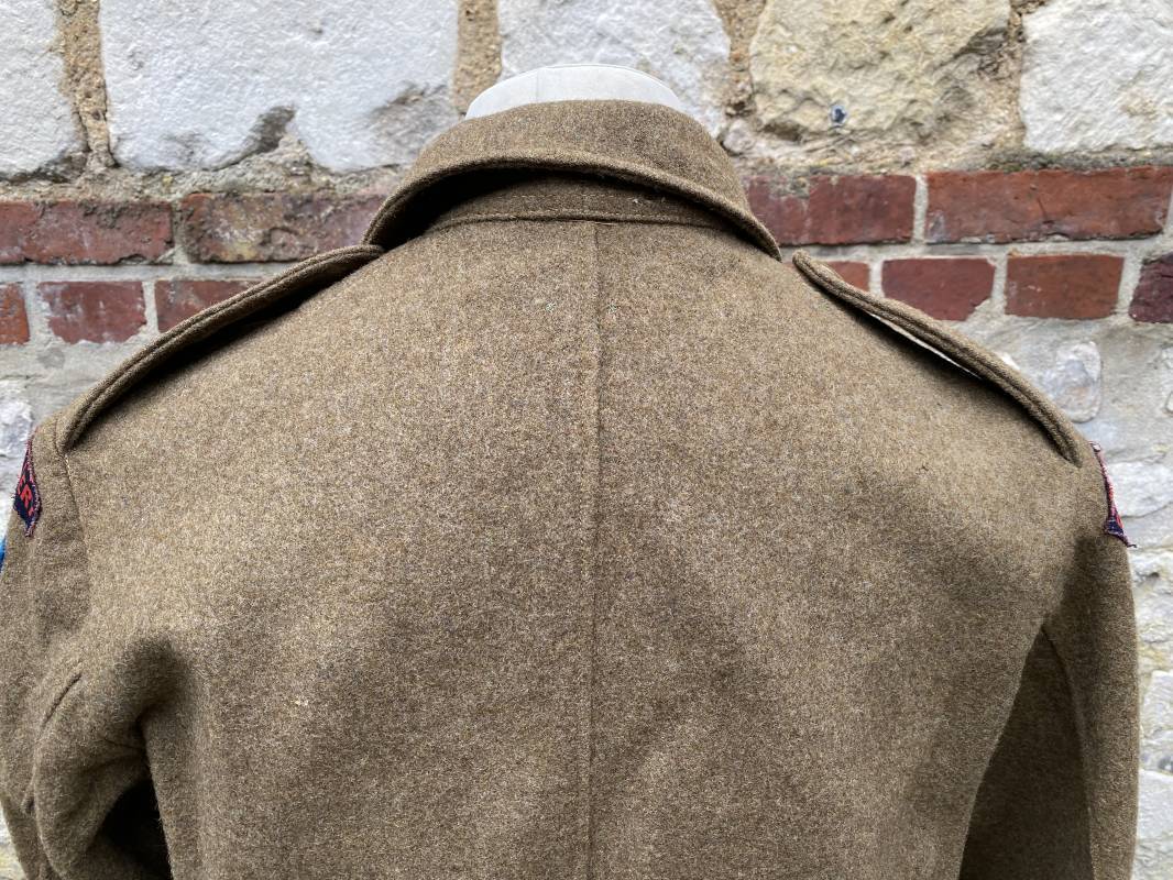 Rare blouson Battle dress pattern 1940 d'un Artilleur de la 59ème Division d'Infanterie (Staffordishine). Blouson réglementaire en drap kaki trouvé en collection en Normandie . Deux poches de poitrine. Col avec crochets métalliques. Pattes d'épaules en drap. Boutons en plastique cousus d'origine , ceinture en drap et boucle métallique. Intérieur doublé en coton beige. Etiquette fabricant daté 1942 taille 6. Tampon encre noir WD code O (année 1942). Insigne de manche cousus machine et mains ; Insignes Divisionnaires de la 59ème DI du modèle brodé ,monté mains . Titles Royal Artillery du modèle imprimé montés machine. Strips du modèle brodé montés machine , drap de fond kaki et aux strips aux couleurs de l'Artillerie (rouge et bleu). Blouson légèrement porté en parfait état. Largeur d'épaules 43cm. Longueur 57cm. Manches 58cm. Beau blouson d'un soldat de la bataille de Normandie 1944 Ref 16416