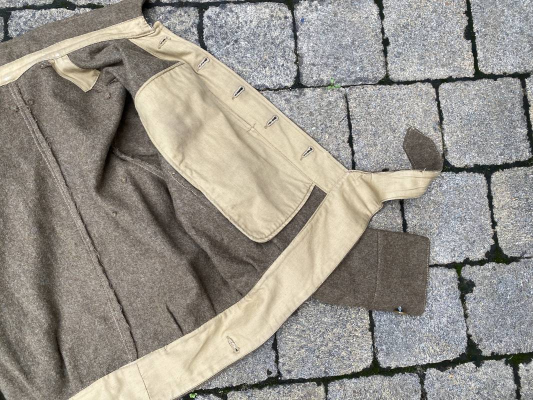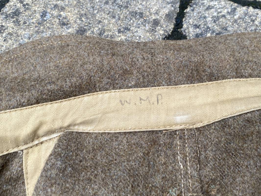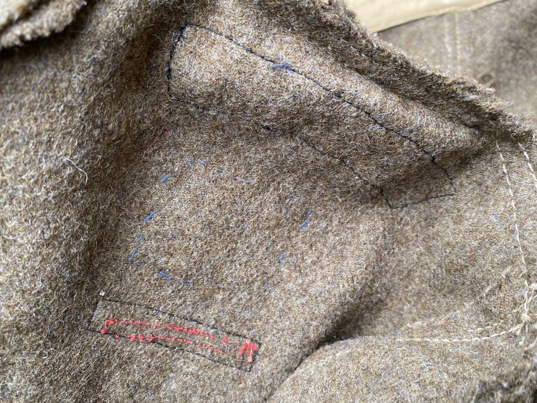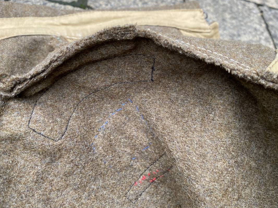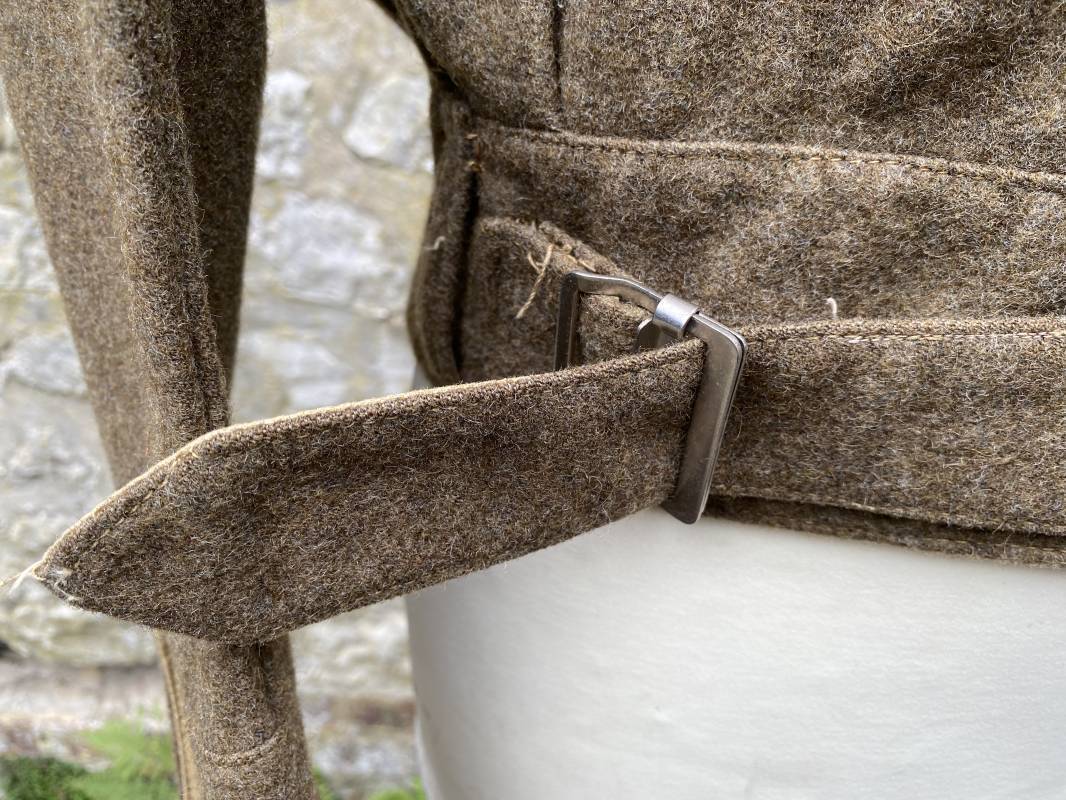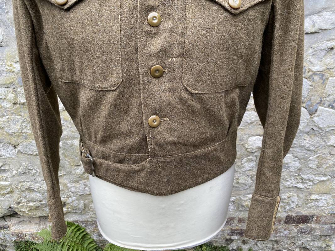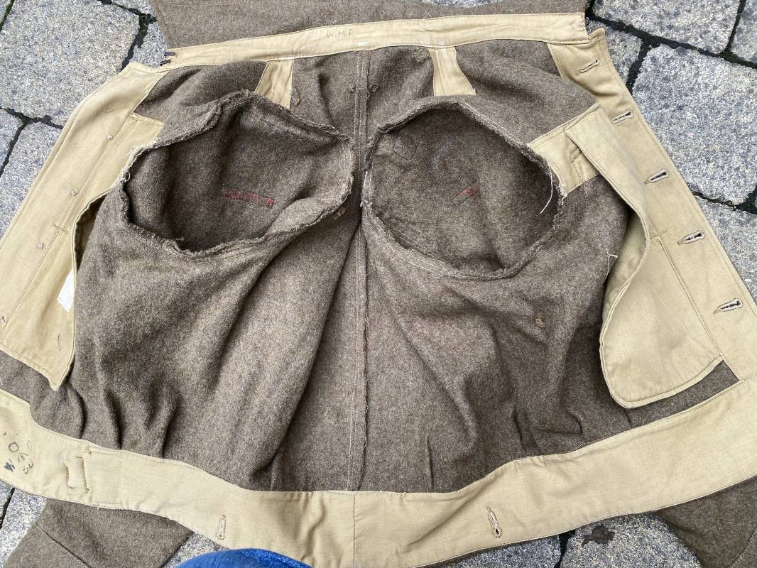 Rare blouson Battle dress pattern 1940 d'un Artilleur de la 59ème Division d'Infanterie (Staffordishine). Blouson réglementaire en drap kaki trouvé en collection en Normandie . Deux poches de poitrine. Col avec crochets métalliques. Pattes d'épaules en drap. Boutons en plastique cousus d'origine , ceinture en drap et boucle métallique. Intérieur doublé en coton beige. Etiquette fabricant daté 1942 taille 6. Tampon encre noir WD code O (année 1942). Insigne de manche cousus machine et mains ; Insignes Divisionnaires de la 59ème DI du modèle brodé ,monté mains . Titles Royal Artillery du modèle imprimé montés machine. Strips du modèle brodé montés machine , drap de fond kaki et aux strips aux couleurs de l'Artillerie (rouge et bleu). Blouson légèrement porté en parfait état. Largeur d'épaules 43cm. Longueur 57cm. Manches 58cm. Beau blouson d'un soldat de la bataille de Normandie 1944 Ref 16416