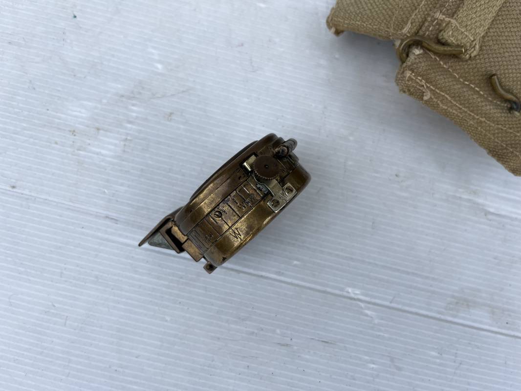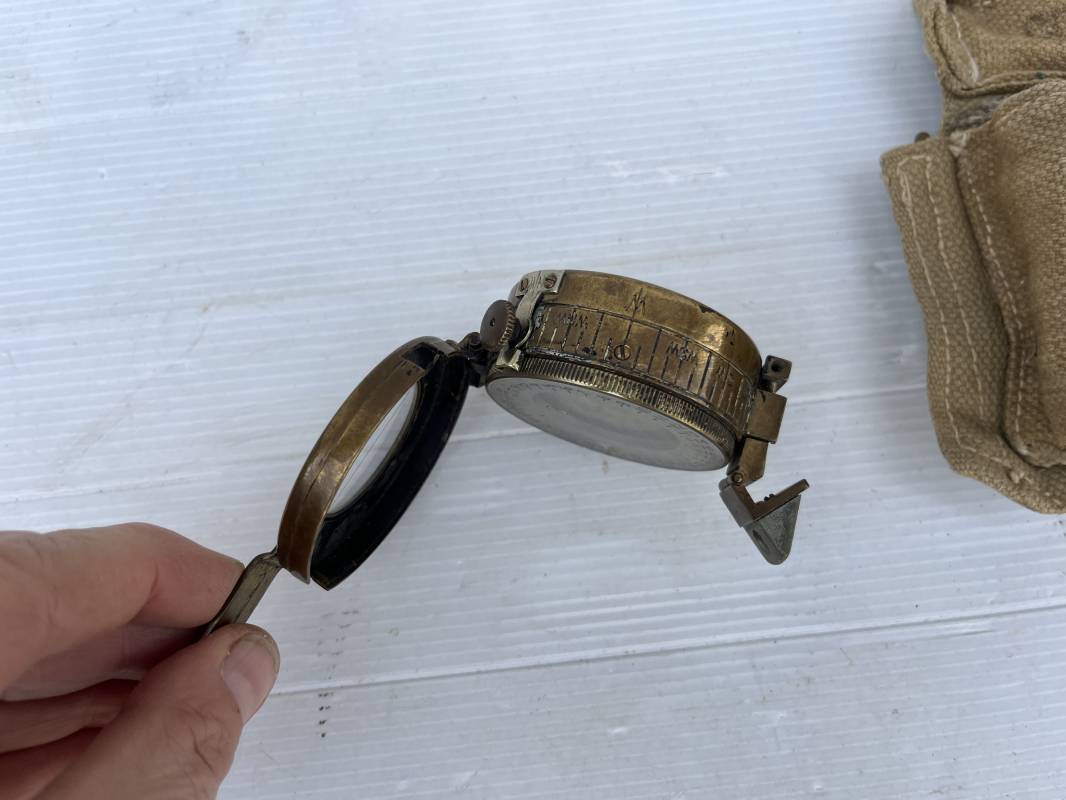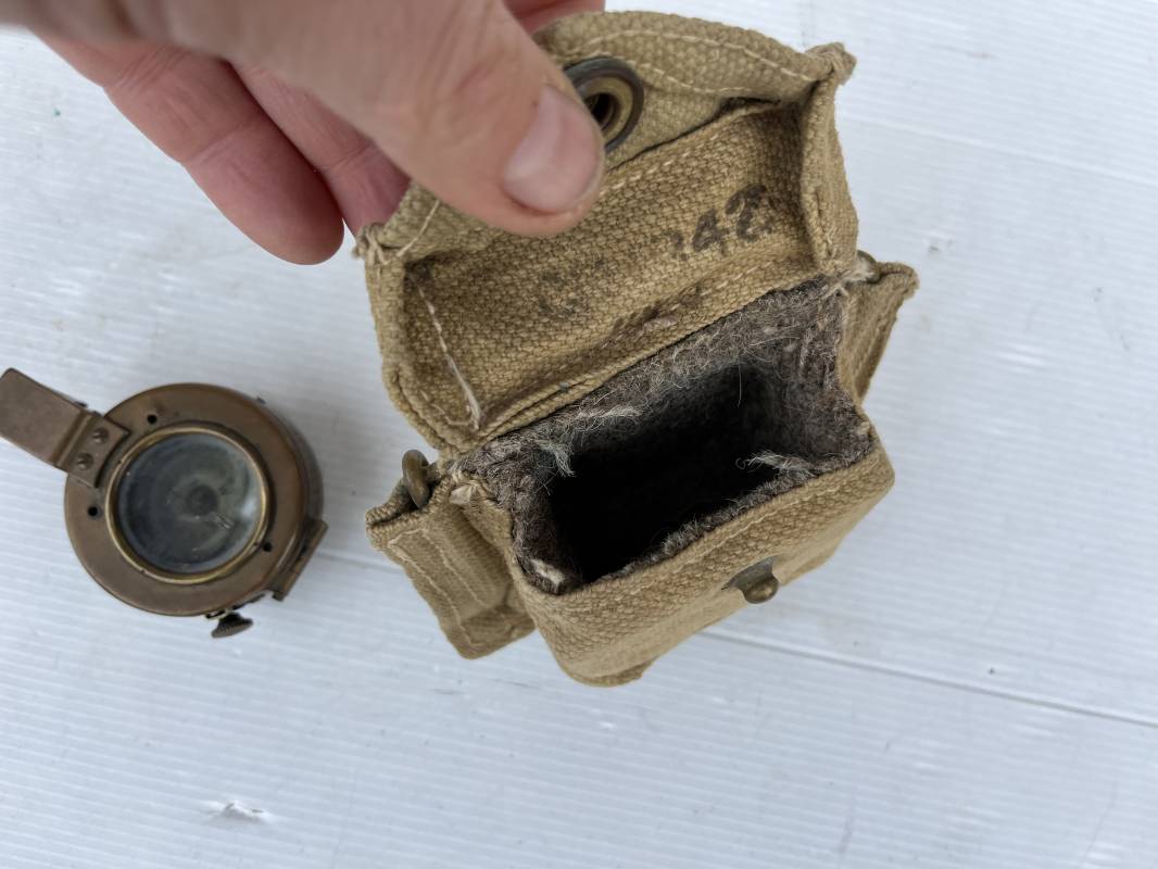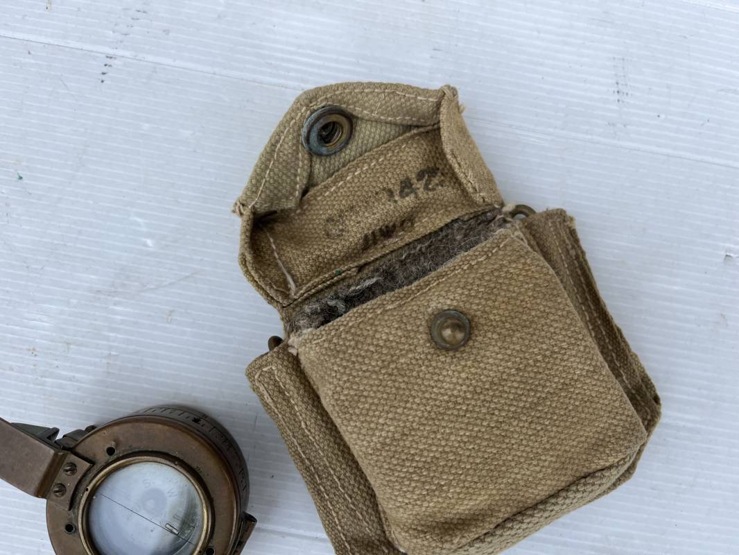 Belle boussole reglementaire MKIII et sa pochette en toile pattern 1937 . Boussole en laiton , cadran avec aiguille et millièmes , rabat escamotable . Etat de fonctionnement . Marquage fabricant T.G. Ltd London 1941 . Pochette porte boussole pattern 1937 en coton filé beige et intérieur doublé en feutrine grise , rabat avec pression Marquage fabricant daté 1942 Crochets en laiton de fixation sur le derière . Bel ensemble en parfait état Ref 21429
