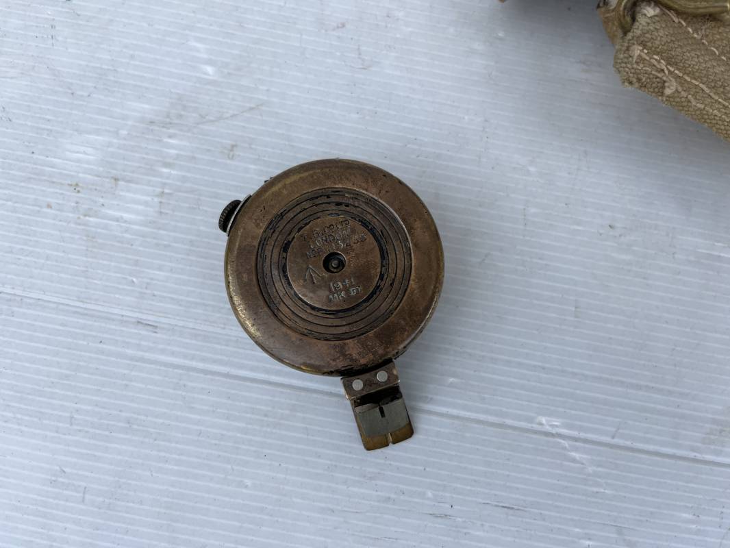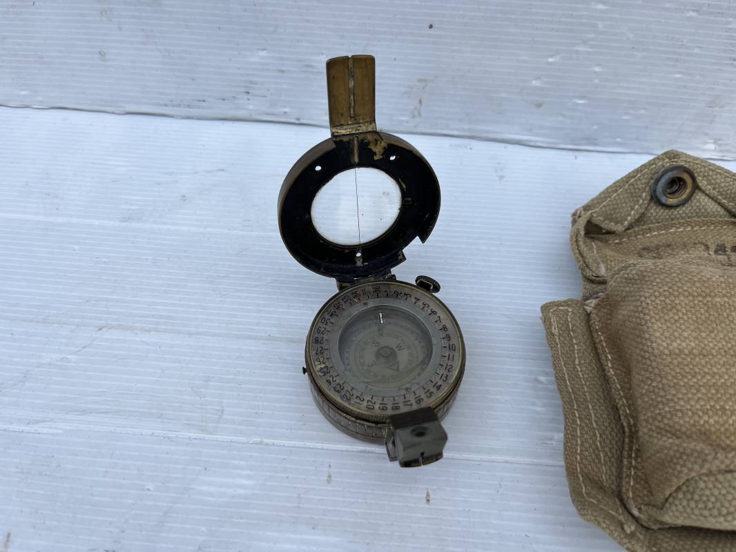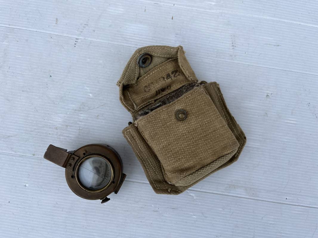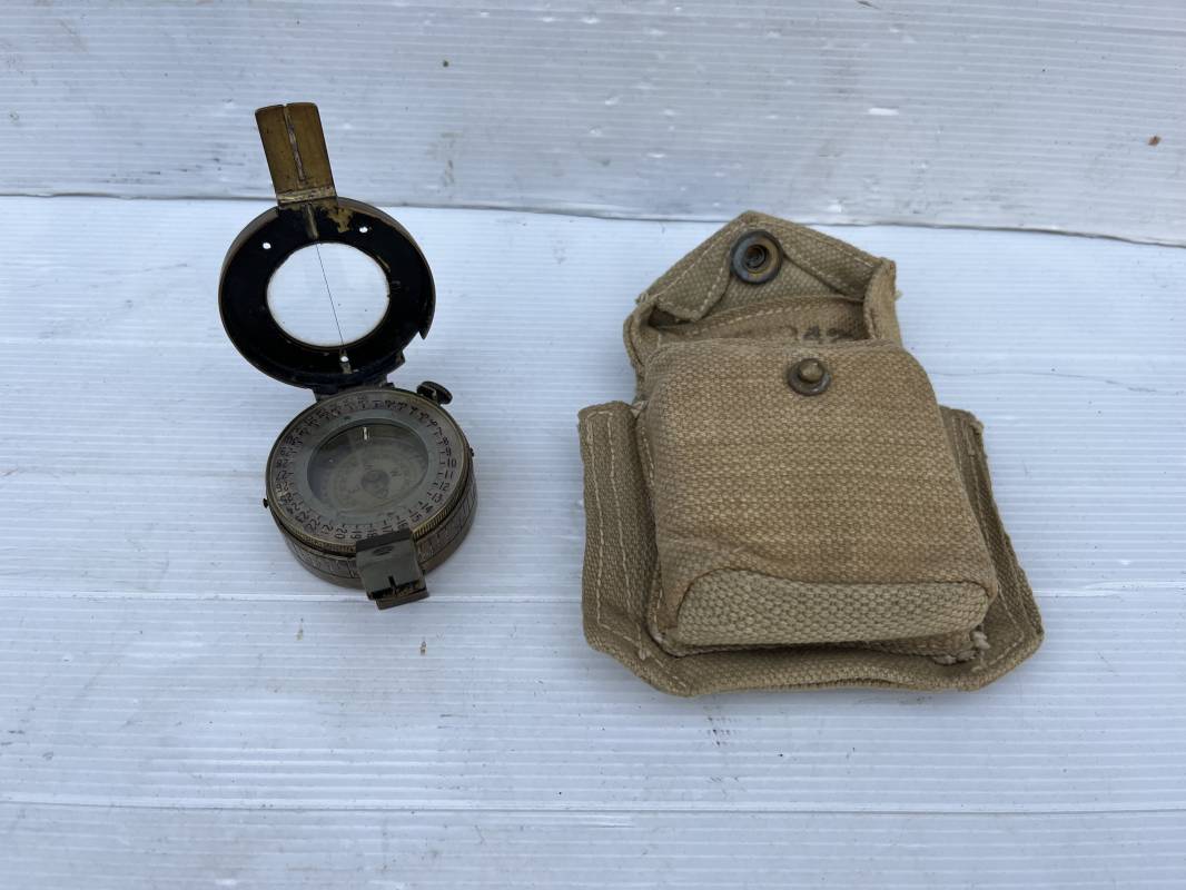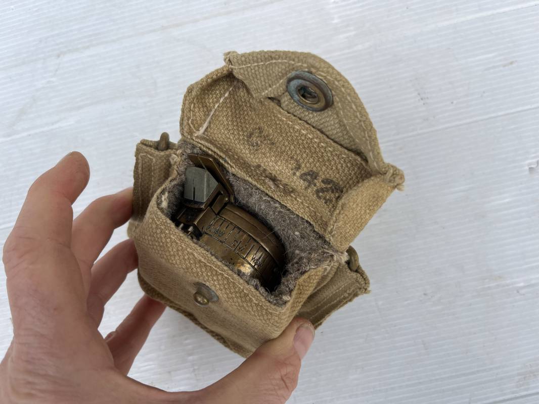Belle boussole reglementaire MKIII et sa pochette en toile pattern 1937 . Boussole en laiton , cadran avec aiguille et millièmes , rabat escamotable . Etat de fonctionnement . Marquage fabricant T.G. Ltd London 1941 . Pochette porte boussole pattern 1937 en coton filé beige et intérieur doublé en feutrine grise , rabat avec pression Marquage fabricant daté 1942 Crochets en laiton de fixation sur le derière . Bel ensemble en parfait état Ref 21429