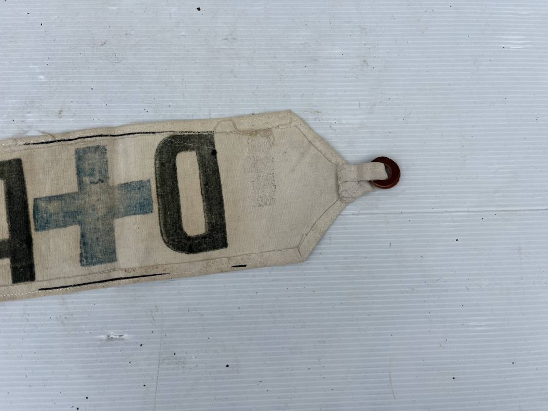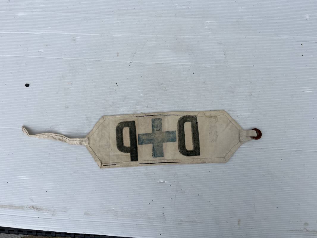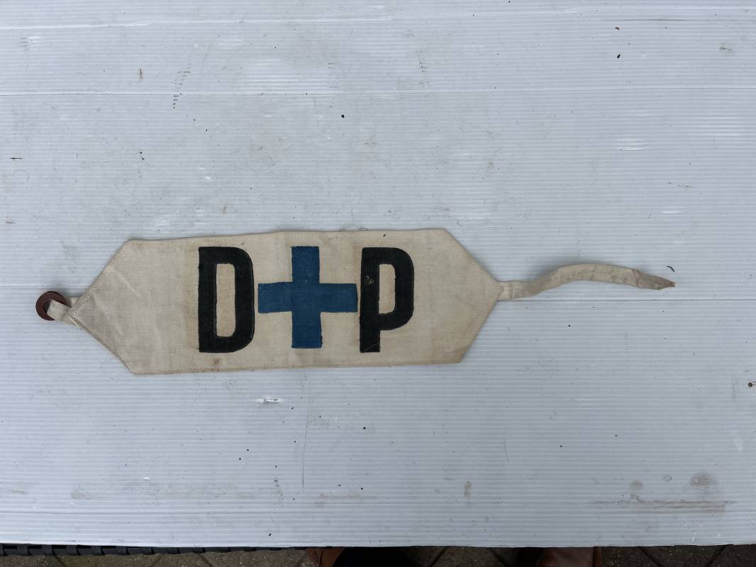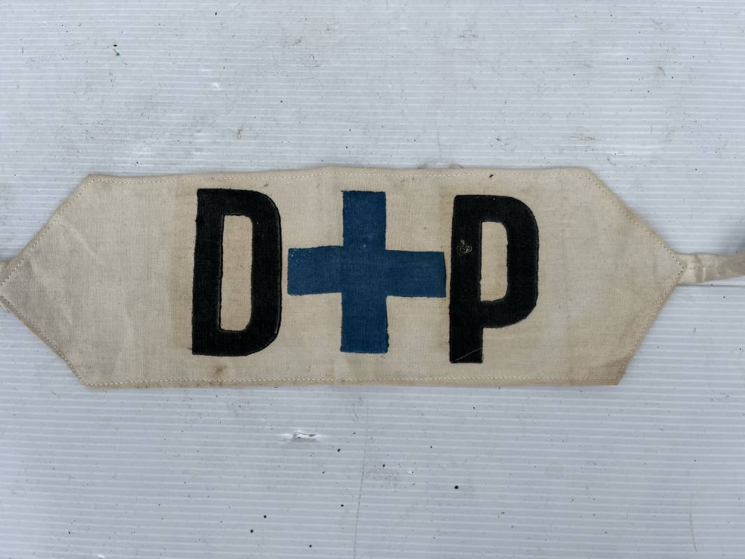 Bon brassard de la Défense Passive. Brassard en coton blanc. DP à l'encre noire et croix encre bleu. Lanière de serrage en coton et boucle cuir. Porté en bon état 1939/44. Ref 18606