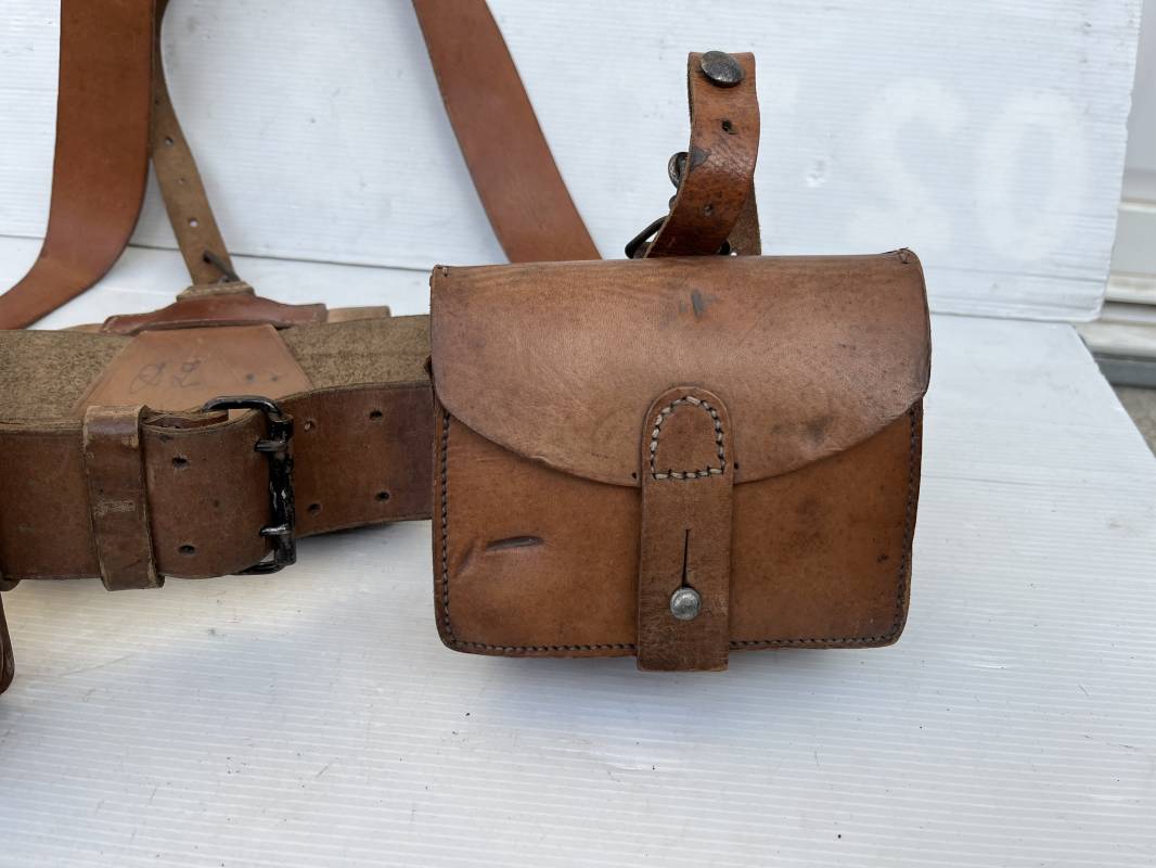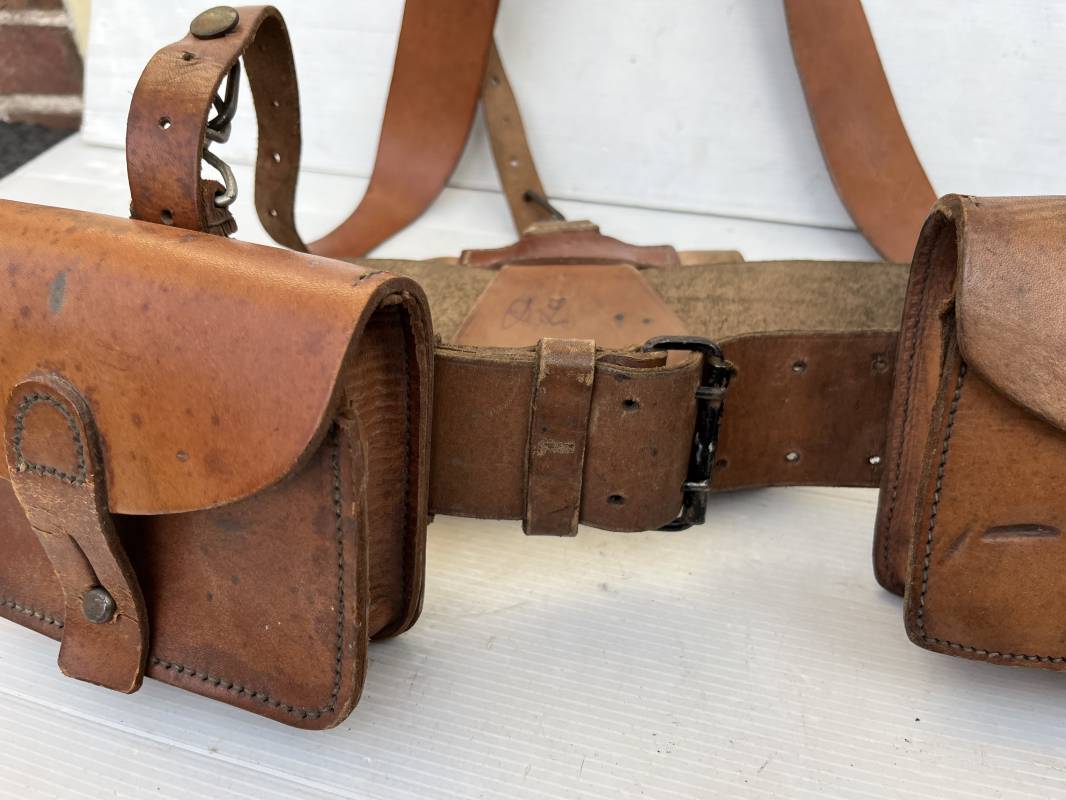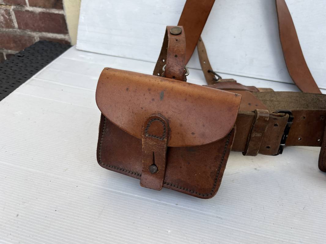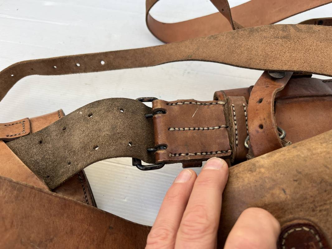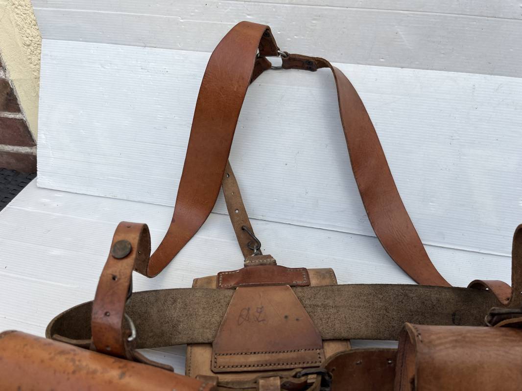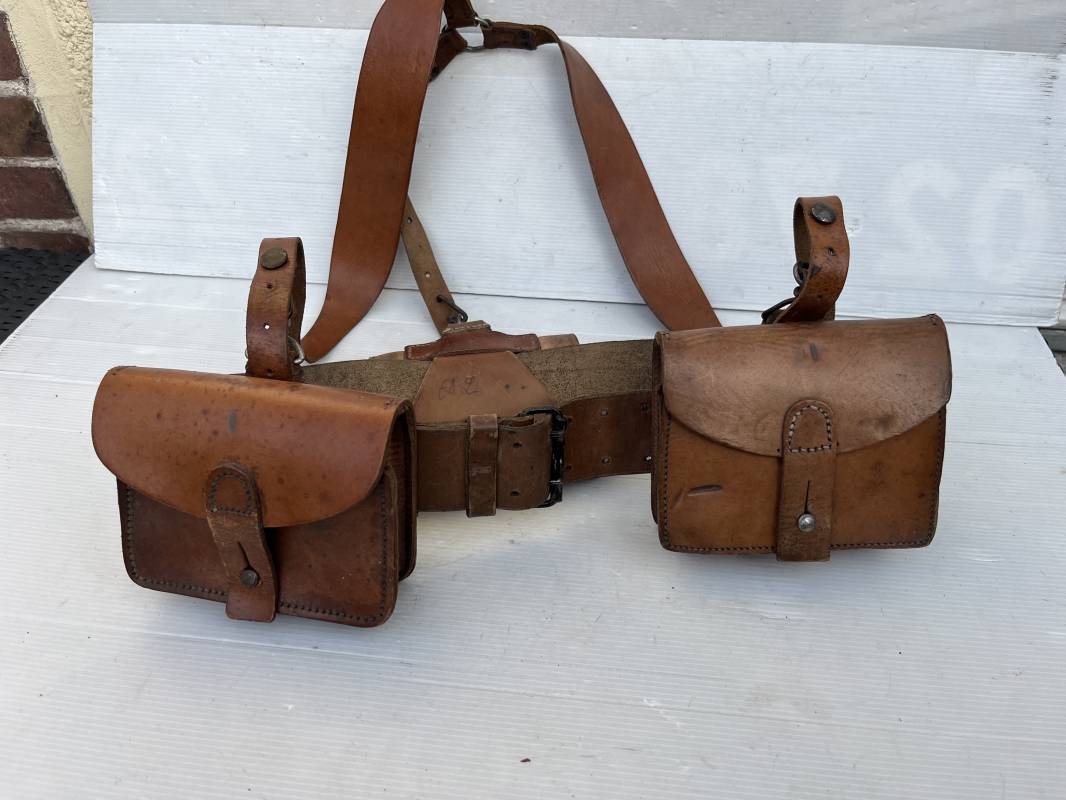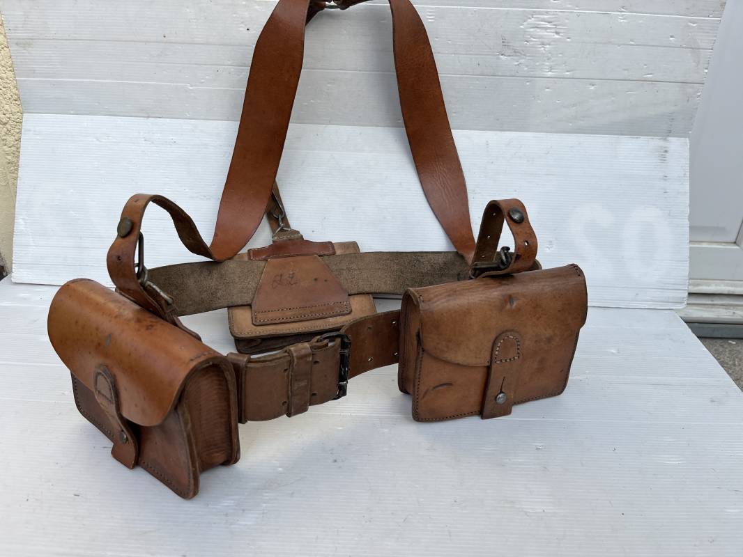 Trés beau brelage modèle 1916 en cuir marron . Ceinturon troupe modèle 1903/14 cuir souple. Longueur 115cm. Passants cuir fixe et mobile . Boucle fer peinte en noir à 2 ardillons. cuir souple , tampon encre noire rond fabricant date illisible . Trois cartouchières modèle 1916. Passants cuir de ceinturon. Crochets de suspension en fer . Marquages avec tampons oval de reception daté 1923 et 1931 . Numeros matricucles . Bretelles de suspension en cuir fauve modèle 1893/15. Fabrication rivets creux en laiton , neuf trous. Crochets de suspension métalliques . Anneau fer , tampon encre noire rond fabricant date illisible . Bel ensemble homogène, légèrement porté en trés bel état 1939/40 Ref 21703