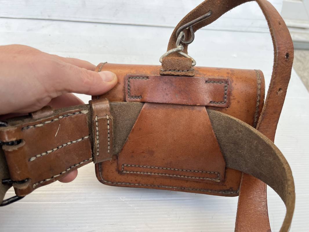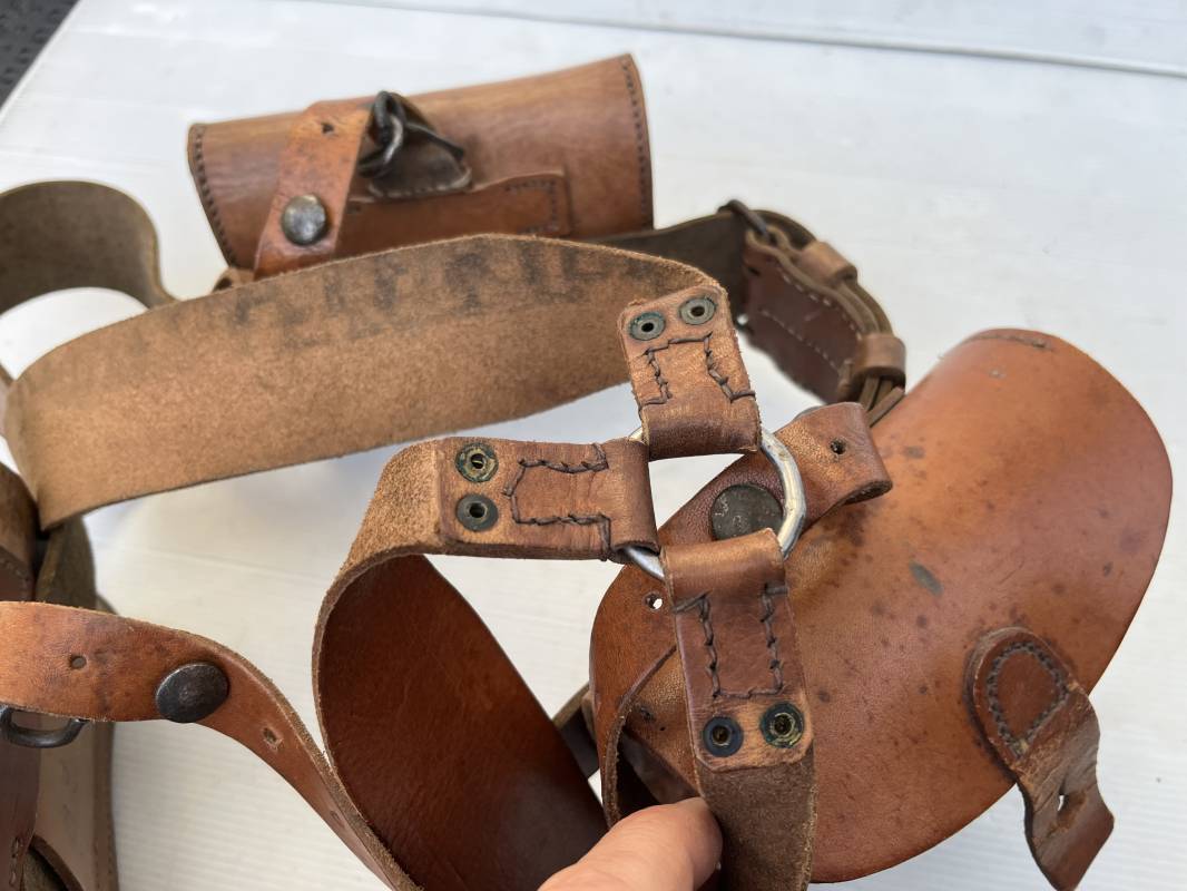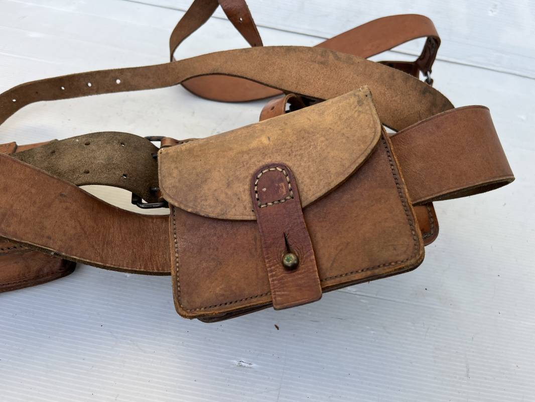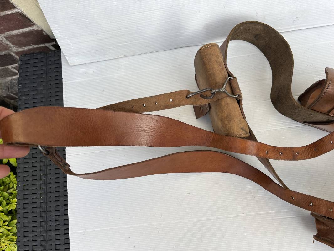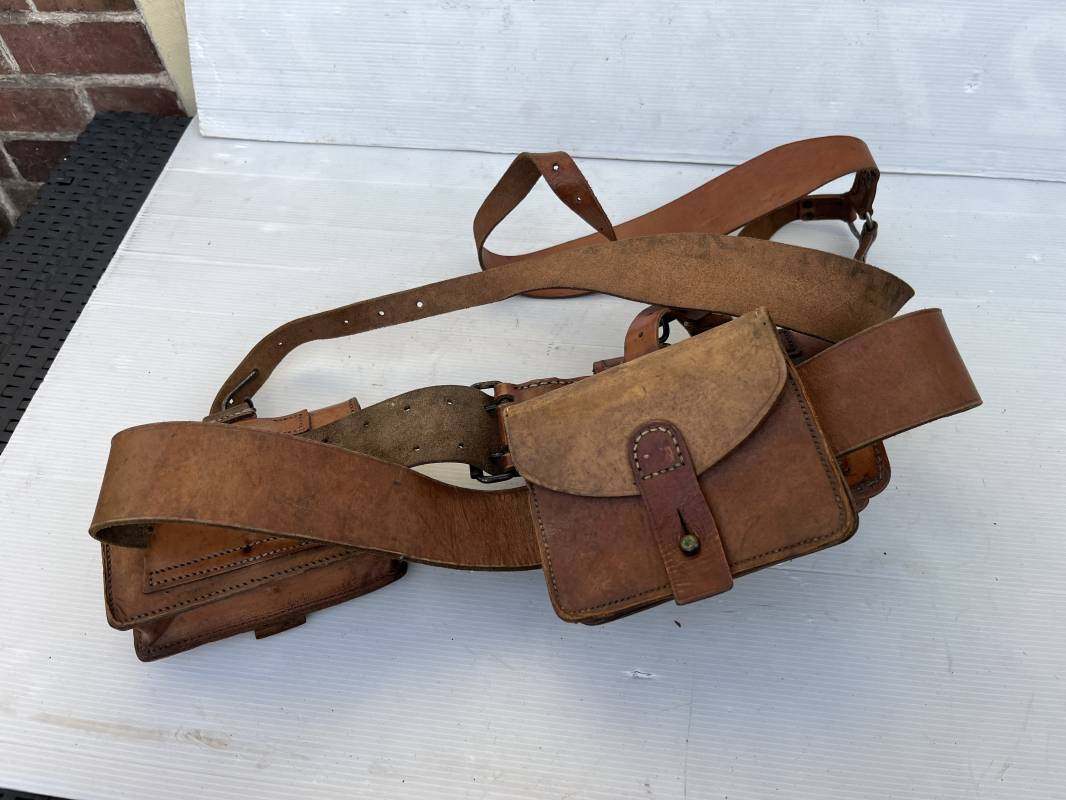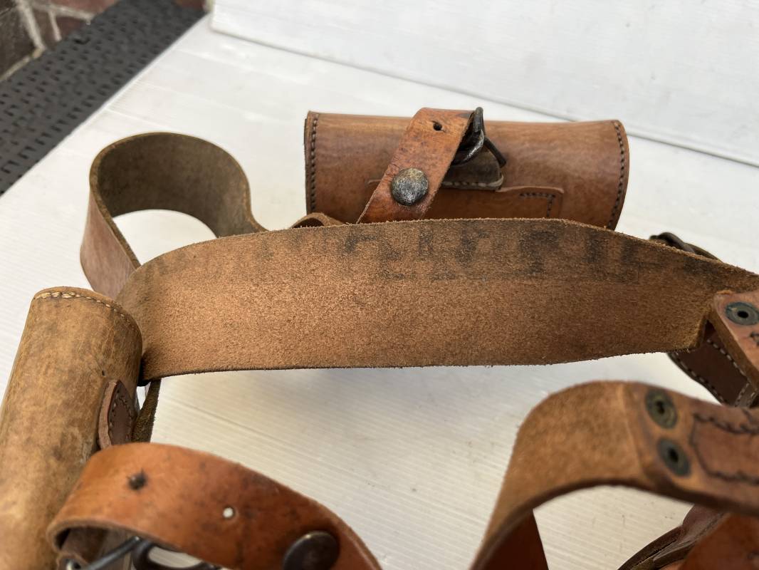 Trés beau brelage modèle 1916 en cuir marron . Ceinturon troupe modèle 1903/14 cuir souple. Longueur 115cm. Passants cuir fixe et mobile . Boucle fer peinte en noir à 2 ardillons. cuir souple , tampon encre noire rond fabricant date illisible . Trois cartouchières modèle 1916. Passants cuir de ceinturon. Crochets de suspension en fer . Marquages avec tampons oval de reception daté 1923 et 1931 . Numeros matricucles . Bretelles de suspension en cuir fauve modèle 1893/15. Fabrication rivets creux en laiton , neuf trous. Crochets de suspension métalliques . Anneau fer , tampon encre noire rond fabricant date illisible . Bel ensemble homogène, légèrement porté en trés bel état 1939/40 Ref 21703