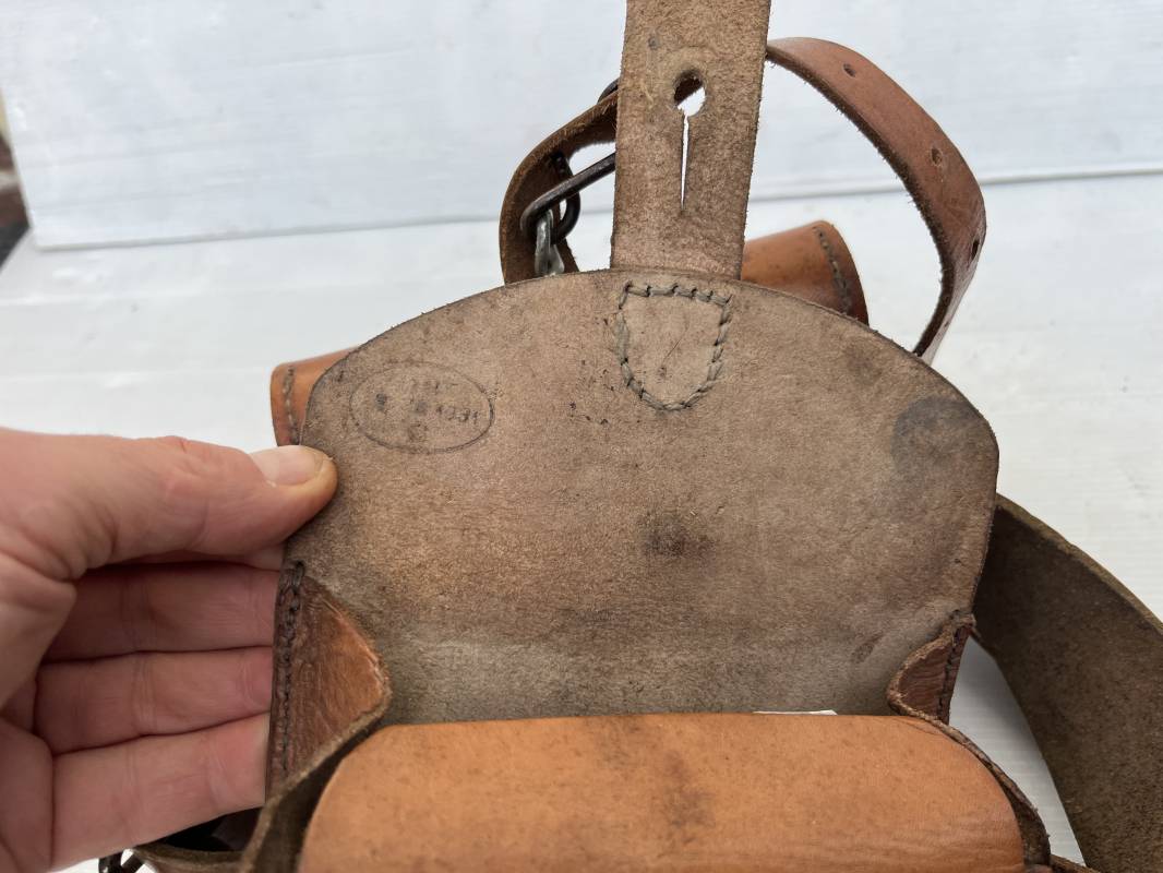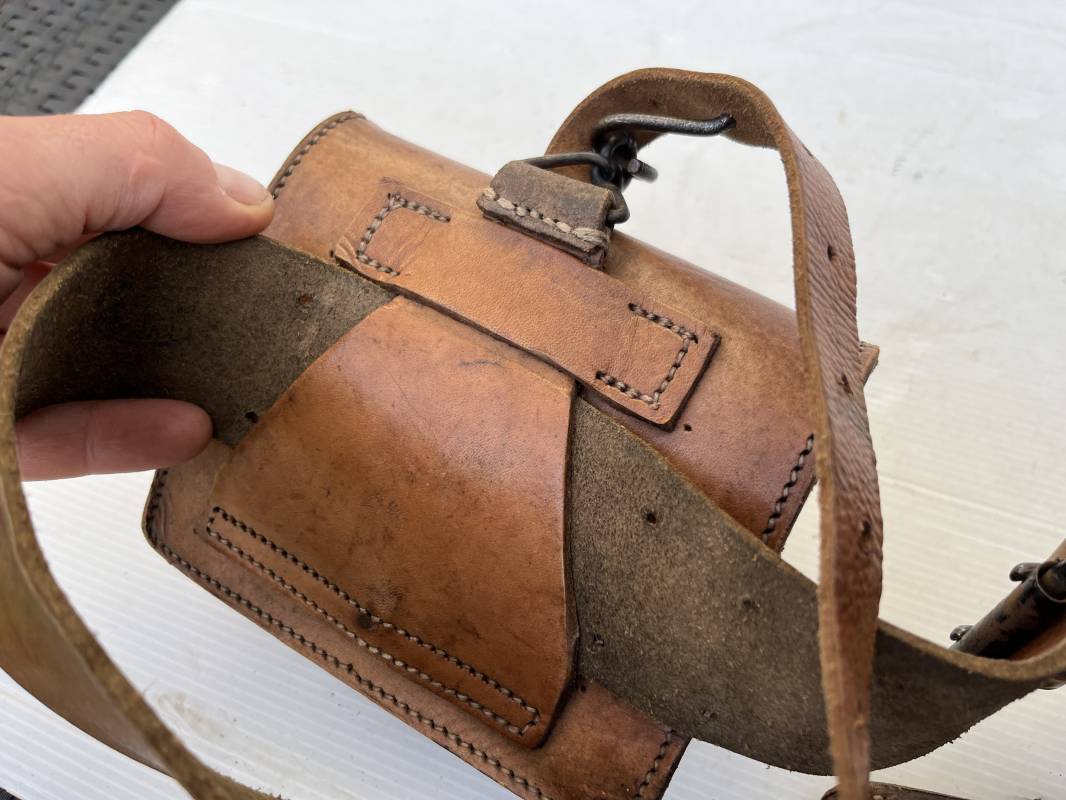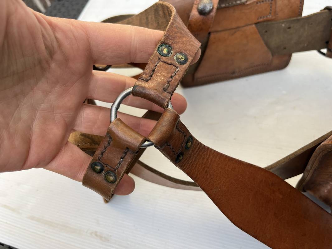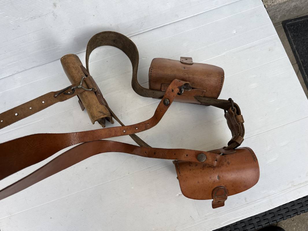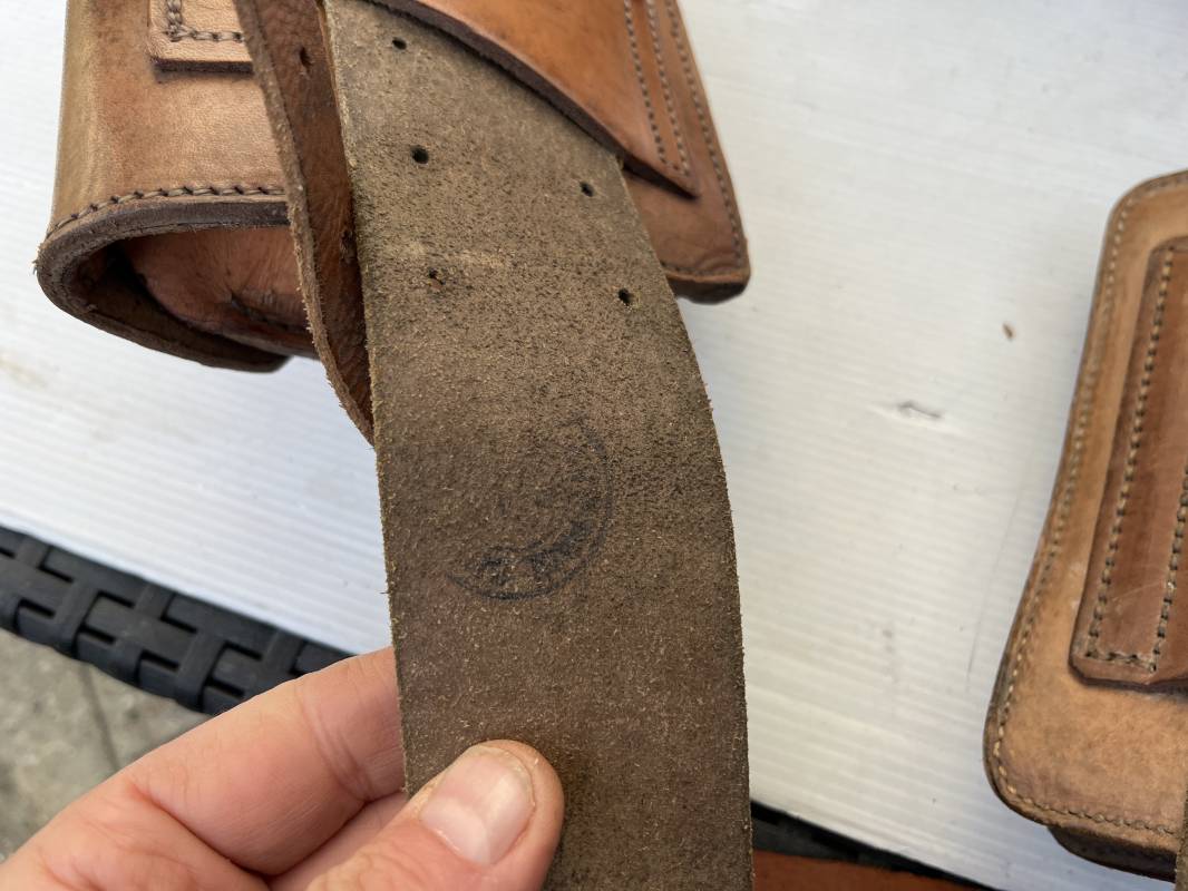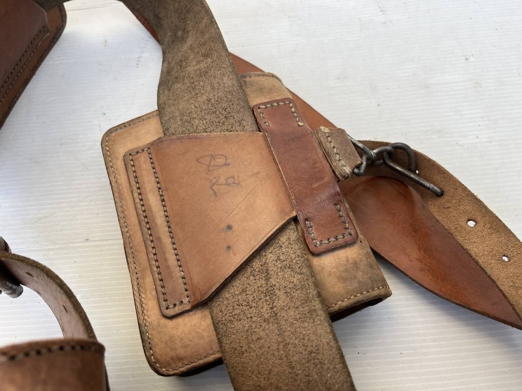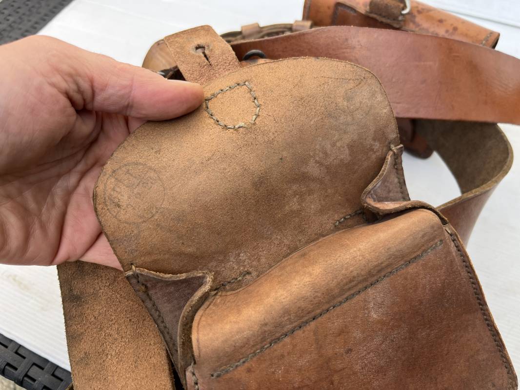 Trés beau brelage modèle 1916 en cuir marron . Ceinturon troupe modèle 1903/14 cuir souple. Longueur 115cm. Passants cuir fixe et mobile . Boucle fer peinte en noir à 2 ardillons. cuir souple , tampon encre noire rond fabricant date illisible . Trois cartouchières modèle 1916. Passants cuir de ceinturon. Crochets de suspension en fer . Marquages avec tampons oval de reception daté 1923 et 1931 . Numeros matricucles . Bretelles de suspension en cuir fauve modèle 1893/15. Fabrication rivets creux en laiton , neuf trous. Crochets de suspension métalliques . Anneau fer , tampon encre noire rond fabricant date illisible . Bel ensemble homogène, légèrement porté en trés bel état 1939/40 Ref 21703