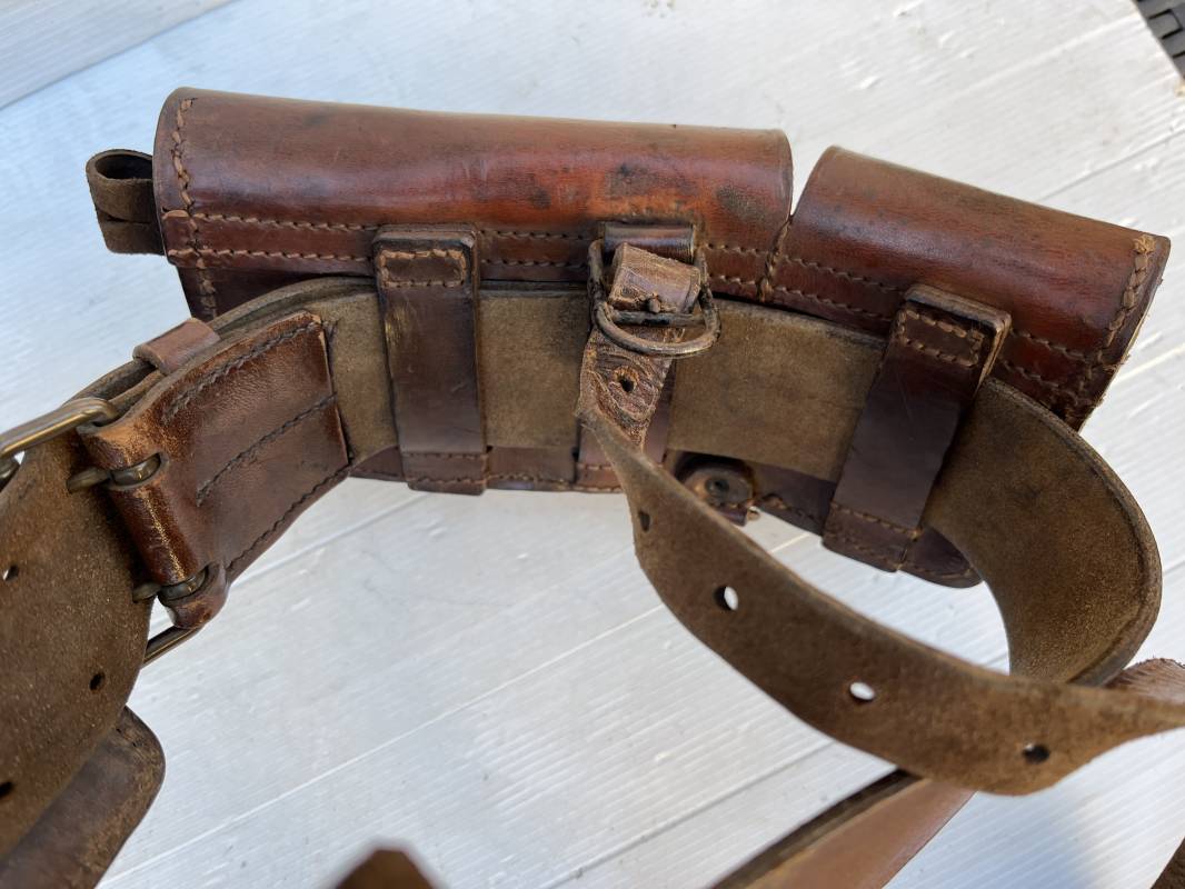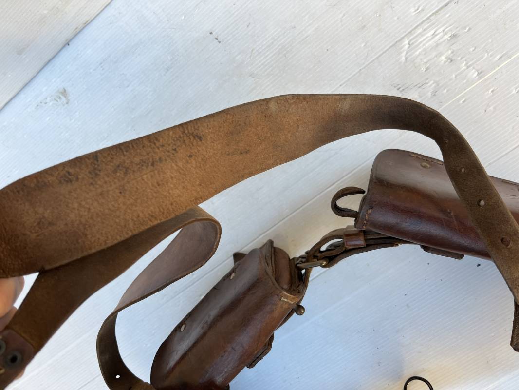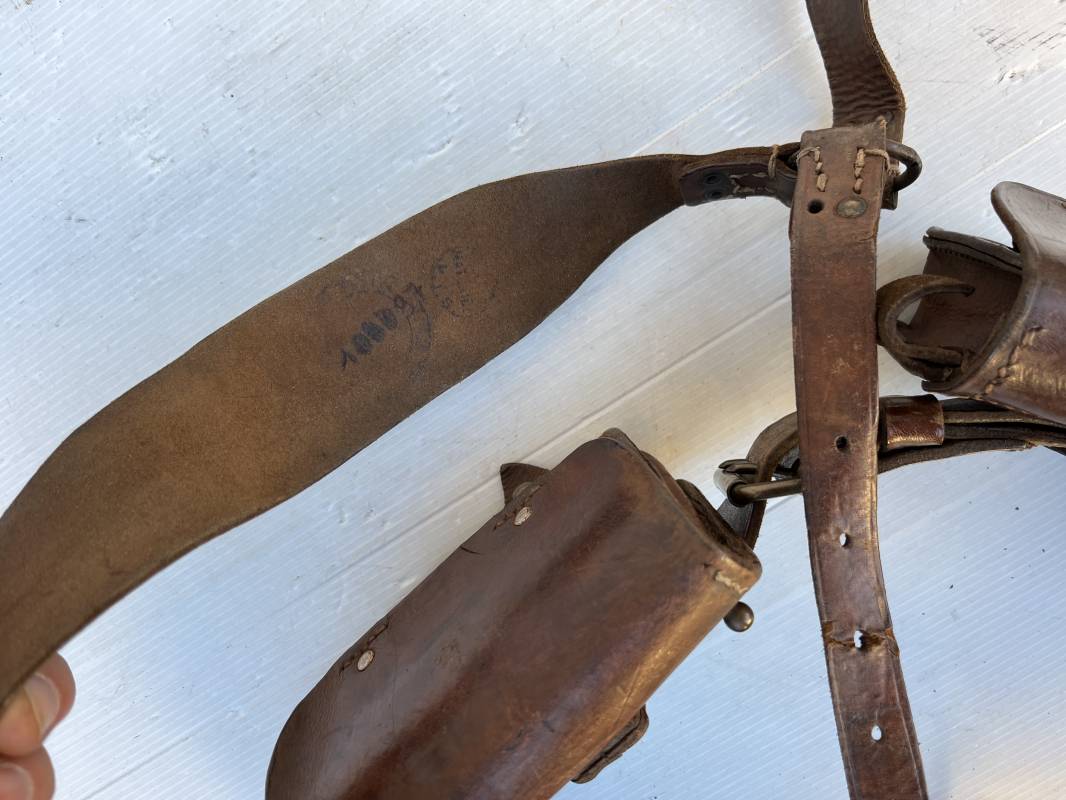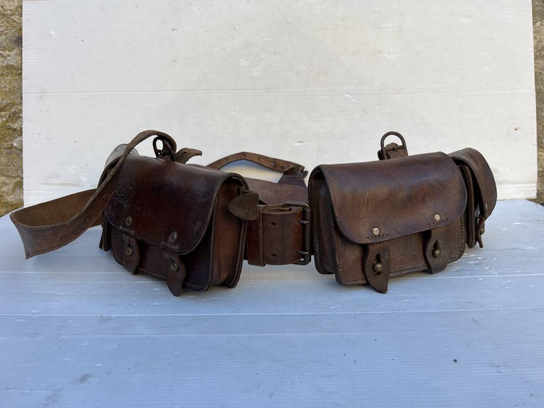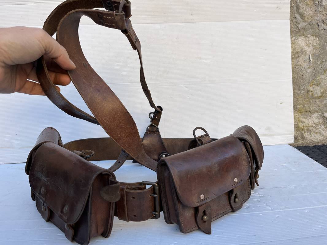 Beau brelage modèle 1938 en cuir marron . Paire de cartouchières modèle 1938 marquages encre sous les rabats mais illisibles . Passants cuir de ceinturon. Anneaux et crochets de fixation des équipements. Ceinturon troupe modèle 1903/14 en cuir marron . Boucle en laiton à deux ardillons. Passant cuir fixe, longueur 115cm . Triangle dorsal modèle 1935 avec anneaux et crochets métalliques. Bretelles de suspension modèle 1893/15 en cuir marron . Rivets métalliques creux et cousus , anneau en fer. Tampon rond de fabricant et gros chiffres matricule a l encre . Neuf trous, crochet fer de suspension, cuir souple. Brelage porté en bel état . Patine et couleur de cuir homogène 1938/40. Bel équipement de combat pour Fantassin Français en 1939/40 . Ref 19917