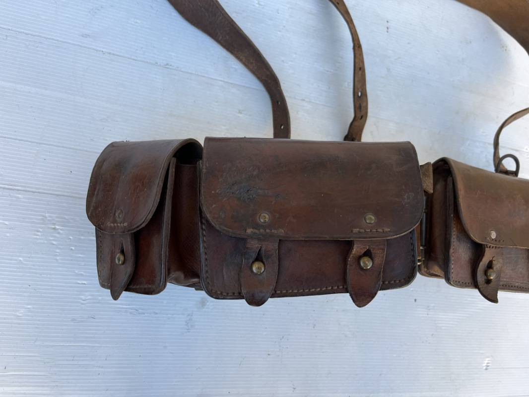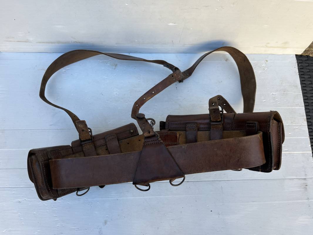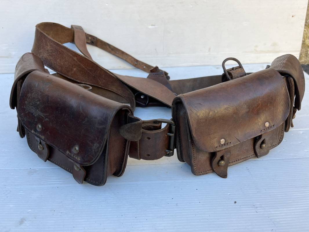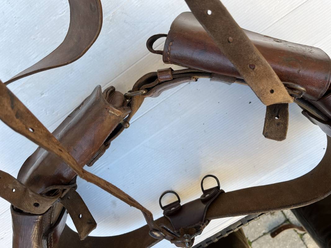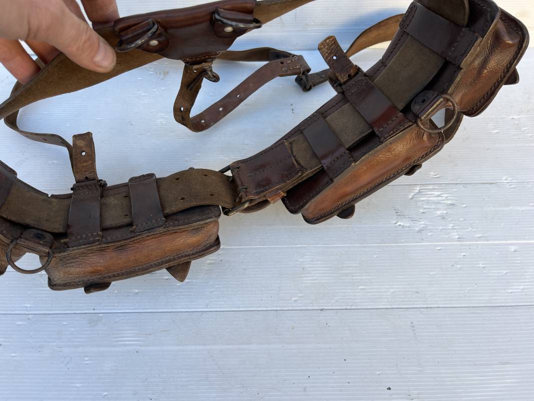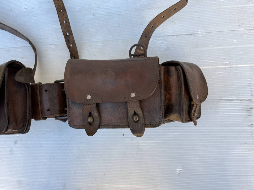 Beau brelage modèle 1938 en cuir marron . Paire de cartouchières modèle 1938 marquages encre sous les rabats mais illisibles . Passants cuir de ceinturon. Anneaux et crochets de fixation des équipements. Ceinturon troupe modèle 1903/14 en cuir marron . Boucle en laiton à deux ardillons. Passant cuir fixe, longueur 115cm . Triangle dorsal modèle 1935 avec anneaux et crochets métalliques. Bretelles de suspension modèle 1893/15 en cuir marron . Rivets métalliques creux et cousus , anneau en fer. Tampon rond de fabricant et gros chiffres matricule a l encre . Neuf trous, crochet fer de suspension, cuir souple. Brelage porté en bel état . Patine et couleur de cuir homogène 1938/40. Bel équipement de combat pour Fantassin Français en 1939/40 . Ref 19917