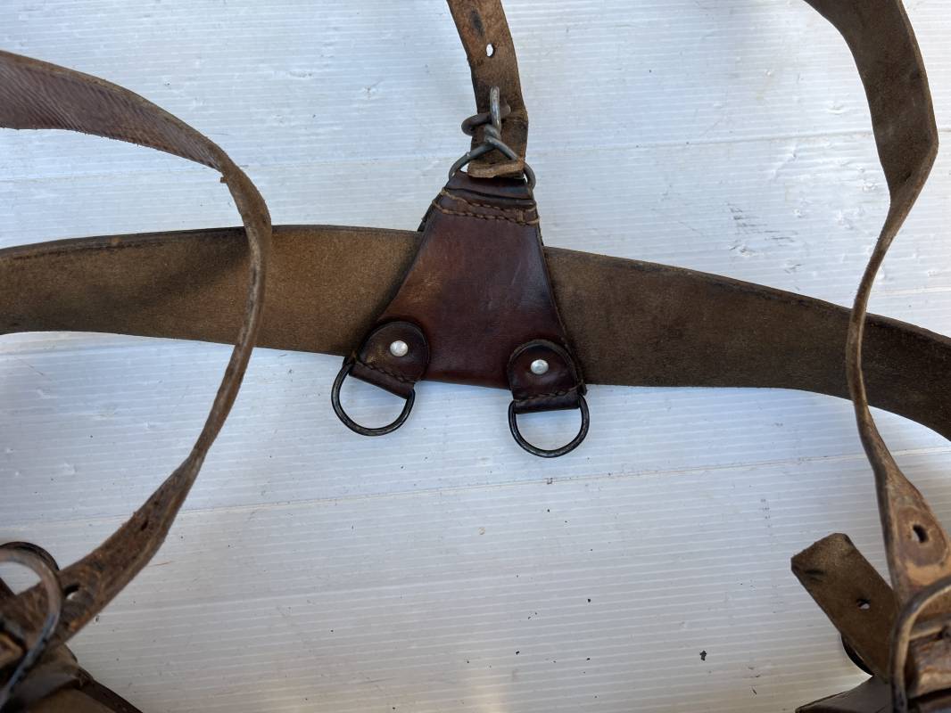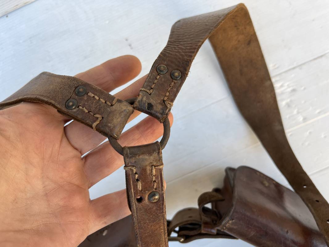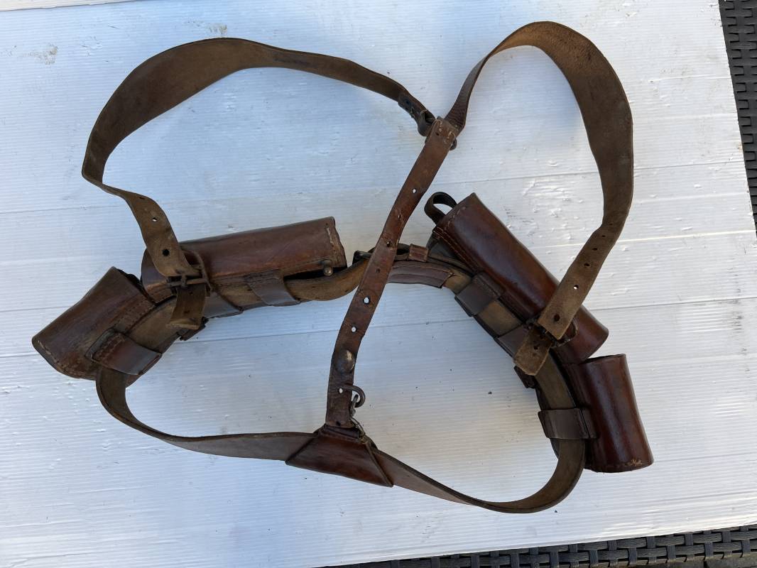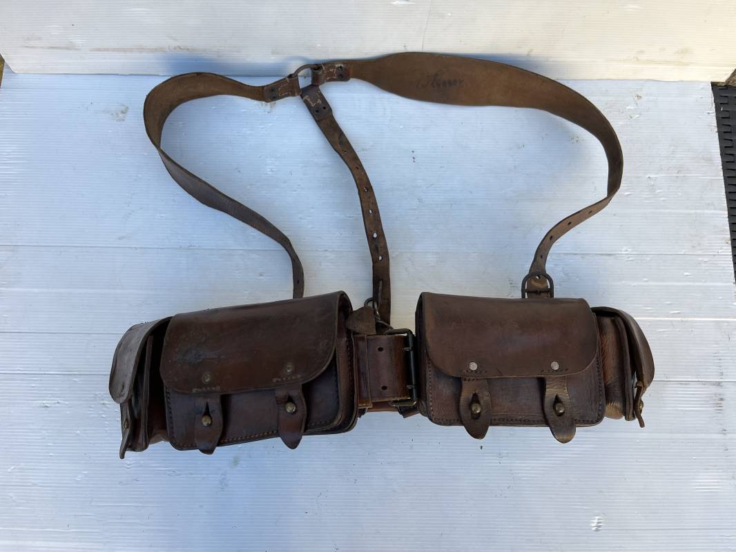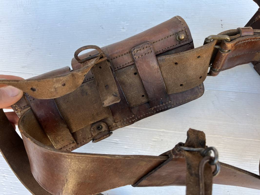 Beau brelage modèle 1938 en cuir marron . Paire de cartouchières modèle 1938 marquages encre sous les rabats mais illisibles . Passants cuir de ceinturon. Anneaux et crochets de fixation des équipements. Ceinturon troupe modèle 1903/14 en cuir marron . Boucle en laiton à deux ardillons. Passant cuir fixe, longueur 115cm . Triangle dorsal modèle 1935 avec anneaux et crochets métalliques. Bretelles de suspension modèle 1893/15 en cuir marron . Rivets métalliques creux et cousus , anneau en fer. Tampon rond de fabricant et gros chiffres matricule a l encre . Neuf trous, crochet fer de suspension, cuir souple. Brelage porté en bel état . Patine et couleur de cuir homogène 1938/40. Bel équipement de combat pour Fantassin Français en 1939/40 . Ref 19917