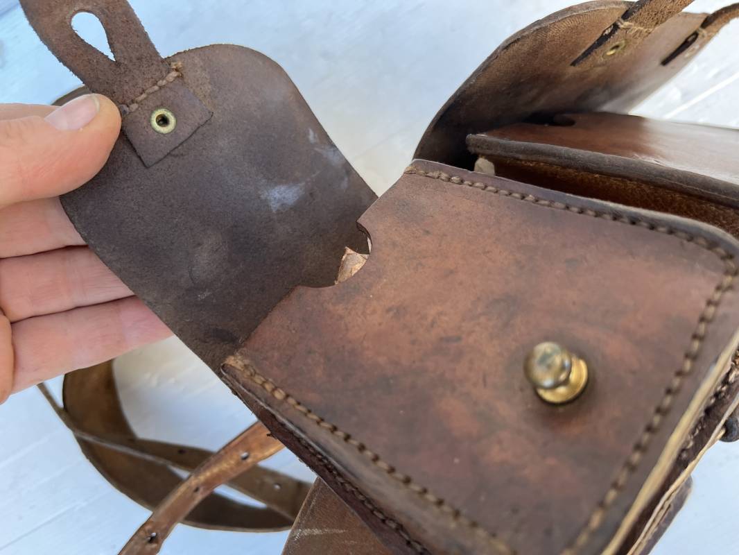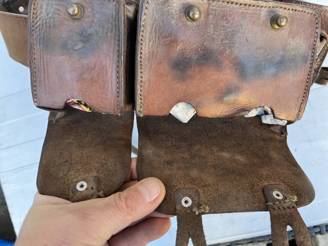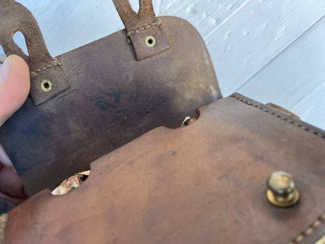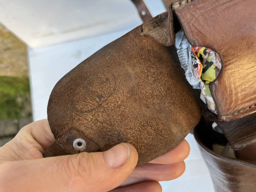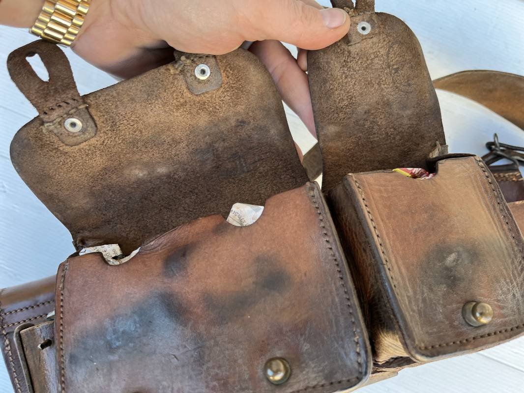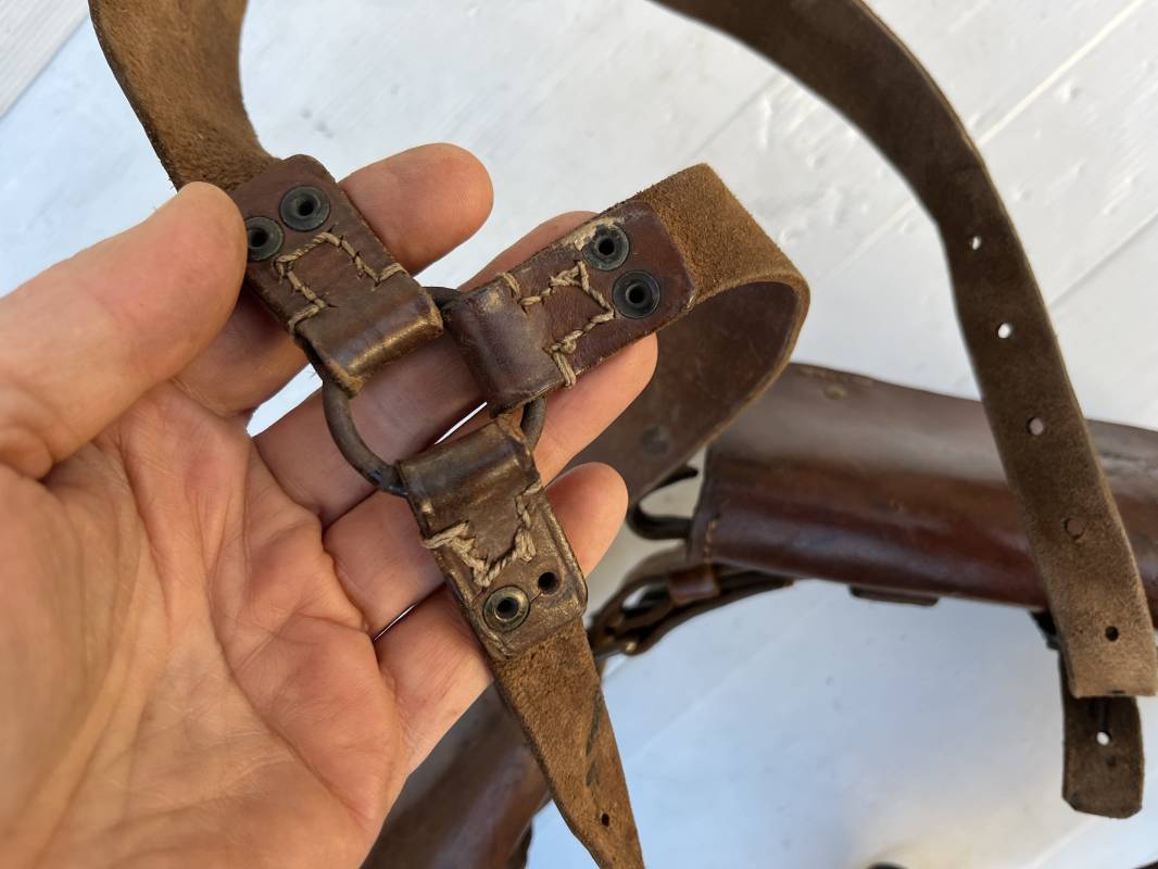 Beau brelage modèle 1938 en cuir marron . Paire de cartouchières modèle 1938 marquages encre sous les rabats mais illisibles . Passants cuir de ceinturon. Anneaux et crochets de fixation des équipements. Ceinturon troupe modèle 1903/14 en cuir marron . Boucle en laiton à deux ardillons. Passant cuir fixe, longueur 115cm . Triangle dorsal modèle 1935 avec anneaux et crochets métalliques. Bretelles de suspension modèle 1893/15 en cuir marron . Rivets métalliques creux et cousus , anneau en fer. Tampon rond de fabricant et gros chiffres matricule a l encre . Neuf trous, crochet fer de suspension, cuir souple. Brelage porté en bel état . Patine et couleur de cuir homogène 1938/40. Bel équipement de combat pour Fantassin Français en 1939/40 . Ref 19917
