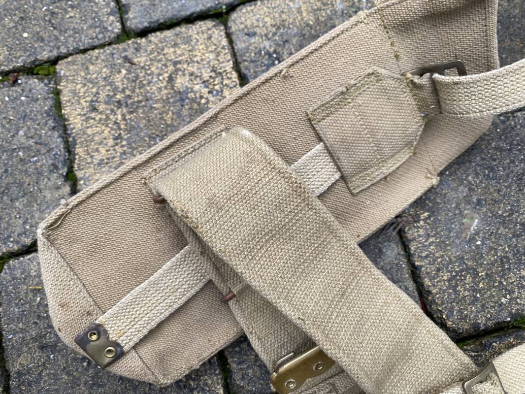 Très beau brelage Anglais Pattern 1937 en coton filé beige. Brelage en web. Ceinturon avec boucle et passants laiton. Marquage Broad Arrow code 138. Paire de cartouchières "Pouchs" MKIII datées 42/43. Bretelles de suspension datés 1943. Gourde Pattern 37 avec bidon émaillé vert, housse kakie, bouchon et ficelle. Très bel ensemble homogène. Légèrement porté en parfait état 1942/45. Ref 16321