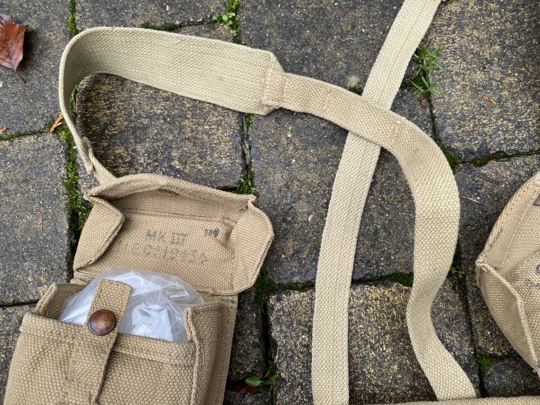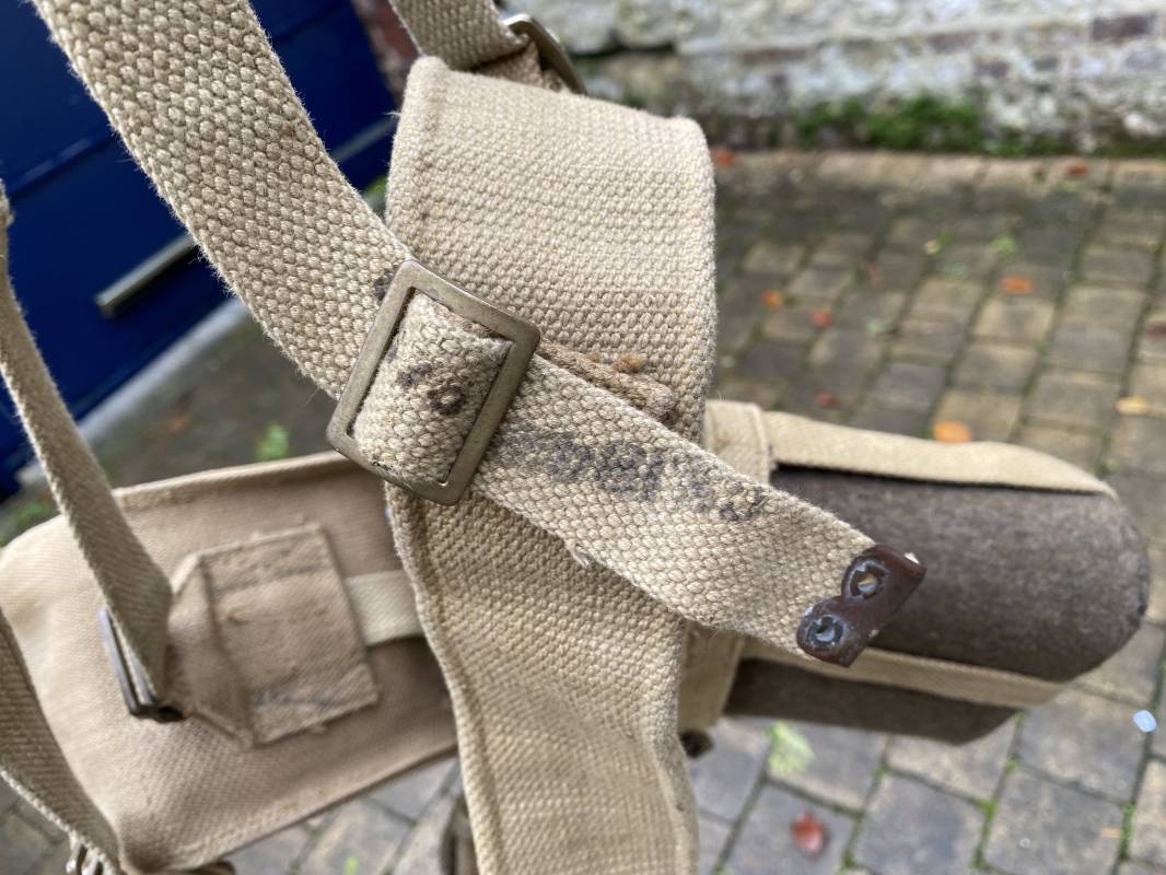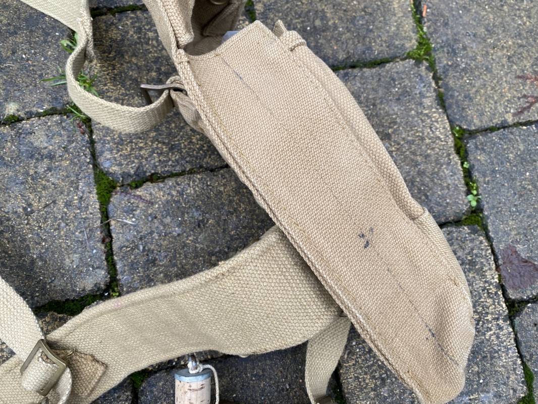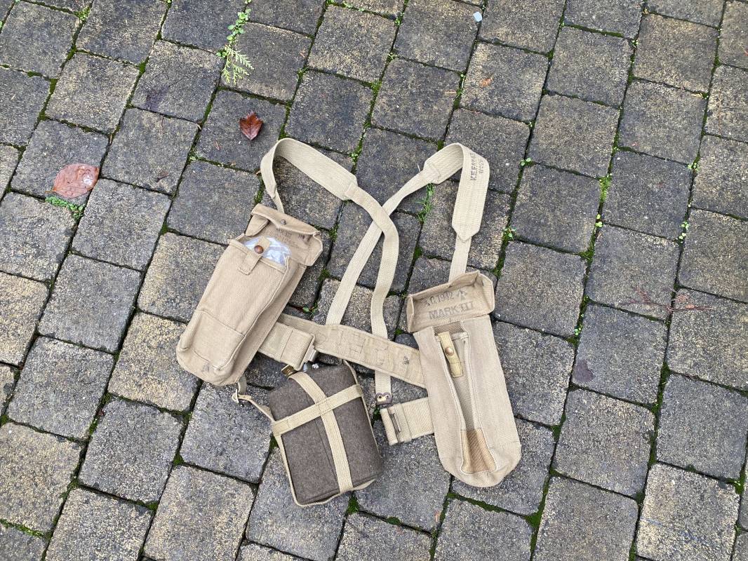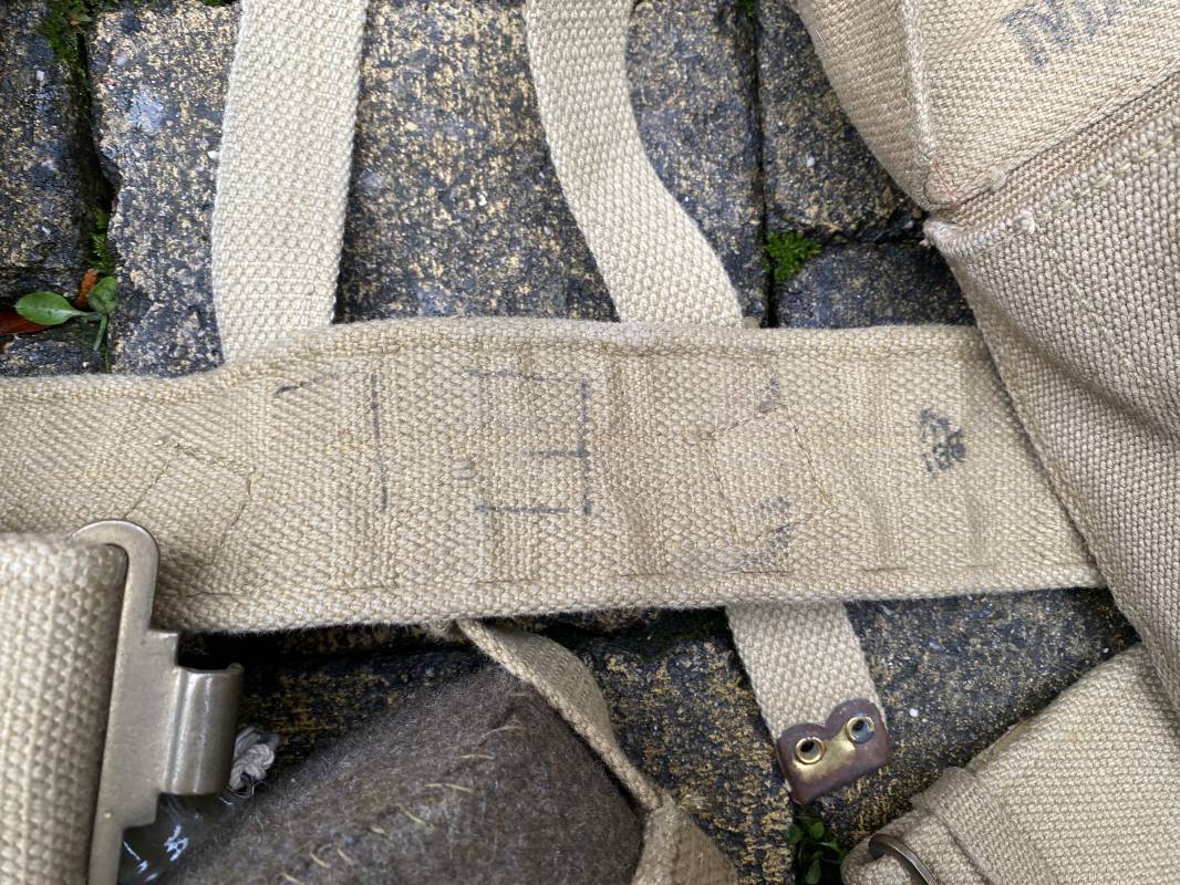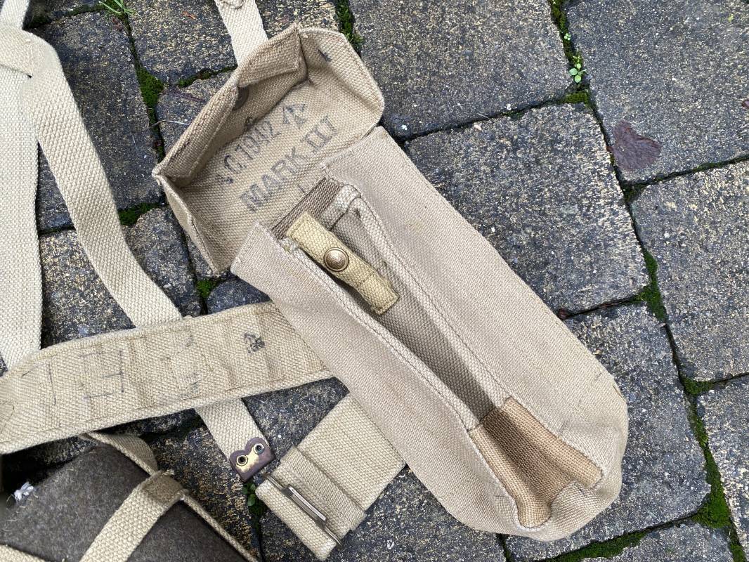 Très beau brelage Anglais Pattern 1937 en coton filé beige. Brelage en web. Ceinturon avec boucle et passants laiton. Marquage Broad Arrow code 138. Paire de cartouchières "Pouchs" MKIII datées 42/43. Bretelles de suspension datés 1943. Gourde Pattern 37 avec bidon émaillé vert, housse kakie, bouchon et ficelle. Très bel ensemble homogène. Légèrement porté en parfait état 1942/45. Ref 16321