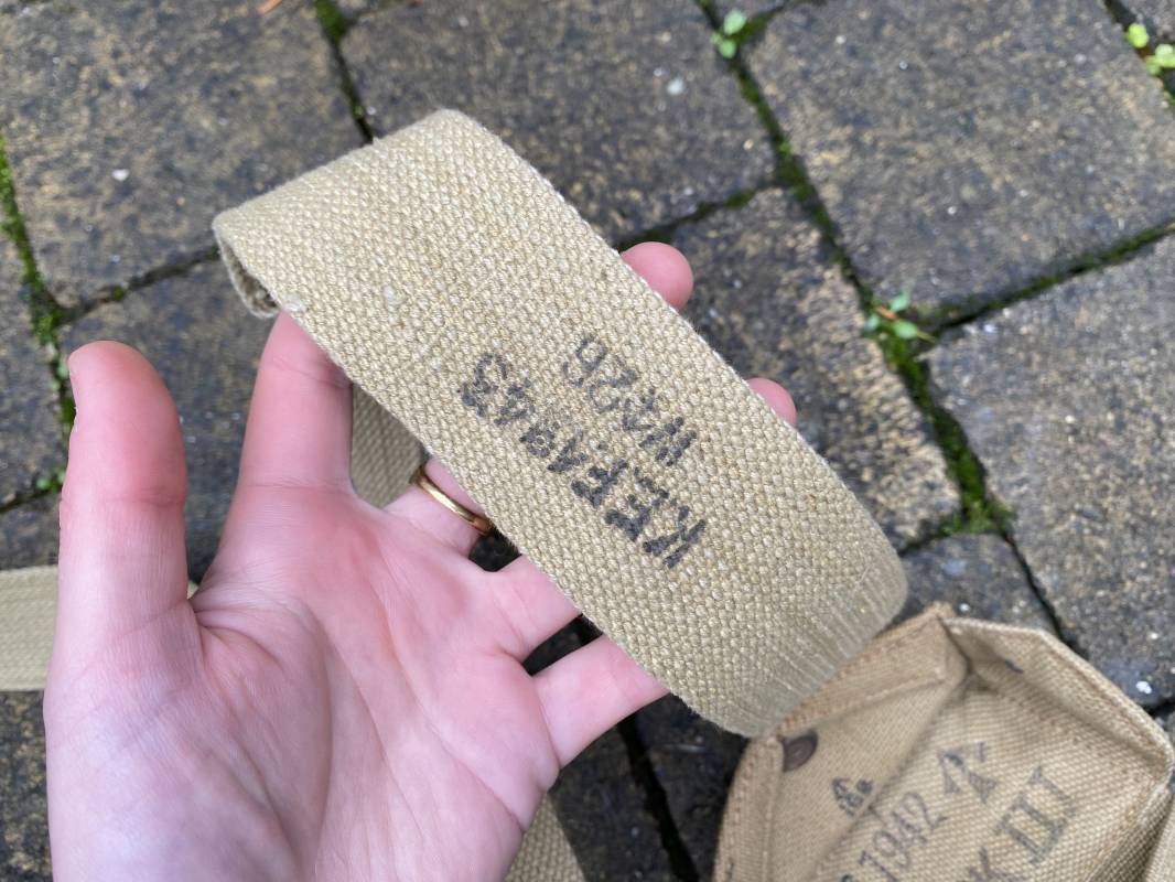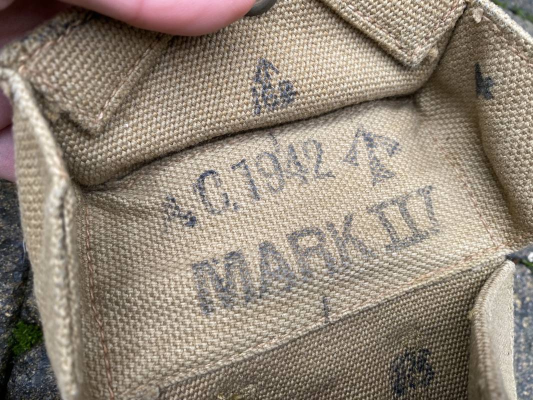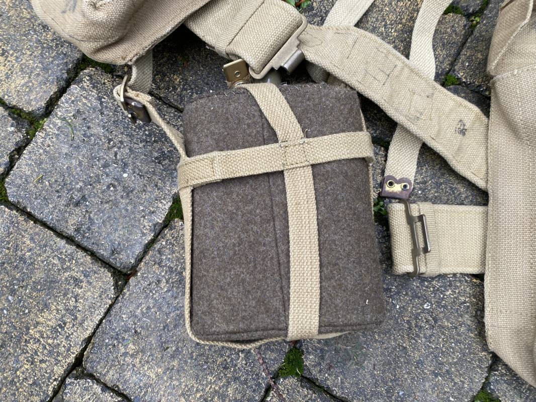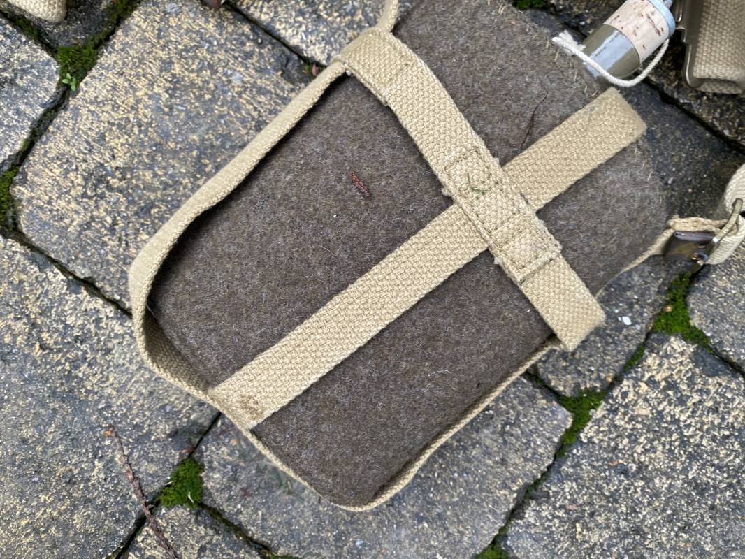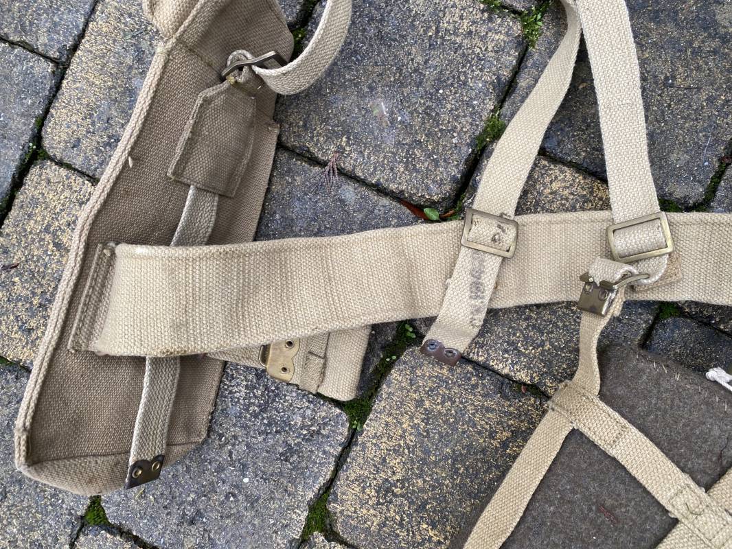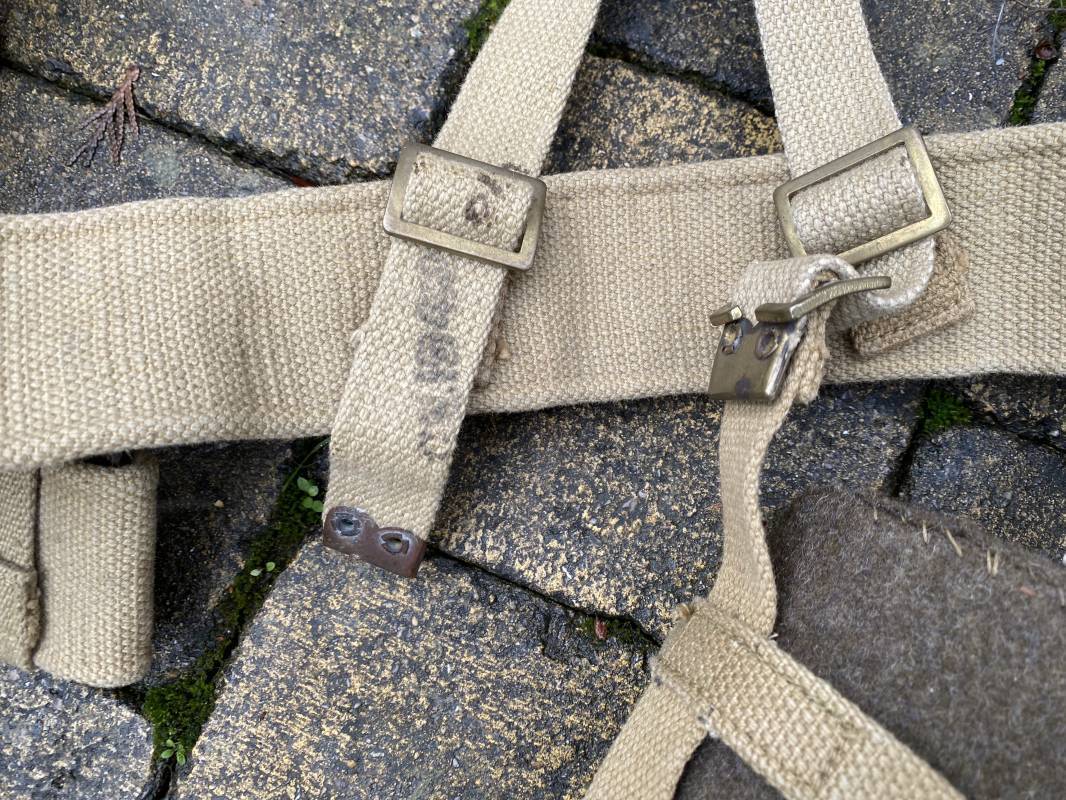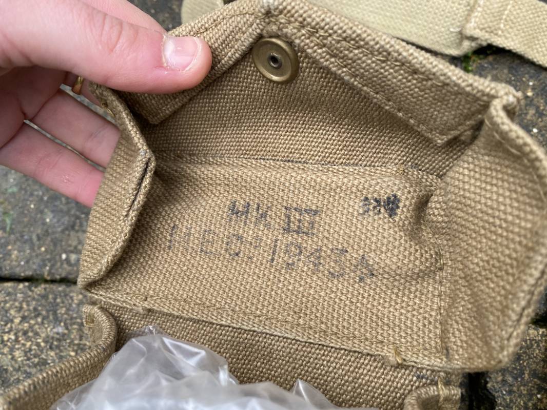 Très beau brelage Anglais Pattern 1937 en coton filé beige. Brelage en web. Ceinturon avec boucle et passants laiton. Marquage Broad Arrow code 138. Paire de cartouchières "Pouchs" MKIII datées 42/43. Bretelles de suspension datés 1943. Gourde Pattern 37 avec bidon émaillé vert, housse kakie, bouchon et ficelle. Très bel ensemble homogène. Légèrement porté en parfait état 1942/45. Ref 16321