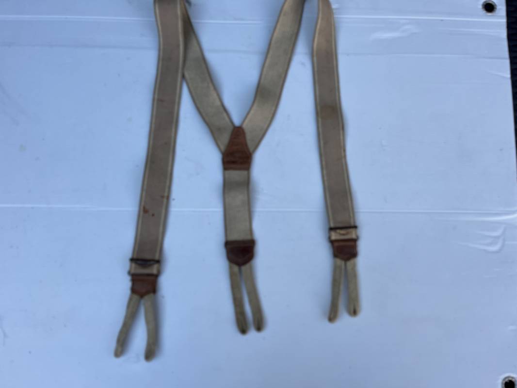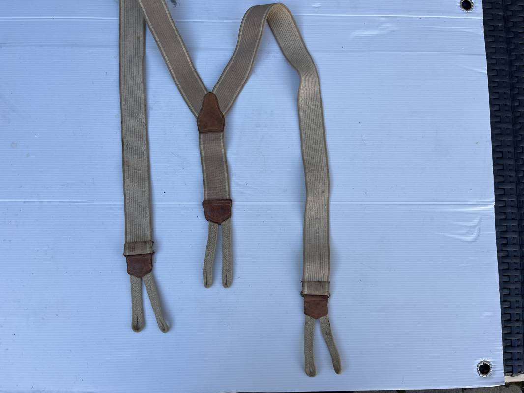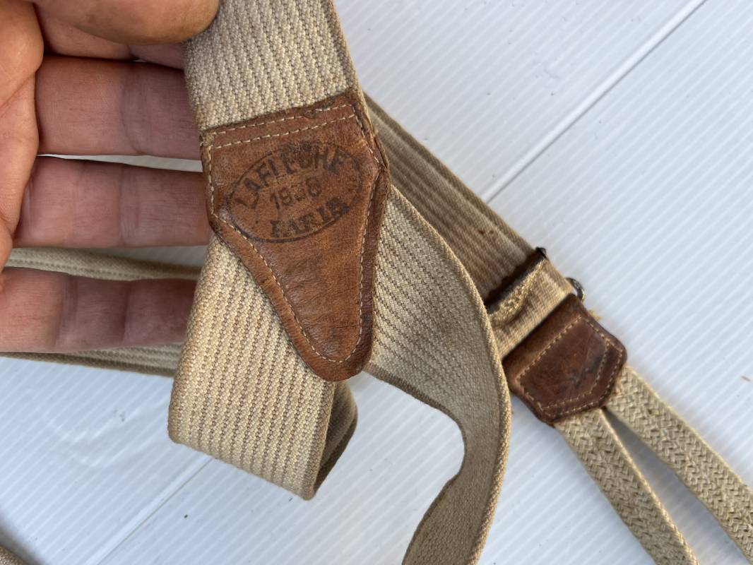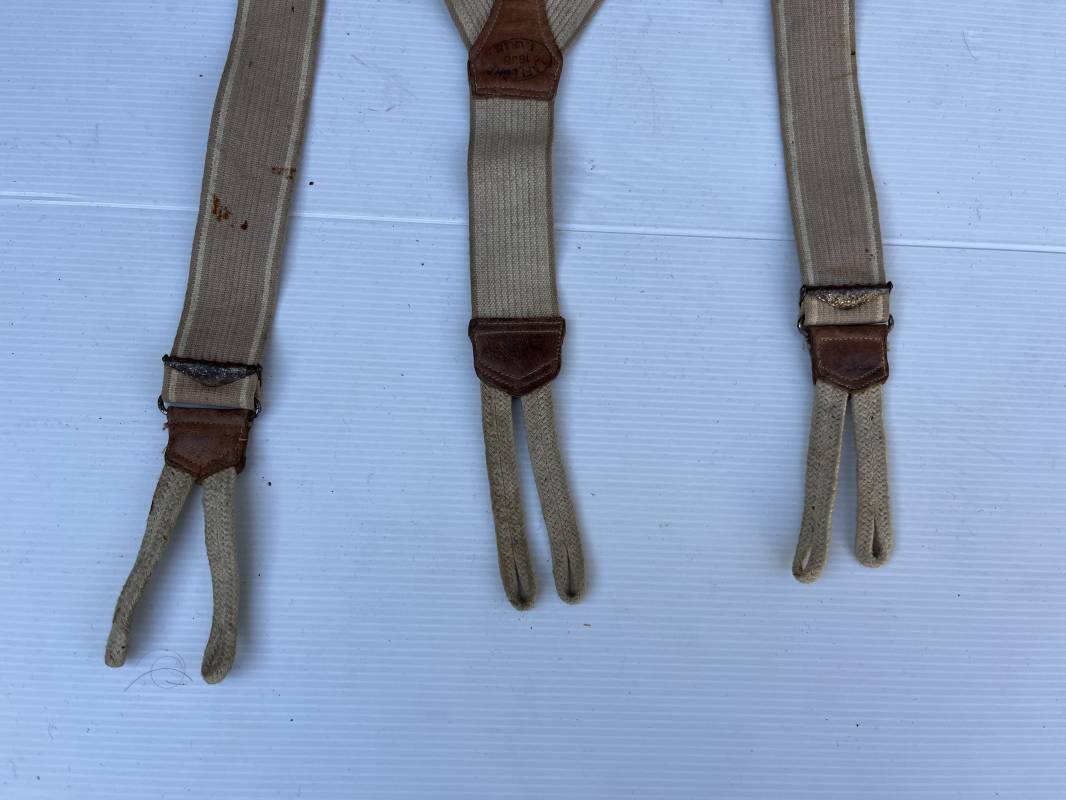 Trés belle paire de bretelles réglementaires de culotte troupe . Modele 1922 . Toile élastique beige clair et liserés blancs sur les cotés . Boucles de réglage en fer nickelé . Plastron de renfort en cuir avec marquage fabricant Paris 1938 . Boutonnières en coton tressé . Légérement porté en parfait état . Ref 21909