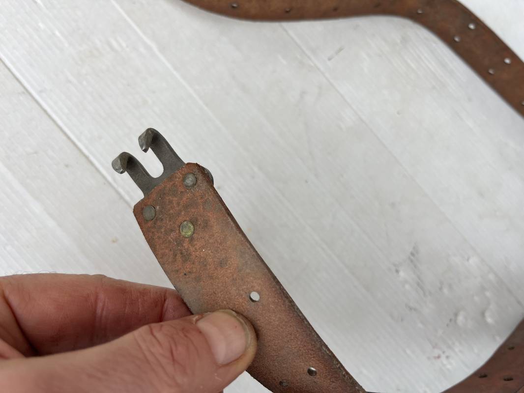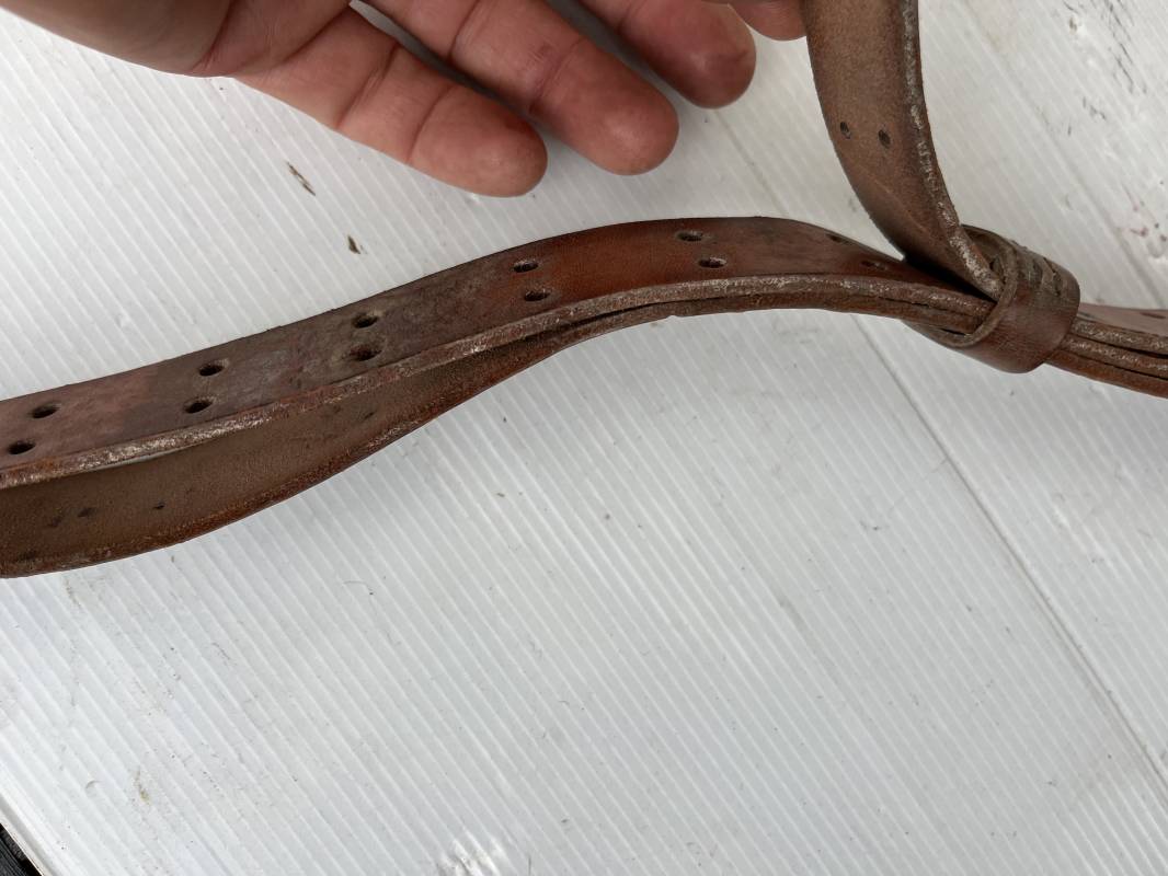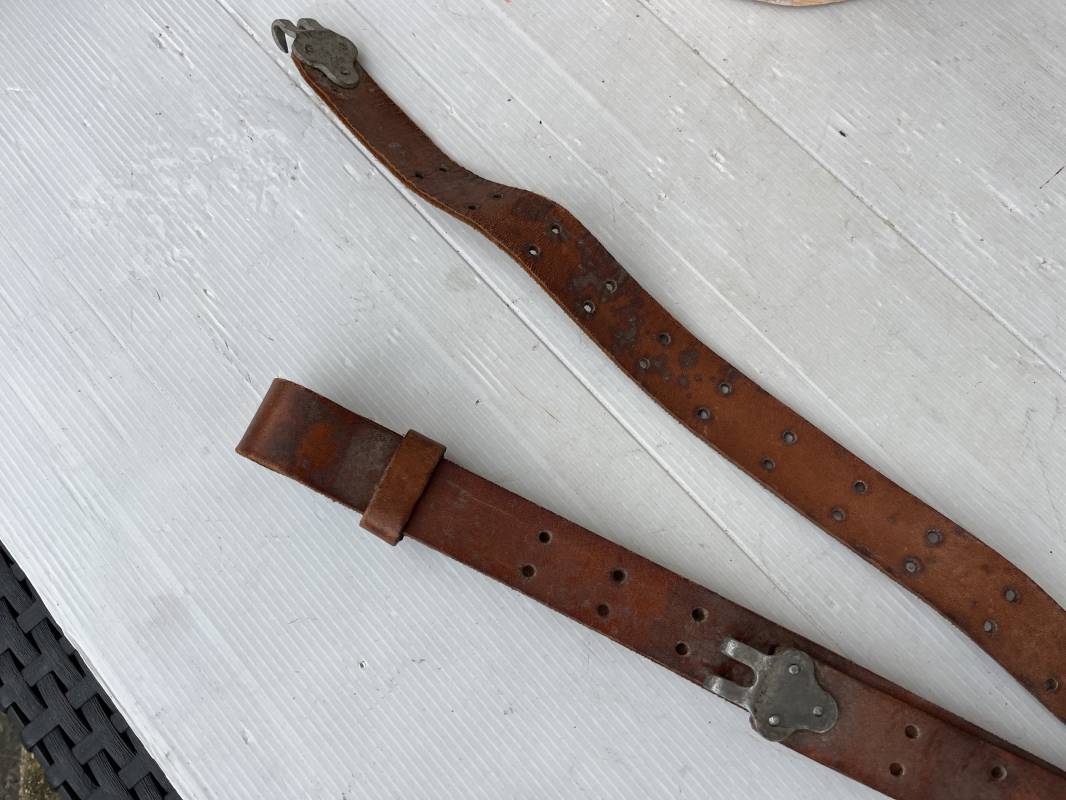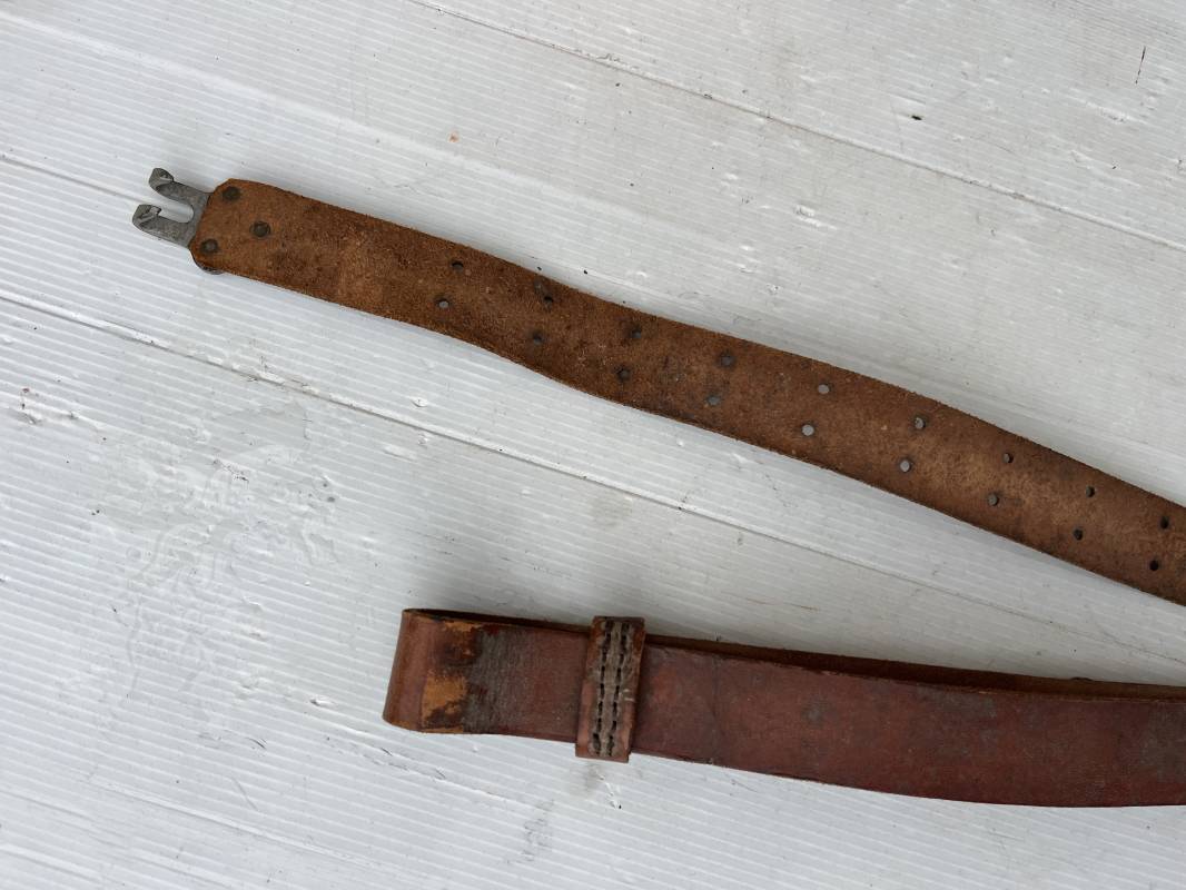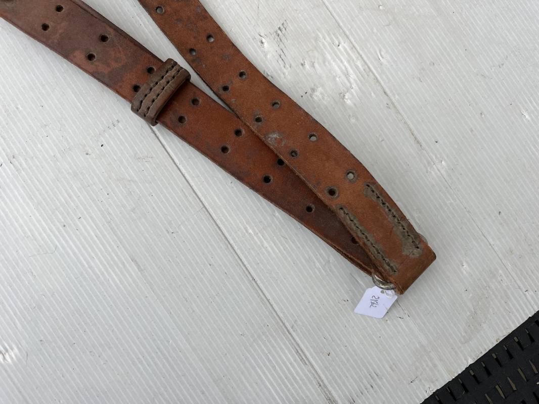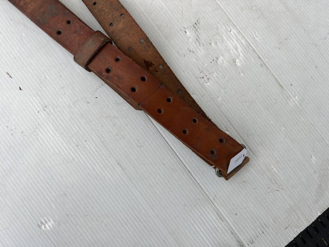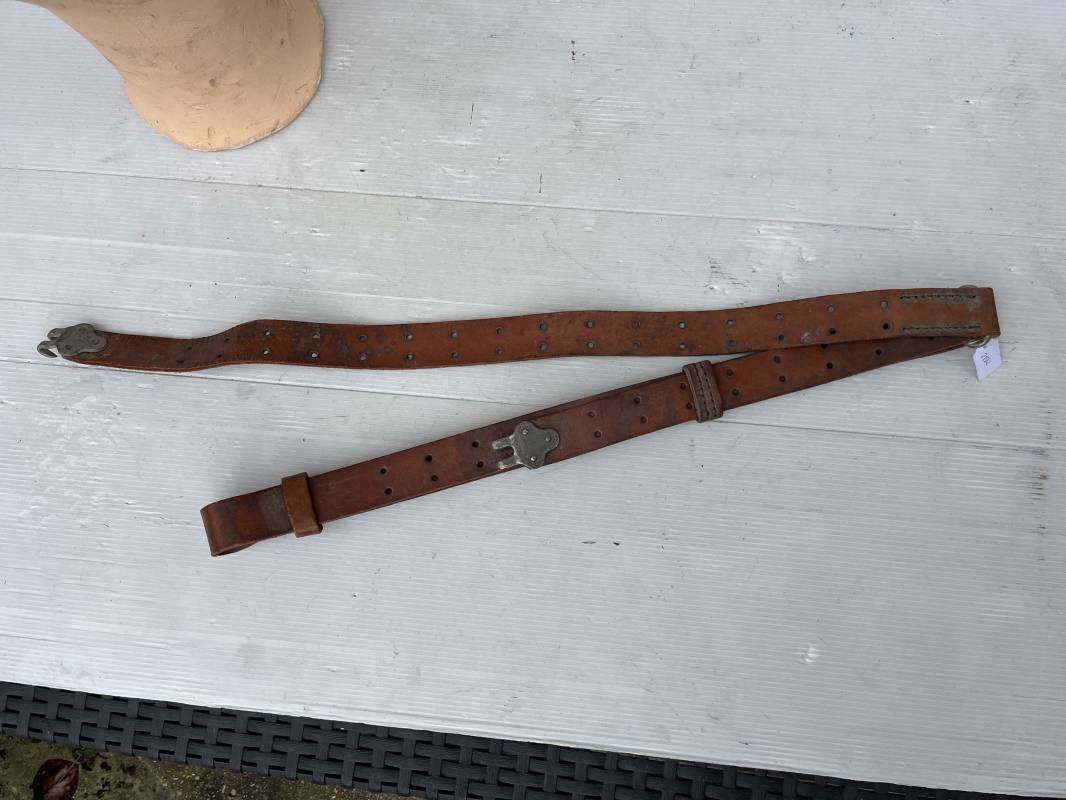 Trés belle bretelle pour le port du fusil ou fusil mitrailleur . Bretelle de dotation en cuir marron . Crochets en fer pour le réglage . Passants en cuir Cuir souple , jamais ciré ni graissé . Parfait état Ref 21562