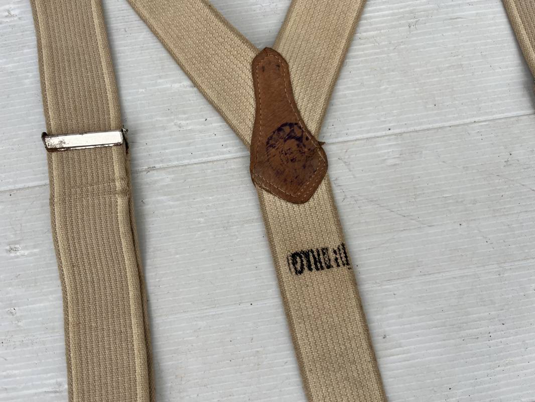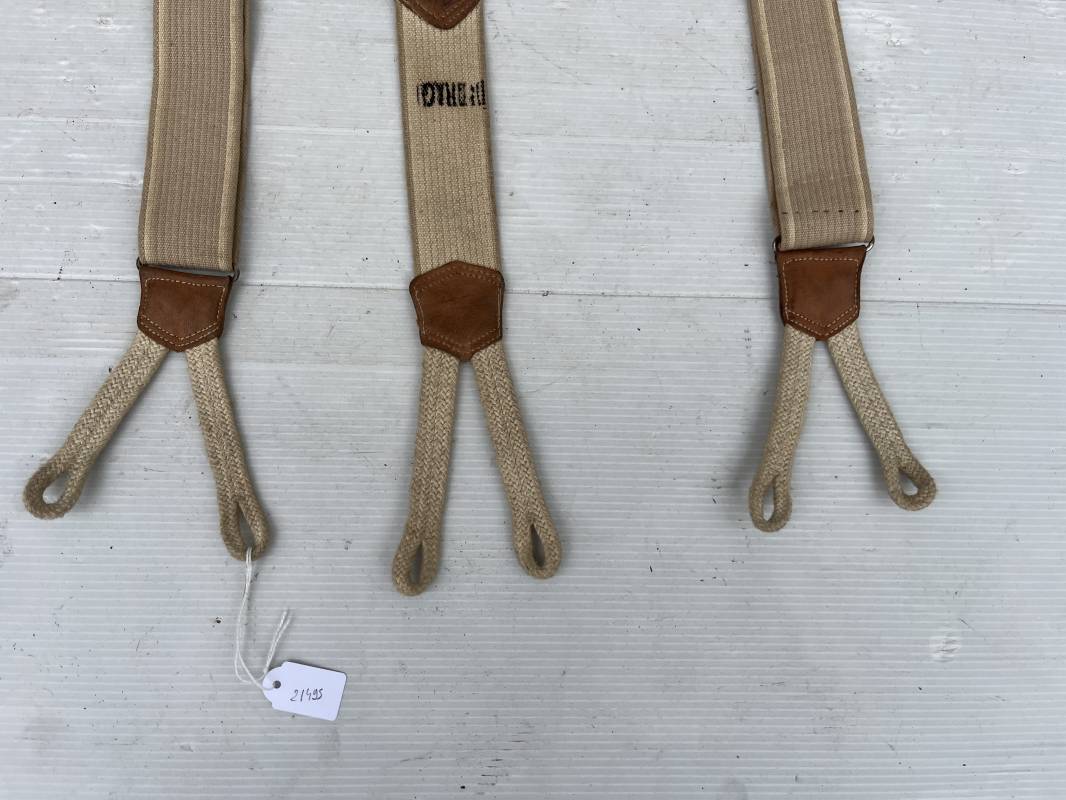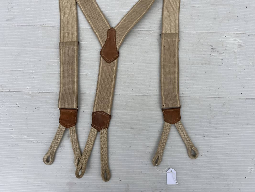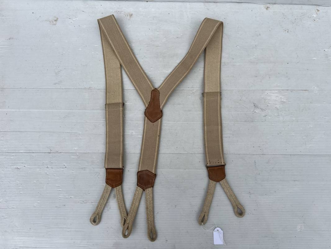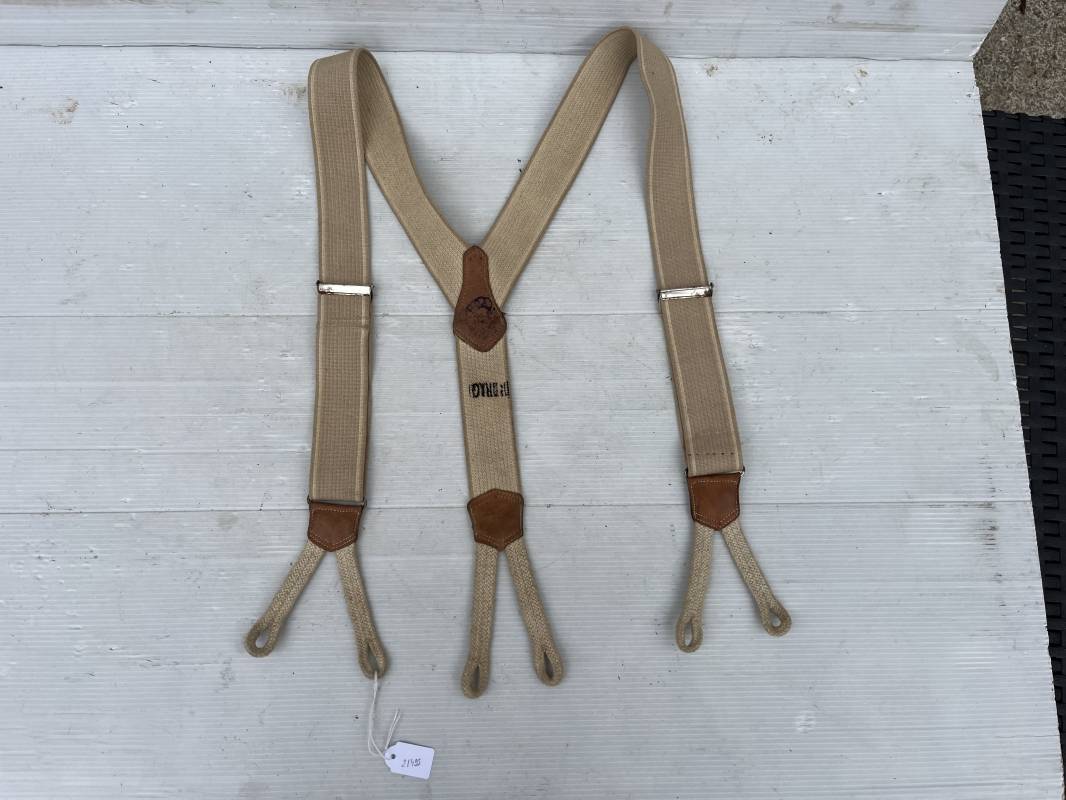 Trés belle paire de bretelles de culotte Mdle 1922 reglementaires . Bretelles en toile élastique de couleur marron clair et blanc . Renforts en cuir . Passants boutonnières en coton . Boucles métalliques de réglage .Tampon de réception au 1 er Gragons . Tampon rond fabricant avec date illisible Bretelles trés legerement portées en parfait état 1920/40 Ref 21495