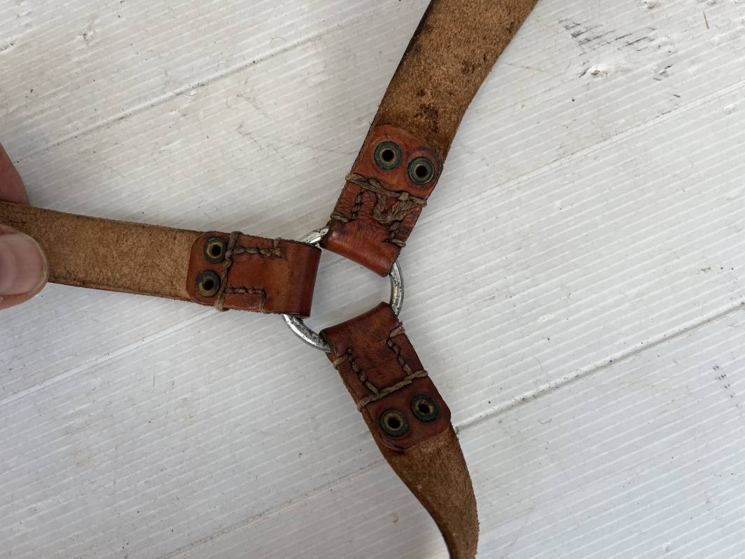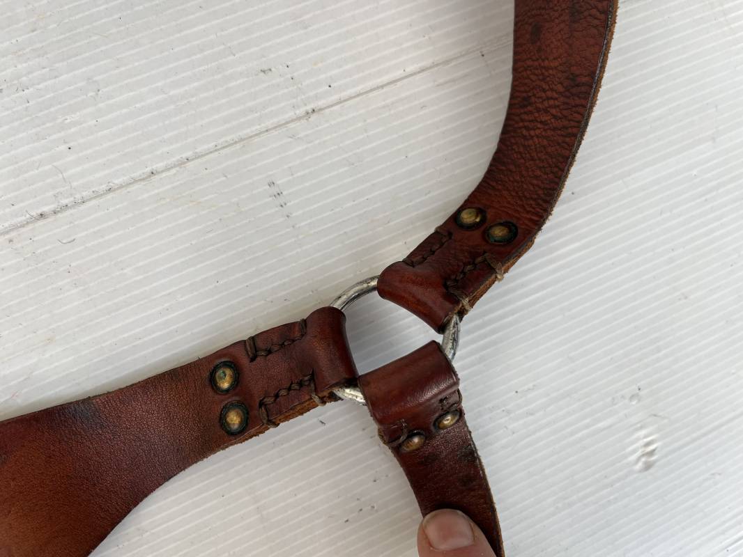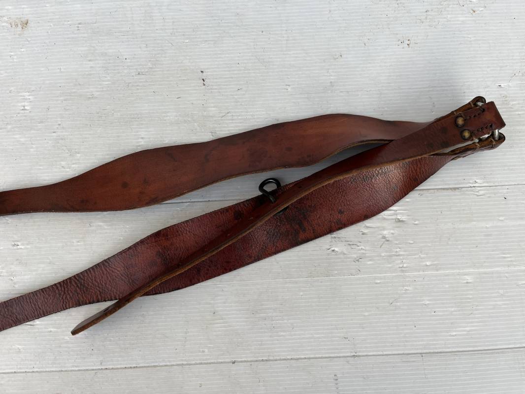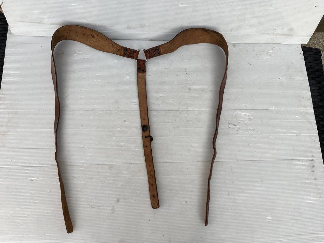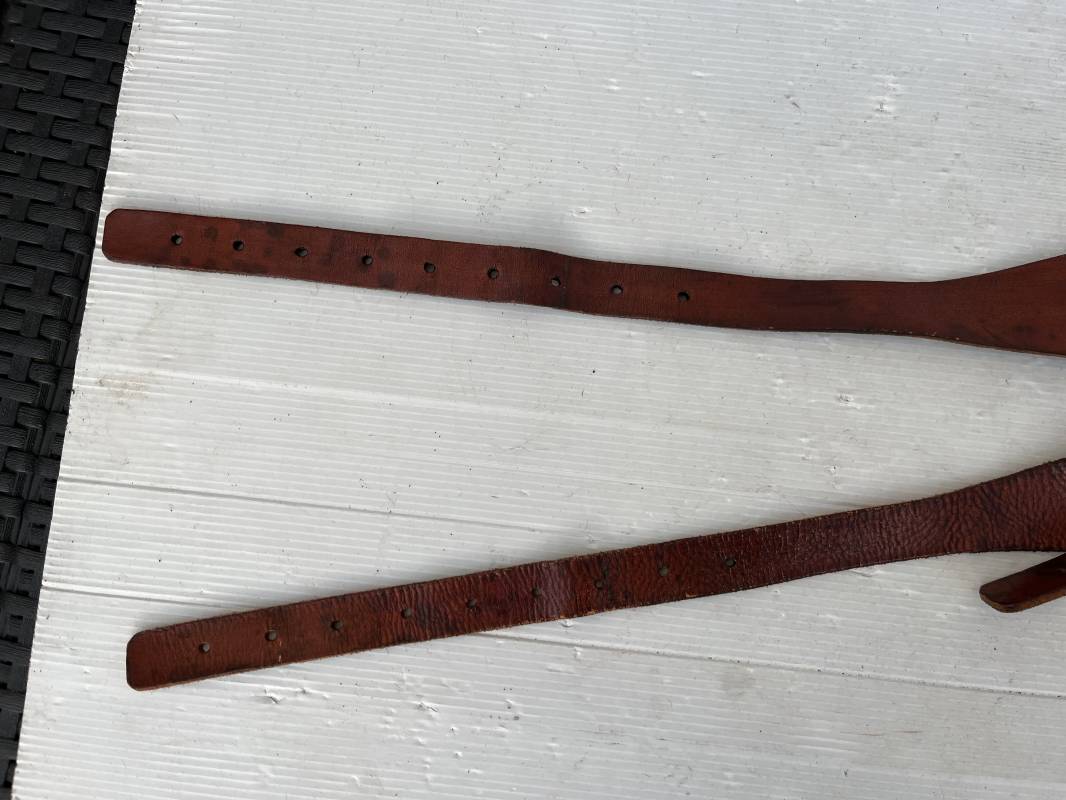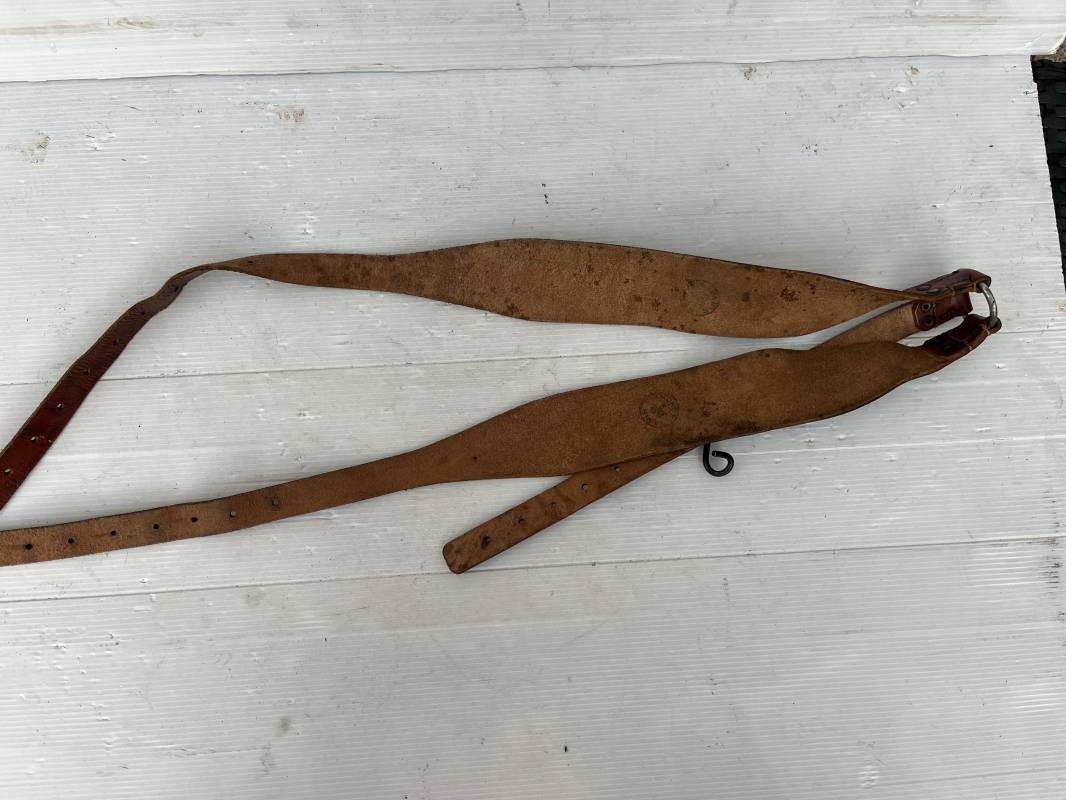 Trés bretelles de suspension modéle 1893/15 en cuir marron , tampon rond fabricant daté 1938 . Neuf trous . Anneau fer et Rivets laiton . Crochet fer de suspension peints en noir . Cuir souple ,Lègèrement porté en trés bel état . Ref 21224